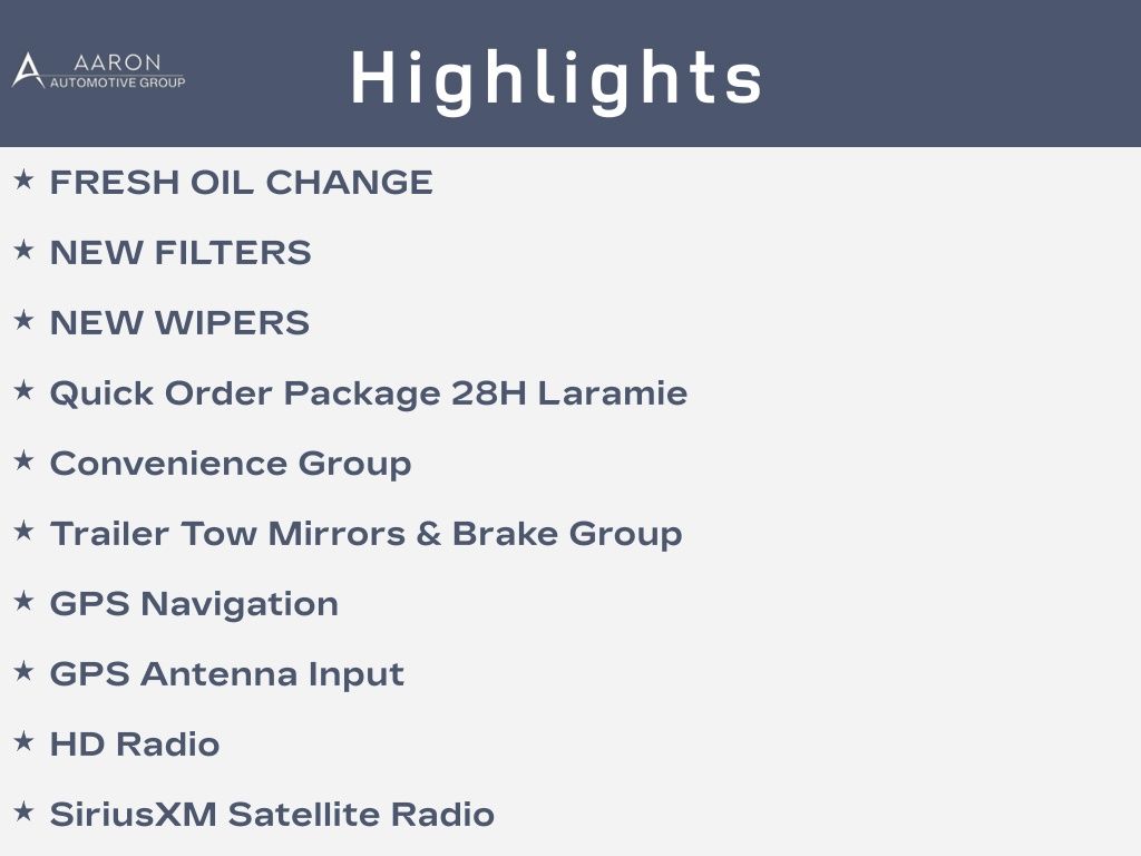 FRESH OIL CHANGE, NEW FILTERS, NEW WIPERS, 1500 Laramie, 4D Crew Cab, EcoDiesel 3.0L V6, 8-Speed Automatic, 4WD, 1-Yr SiriusXM Guardian Trial, 5-Year SiriusXM Traffic Service, 5-Year SiriusXM Travel Link Service, 8.4" Touchscreen Display, Apple CarPlay, Audio Jack Input for Mobile Devices, Auto High Beam Headlamp Control, Convenience Group, Dual front side impact airbags, Front dual zone A/C, Front fog lights, Google Android Auto, GPS Antenna Input, GPS Navigation, HD Radio, Integrated Voice Command w/Bluetooth, Keyless Enter-N-Go, Media Hub (2 USB, AUX), Memory seat, Overhead airbag, ParkView Rear Back-Up Camera, Power Chrome Trailer Tow Mirrors, Quick Order Package 28H Laramie, Radio: Uconnect 4C Nav w/8.4" Display, Rain Sensitive Windshield Wipers, Remote Proximity Keyless Entry, Remote USB Port, SiriusXM Satellite Radio, SiriusXM Traffic Plus, SiriusXM Travel Link, Trailer Brake Control, Trailer Tow Mirrors, Trailer Tow Mirrors & Brake Group, USB Host Flip.Clean CARFAX.CARFAX One-Owner.