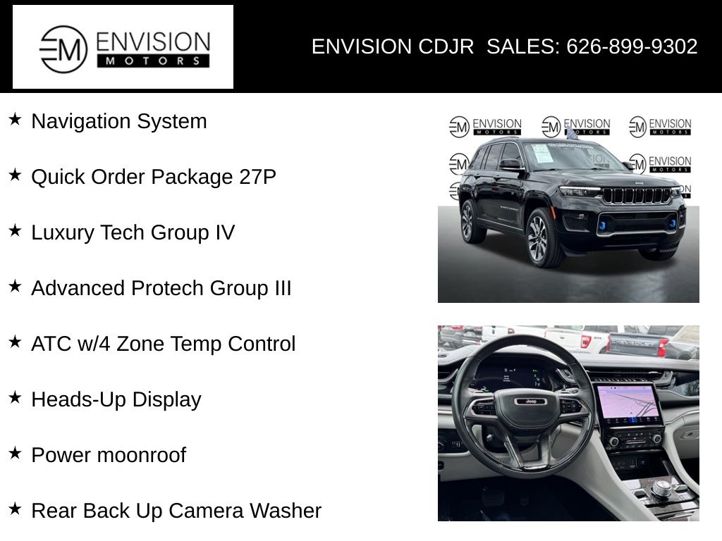WE SPECIALIZE IN ALL CREDIT PROFILES! See what we can do for you! Call to find out (626) 899-9302.Certified. CARFAX One-Owner. Clean CARFAX.2.0L I4 DOHC, 4WD, 2nd-Row Manual Window Shades, Active Driving Assist System, Advanced Protech Group III, ATC w/4 Zone Temp Control, Driver Power Seat Back Massage, Front Passenger Power Seat Back Massage, Heads-Up Display, Highway Assist System, Integrated Off-Road Camera, Intersection Collision Assist System, Luxury Tech Group IV, Map-In-Cluster Display, Nappa Leather Seats (TL), Navigation System, Night Vision/Pedestrian-Animal Detection, Passenger Seat Memory, Power Adjust 12-Way Driver Seat, Power Adjust 12-Way Front Passenger Seat, Power moonroof, Quick Order Package 27P, Rear Back Up Camera Washer, Rearview Autodim Digital Display Mirror, Surround View Camera System, Wheels: 20" x 8.5" Machined Face Aluminum, Wireless Charging Pad.Diamond Black Crystal Pearlcoat2022 Jeep Grand Cherokee Overland 4xe 4WD 8-Speed Automatic 2.0L I4 DOHCFCA US LLC Certified Pre-Owned Details: * Vehicle History * Includes First Day Rental, Car Rental Allowance, and Trip Interruption Benefits. SiriusXM 3 month trial subscription * Warranty Deductible: $100 * 125 Point Inspection * Roadside Assistance * Limited Warranty: 3 Month/3,000 Mile (whichever comes first) after new car warranty expires or from certified purchase date * Powertrain Limited Warranty: 84 Month/100,000 Mile (whichever comes first) from original in-service date * Transferable Warranty**********All Pricing and Advertised Prices for any/all vehicles offered for sale does not include dealer installed accessories which can be purchased for an additional cost.********** The Factory Rebates may not be available on this vehicle if you elect to take advantage of a Special Alternative APR or Special Lease program. Some Factory Rebates are California Resident specific and may vary for residents of other states. NO sales to Dealers, Brokers or Exporters. For out of state purchase, customers must be present to purchase. If shipping is required, dealership must facilitate; no exceptions. Please contact us for special Multi-Vehicle or Fleet pricing. Prices are plus government fees and taxes, any finance charges, $85 documentary fee, $29 electronic registration fee, any emission testing charge and $1.75 per new tire state tire fee. *** We make every effort to provide accurate information, but please verify before purchasing. Leasing & financing available on approved credit. Trade-ins accepted. Subject to prior sale.