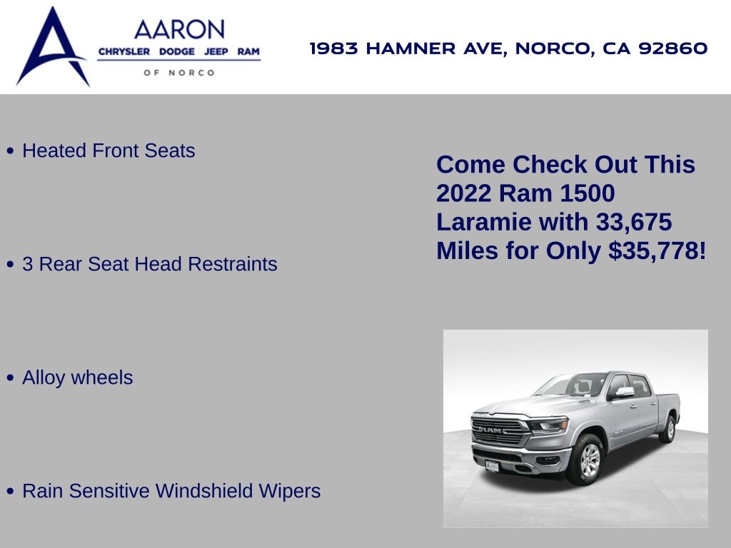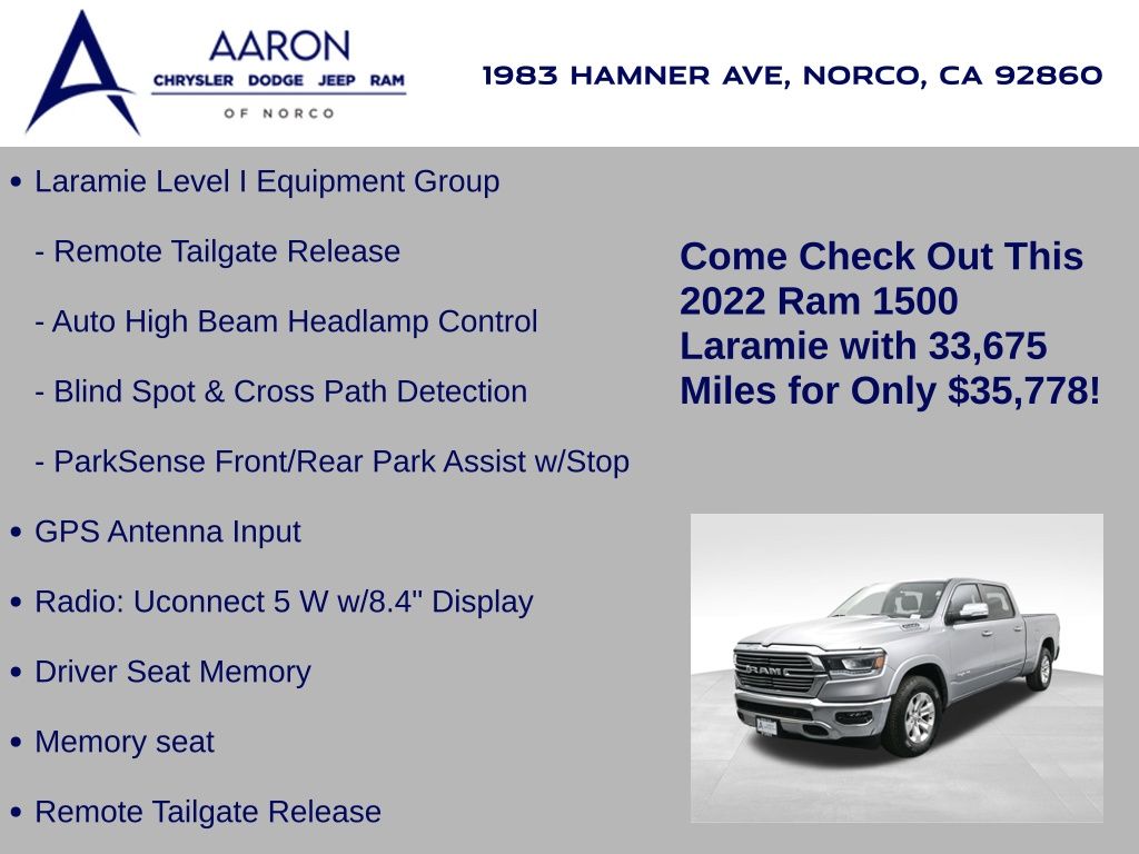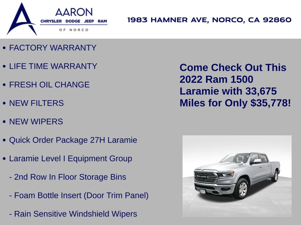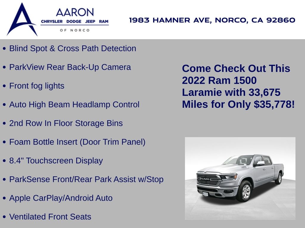 Priced below KBB Fair Purchase Price!FACTORY WARRANTY, LIFE TIME WARRANTY, FRESH OIL CHANGE, NEW FILTERS, NEW WIPERS, 1500 Laramie, 4D Crew Cab, HEMI 5.7L V8 Multi Displacement VVT, 8-Speed Automatic, RWD, 2nd Row In Floor Storage Bins, 3 Rear Seat Head Restraints, 8.4" Touchscreen Display, Alloy wheels, Apple CarPlay/Android Auto, Auto High Beam Headlamp Control, Blind Spot & Cross Path Detection, Driver Seat Memory, Dual front side impact airbags, Foam Bottle Insert (Door Trim Panel), Front fog lights, GPS Antenna Input, Heated Front Seats, Laramie Level I Equipment Group, Memory seat, ParkSense Front/Rear Park Assist w/Stop, ParkView Rear Back-Up Camera, Quick Order Package 27H Laramie, Radio: Uconnect 5 W w/8.4" Display, Rain Sensitive Windshield Wipers, Remote Tailgate Release, Ventilated Front Seats.