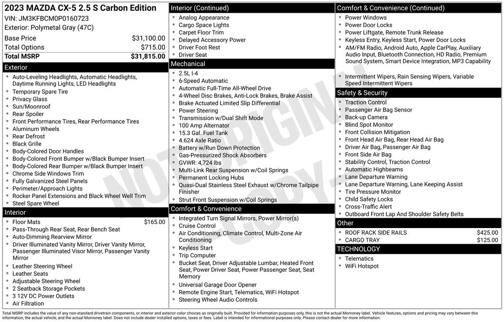 Priced below KBB Fair Purchase Price!FACTORY WARRANTY, LIFE TIME WARRANTY, FRESH OIL CHANGE, NEW FILTERS, NEW WIPERS, CX-5 2.5 S Carbon Edition, 4D Sport Utility, SKYACTIV® 2.5L 4-Cylinder DOHC 16V, 6-Speed Automatic, AWD, Alloy wheels, AppLink/Apple CarPlay and Android Auto, Auto High-beam Headlights, Dual front side impact airbags, Exterior Parking Camera Rear, Front dual zone A/C, Heated Front Bucket Seats, Infotainment System Voice Command, Leather Seat Trim, Memory seat, Overhead airbag, Power Liftgate, Power moonroof, Remote keyless entry, Spoiler, Wheels: 19" x 7J Aluminum Alloy.Clean CARFAX.CARFAX One-Owner.