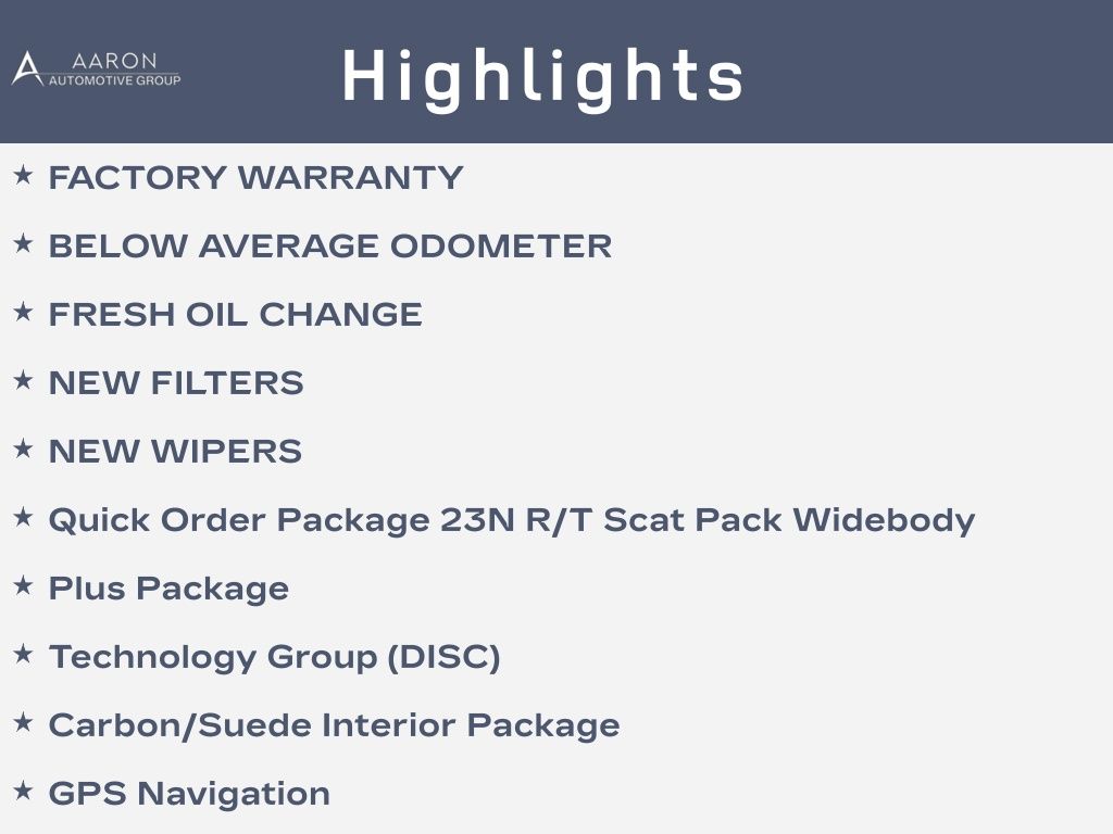 Priced below KBB Fair Purchase Price!FACTORY WARRANTY, BELOW AVERAGE ODOMETER, FRESH OIL CHANGE, NEW FILTERS, NEW WIPERS, Challenger R/T Scat Pack Widebody, 2D Coupe, SRT HEMI 6.4L V8, Tremec 6-Speed Manual, RWD, 1-Yr SiriusXM Guardian Trial, 4G LTE Wi-Fi Hot Spot, 5-Year SiriusXM Traffic Service, 5-Year SiriusXM Travel Link Service, 8.4" Touchscreen Display, Adaptive Damping Suspension, All Radio Equipped Vehicles, All VP4R Radios, Apple CarPlay, Auto High Beam Headlamp Control, Black-Edged Premium Floormats, Brembo 6-Pot Fixed Front Caliper Brakes, Carbon/Suede Interior Package, Compass Gauge, Dual front side impact airbags, Exterior Mirrors w/Heating Element, Flat-Bottom Steering Wheel, For Details, Visit DriveUconnect.com, For More Info, Call 800-643-2112, Front dual zone A/C, Front fog lights, Google Android Auto, GPS Antenna Input, GPS Navigation, HD Radio, Heated Front Seats, Heated Steering Wheel, High-Intensity Discharge Headlamps, Integrated Center Stack Radio, Integrated Voice Command w/Bluetooth, Media Hub (2 USB, AUX), Navigation System, Overhead airbag, ParkView Rear Back-Up Camera, Performance Shift Indicator, Plus Package, Power driver seat, Power Multi-Function Foldaway Mirrors, Power Tilt/Telescope Steering Column, Premium-Stitched Dash Panel, Quick Order Package 23N R/T Scat Pack Widebody, Radio: Uconnect 4C Nav w/8.4" Display, Radio/Driver Seat/Mirrors Memory, Rain Sensitive Windshield Wipers, Real Carbon Fiber Interior Accents, Rhombi 2-Pc Wheel Center Cap, Scat Pack Logo Nappa/Alcantara Seat, Shark Fin Antenna, SiriusXM Radio Service, SiriusXM Satellite Radio, SiriusXM Traffic Plus, SiriusXM Travel Link, Suede Headliner, Technology Group (DISC), USB Host Flip, Ventilated Front Seats, Wheels: 20" x 11.0" Carbon Black Aluminum, Widebody Competition Suspension, Widebody Fender Flares.Clean CARFAX.CARFAX One-Owner.
