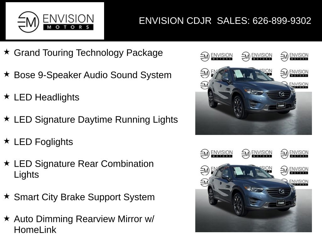 WE SPECIALIZE IN ALL CREDIT PROFILES! See what we can do for you! Call to find out (626) 899-9302.CARFAX One-Owner. Clean CARFAX.Odometer is 7827 miles below market average! 26/33 City/Highway MPG Auto Dimming Rearview Mirror w/HomeLink, Bose 9-Speaker Audio Sound System, Grand Touring Technology Package, LED Foglights, LED Headlights, LED Signature Daytime Running Lights, LED Signature Rear Combination Lights, Smart City Brake Support System.Blue Reflex Mica2016 Mazda CX-5 Grand Touring FWD 6-Speed Automatic SKYACTIV® 2.5L 4-Cylinder DOHC 16V**********All Pricing and Advertised Prices for any/all vehicles offered for sale does not include dealer installed accessories which can be purchased for an additional cost.********** The Factory Rebates may not be available on this vehicle if you elect to take advantage of a Special Alternative APR or Special Lease program. Some Factory Rebates are California Resident specific and may vary for residents of other states. NO sales to Dealers, Brokers or Exporters. For out of state purchase, customers must be present to purchase. If shipping is required, dealership must facilitate; no exceptions. Please contact us for special Multi-Vehicle or Fleet pricing. Prices are plus government fees and taxes, any finance charges, $85 documentary fee, $29 electronic registration fee, any emission testing charge and $1.75 per new tire state tire fee. *** We make every effort to provide accurate information, but please verify before purchasing. Leasing & financing available on approved credit. Trade-ins accepted. Subject to prior sale.Reviews: * Sporty driving feel that makes you feel secure while cornering; engines earn great fuel economy; spacious seating in both rows; many desirable safety features. Source: Edmunds