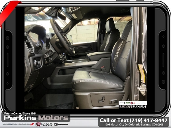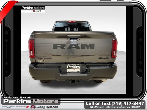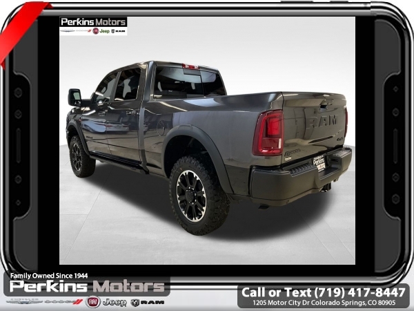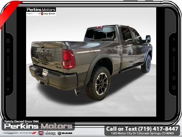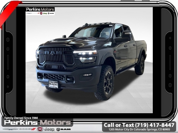 Factory MSRP: $89,755 $4,000 off MSRP! Granite Crystal Metallic Clearcoat 2025 Ram 2500 Rebel 4WD 8-Speed Automatic 6.7L I6<br><br>Check us out at www.perkinsmotors.com to see our specials! Since opening our doors in 1944, we’ve been proud to serve Colorado Springs, CO, and the surrounding areas of Pueblo, Castle Rock and Denver, CO. Throughout this time of being family owned for 80 years, we’ve maintained a firm commitment to our customers: to offer a wide selection of New Chrysler, Dodge, Fiat, Jeep, and Ram vehicles and quality pre-owned vehicles, and provide a quick, no-hassle car-buying process that ensures everyone drives off the lot satisfied with their purchase.<br><br>Bed Utility Group (DISC) (LED Bed Lighting, MOPAR Deployable Bed Step, and MOPAR Spray In Bedliner), Cold Weather Group (Engine Block Heater and MOPAR Winter Front Grille Cover), Quick Order Package 24R Rebel, Rebel Level 1 Equipment Group (115V Auxiliary Rear Power Outlet, 2 Way Rear Headrest Seat, 4 Way Front Headrests, 9 Alpine Speakers w/Subwoofer, Auto Adjust In Reverse Exterior Mirrors, Auto Dim Exterior Mirror, Auto High Beam Headlamp Control, Auto Power-Folding Mirrors, Auto-Dimming Exterior Passenger Mirror, Black Exterior Mirrors, Body Color Door Handles, Bucket Seats, Dual Wireless Charging Pad, Exterior Mirrors Courtesy Lamps, Exterior Mirrors w/Heating Element, Exterior Mirrors w/Memory, Exterior Mirrors w/Supplemental Signals, Folding Flat Load Floor Storage, Forward & Reverse Utility Lights, Front Door Locks 2-Door Passive Entry, Front Seat Back Map Pockets, Full Length Upgraded Floor Console, Heated Front Seats, Heated Second Row Seats, Heated Steering Wheel, High Back Seats, Leather Trimmed Bucket Seats (PL), LED Dome Lamp w/On/Off Switch, LED Interior Lighting, Media Hub w/2 Charge Only USBs, Mirror Running Lights, MOPAR Front & Rear Rubber Floor Mats, Overhead LED Lamps, Power 2-Way Driver Lumbar Adjust, Power 2-Way Passenger Lumbar Adjust, Power Adjust 8-Way Driver Seat, Power Adjust 8-Way Front Passenger Seat, Power Adjust Mirrors, Power Adjustable Convex Aux Mirrors, Power Adjustable Pedals w/Memory, Power Heated Fold Telescopic Mirrors w/Memory, Power Telescoping Mirrors, Premium Overhead Console, Radio/Driver Seat/Mirrors/Pedals Memory, Rain Sensitive Windshield Wipers, Rear 60/40 Folding Seat, Sport Performance Hood, Sun Visors w/Illuminated Vanity Mirrors, Universal Garage Door Opener, and Ventilated Front Seats), 3.42 Axle Ratio, 3.73 Axle Ratio, 4-Wheel Disc Brakes, 4G LTE Wi-Fi Hot Spot, 5th Wheel/Gooseneck Towing Prep Group, 6 Speakers, ABS brakes, Adjustable pedals, Air Conditioning, Alexa Built-In, Alloy wheels, AM/FM radio: SiriusXM with 360L, Apple CarPlay, Apple CarPlay/Android Auto, Auto Level Rear Air Suspension, Auto-dimming Rear-View mirror, Automatic temperature control, Block heater, Brake assist, Cloth Heated Power Bench Seat, Compass, Connected Travel & Traffic Services, Connectivity - US/Canada, Cruise Control, Dash Pass Thru Wire Circuits, Delay-off headlights, Disassociated Touchscreen Display, Driver door bin, Dual front impact airbags, Dual front side impact airbags, Electronic Stability Control, Emergency Vehicle Alert System (EVAS), Front anti-roll bar, Front Center Armrest w/Storage, Front dual zone A/C, Front fog lights, Front License Plate Bracket, Front reading lights, Fully automatic headlights, Global Telematics Box Module (TBM), Google Android Auto, GPS Antenna Input, GPS Navigation, HD Radio, Heated door mirrors, Heated front seats, Heated steering wheel, I/P Mounted Auxiliary Switches, Illuminated entry, Integrated Voice Command w/Bluetooth, Leather steering wheel, Low tire pressure warning, Manufacturer's Statement of Origin, Navigation System, Occupant sensing airbag, Off-Road Info Pages, Outside temperature di Sale price includes all manufacture's incentives and dealer discounts. Sale price not available on lease or compatible with special APR. $1000 - 2025 National Bonus Cash . Exp. 0