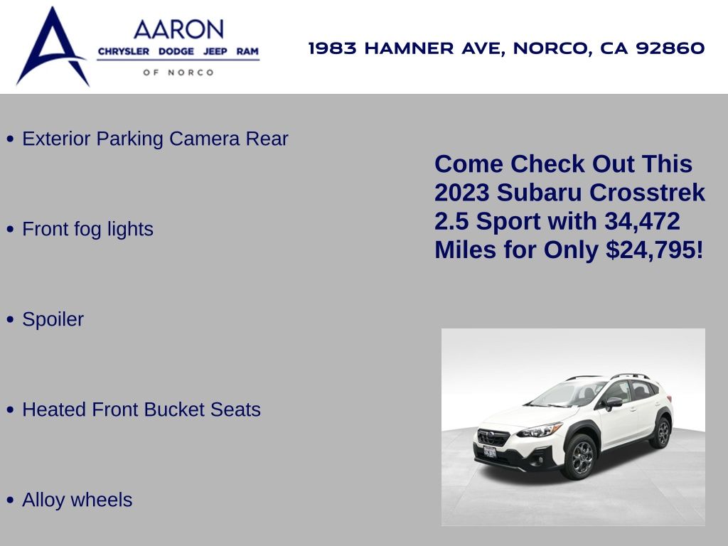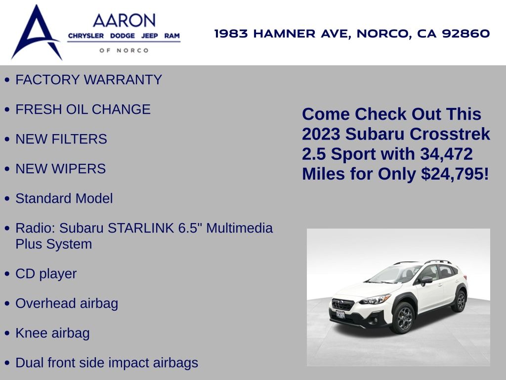 Priced below KBB Fair Purchase Price!FACTORY WARRANTY, FRESH OIL CHANGE, NEW FILTERS, NEW WIPERS, Crosstrek Sport, 4D Sport Utility, 2.5L 4-Cylinder DOHC 16V, Lineartronic CVT, AWD, Alloy wheels, CD player, Dual front side impact airbags, Exterior Parking Camera Rear, Front fog lights, Heated Front Bucket Seats, Knee airbag, Overhead airbag, Radio: Subaru STARLINK 6.5" Multimedia Plus System, Spoiler, Standard Model.Clean CARFAX.CARFAX One-Owner.