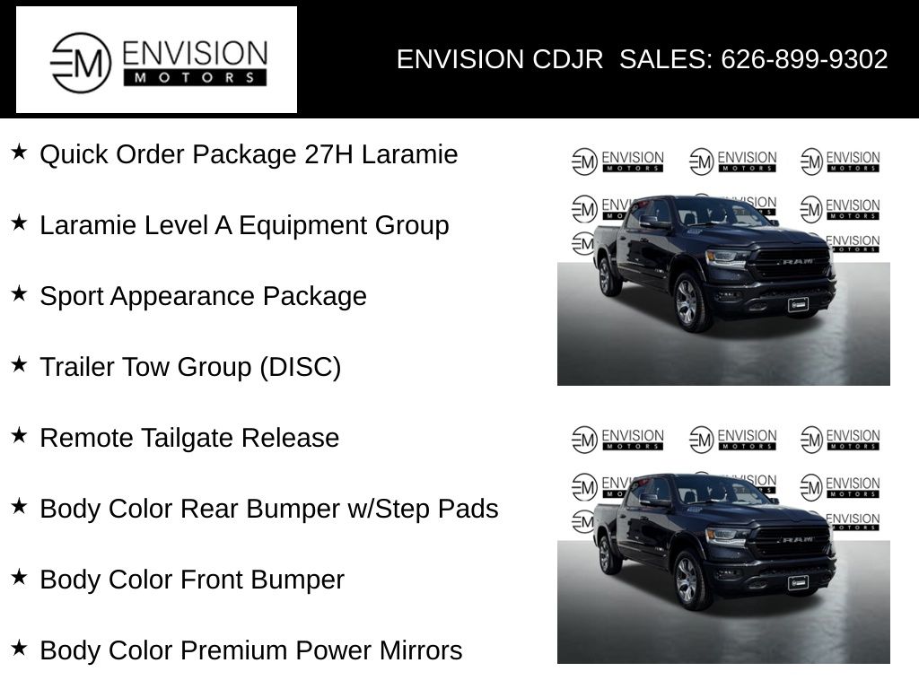 WE SPECIALIZE IN ALL CREDIT PROFILES! See what we can do for you! Call to find out (626) 899-9302.Certified. CARFAX One-Owner. Clean CARFAX.Odometer is 3058 miles below market average! Auto High Beam Headlamp Control, Black Interior Accents, Body Color Door Handles, Body Color Exterior Mirrors, Body Color Front Bumper, Body Color Premium Power Mirrors, Body Color Rear Bumper w/Step Pads, Foam Bottle Insert (Door Trim Panel), Grille Surround 3 Body Color Tex 2 Black, Laramie Level A Equipment Group, ParkSense Front/Rear Park Assist w/Stop, Quick Order Package 27H Laramie, Rain Sensitive Windshield Wipers, Rear 60/40 Folding Split Recline Seat, Remote Tailgate Release, Sport Appearance Package, Sport Decal, Sport Performance Hood, Tailgate Ajar Warning Lamp, Trailer Brake Control, Trailer Light Check, Trailer Reverse Steering Control, Trailer Tire Pressure Monitoring System, Trailer Tow Group (DISC), Wheels: 20" x 9" Premium Painted w/Inserts.Maximum Steel Metallic Clearcoat2021 Ram 1500 Laramie 4WD 8-Speed Automatic HEMI 5.7L V8 Multi Displacement VVTFCA US LLC Certified Pre-Owned Details: * Vehicle History * 125 Point Inspection * Transferable Warranty * Warranty Deductible: $100 * Limited Warranty: 3 Month/3,000 Mile (whichever comes first) after new car warranty expires or from certified purchase date * Vehicles Up to 75,000 Miles and/or 5 Model Years. 24-Hour Towing & Roadside Assistance, Car Rental Allowance, CARFAX® Vehicle History ReportTM and an Introductory 3-month Subscription to SiriusXM® Satellite Radio & Certified Warranty Upgrades * Powertrain Limited Warranty: 84 Month/100,000 Mile (whichever comes first) from original in-service date * Roadside Assistance**********All Pricing and Advertised Prices for any/all vehicles offered for sale does not include dealer installed accessories which can be purchased for an additional cost.********** The Factory Rebates may not be available on this vehicle if you elect to take advantage of a Special Alternative APR or Special Lease program. Some Factory Rebates are California Resident specific and may vary for residents of other states. NO sales to Dealers, Brokers or Exporters. For out of state purchase, customers must be present to purchase. If shipping is required, dealership must facilitate; no exceptions. Please contact us for special Multi-Vehicle or Fleet pricing. Prices are plus government fees and taxes, any finance charges, $85 documentary fee, $29 electronic registration fee, any emission testing charge and $1.75 per new tire state tire fee. *** We make every effort to provide accurate information, but please verify before purchasing. Leasing & financing available on approved credit. Trade-ins accepted. Subject to prior sale.Awards: * Motor Trend Automobiles of the year * JD Power Automotive Performance, Execution and Layout (APEAL) Study