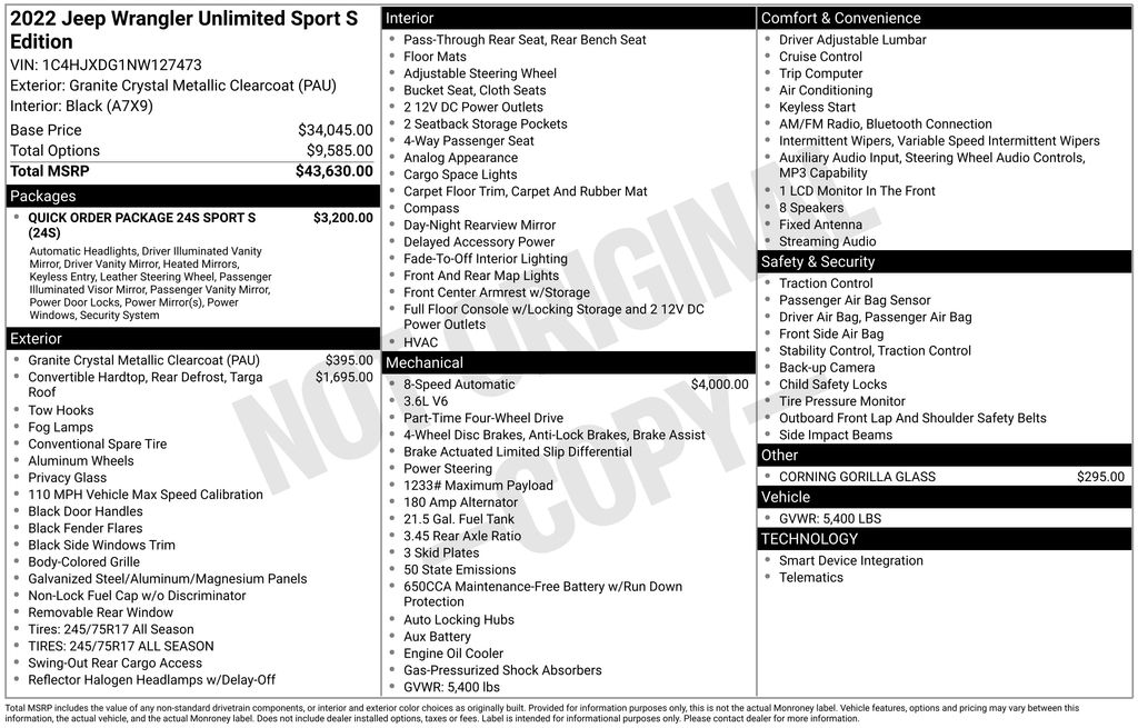 Priced below KBB Fair Purchase Price!FACTORY WARRANTY, LIFE TIME WARRANTY, FRESH OIL CHANGE, NEW FILTERS, NEW WIPERS, Wrangler Unlimited Sport S, 4D Sport Utility, 3.6L V6 24V VVT, 8-Speed Automatic, 4WD, Granite Crystal Metallic Clearcoat, Apple CarPlay/Android Auto, Automatic Headlamps, Black 3-Piece Hard Top, Compass, Deep Tint Sunscreen Windows, Dual front side impact airbags, Front 1-Touch Down Power Windows, Front fog lights, Leather Wrapped Steering Wheel, ParkView Rear Back-Up Camera, Power Heated Mirrors, Quick Order Package 24S Sport S, Radio: Uconnect 4 w/7" Display, Remote Keyless Entry, Security Alarm, Speed Sensitive Power Locks, Sport S, Stop-Start Dual Battery System, Sun Visors w/Illuminated Vanity Mirrors, Wheels: 17" x 7.5" Tech Silver Aluminum.Clean CARFAX.CARFAX One-Owner.