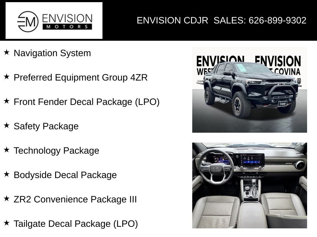 WE SPECIALIZE IN ALL CREDIT PROFILES! See what we can do for you! Call to find out (626) 899-9302.Clean CARFAX.4WD, 40" Off-Road Roof Lightbar, Adaptive Cruise Control, Automatic Emergency Braking, Bed-Mounted Sport Bar w/ZR2 Sail Panel, Black Nameplates (LPO), Blind Zone Steering Assist, Bodyside Decal Package, Bose Premium 7-Speaker Audio System Feature, Chevy Safety Assist, Desert Boss Special Edition, Driver & Front Passenger Ventilated Seats, Driver Memory Settings, Driver Seatback Map Pocket, Electronic Automatic Cruise Control, Following Distance Indicator, Forward Collision Alert, Front Fender Decal Package (LPO), Front Pedestrian & Bicyclist Braking, HD Surround Vision, Heated Steering Wheel, IntelliBeam Automatic High Beam On/Off, Interior Illumination Package (LPO), Lane Keep Assist w/Lane Departure Warning, Navigation System, Off-Road Front Bumper w/Safari Bar, Perforated Leather-Appointed Seat Trim, Power Distribution Box, Power Sliding Glass w/Manual Shade Sunroof, Preferred Equipment Group 4ZR, Rear Center Armrest, Rear Cross Traffic Braking, Rear Park Assist, Rear Pedestrian Alert, Rear-Window Electric Defogger, Safety Package, Tailgate Decal Package (LPO), Technology Package, Underbody Cameras, Wheels: 17" Beadlock Capable (LPO), Wheels: 17" x 8" Steel Transit, Wireless Charging, ZR2 Convenience Package III, ZR2 Off-Road Package.Black2023 Chevrolet Colorado ZR2 4WD 8-Speed Automatic 2.7L Turbo**********All Pricing and Advertised Prices for any/all vehicles offered for sale does not include dealer installed accessories which can be purchased for an additional cost.********** The Factory Rebates may not be available on this vehicle if you elect to take advantage of a Special Alternative APR or Special Lease program. Some Factory Rebates are California Resident specific and may vary for residents of other states. NO sales to Dealers, Brokers or Exporters. For out of state purchase, customers must be present to purchase. If shipping is required, dealership must facilitate; no exceptions. Please contact us for special Multi-Vehicle or Fleet pricing. Prices are plus government fees and taxes, any finance charges, $85 documentary fee, $29 electronic registration fee, any emission testing charge and $1.75 per new tire state tire fee. *** We make every effort to provide accurate information, but please verify before purchasing. Leasing & financing available on approved credit. Trade-ins accepted. Subject to prior sale.