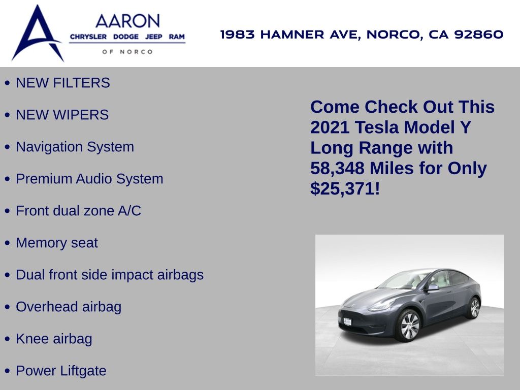 Priced below KBB Fair Purchase Price!NEW FILTERS, NEW WIPERS, Model Y Long Range, 4D Sport Utility, Electric Motor, 1-Speed Automatic, Alloy wheels, Compass, Dual front side impact airbags, Exterior Parking Camera Rear, Front dual zone A/C, Front fog lights, Heated front seats, Heated rear seats, Knee airbag, Lane Departure Warning System, Memory seat, Navigation System, Overhead airbag, Power Liftgate, Premium Audio System, Wheels: 19" x 9.5" Gemini.Clean CARFAX.