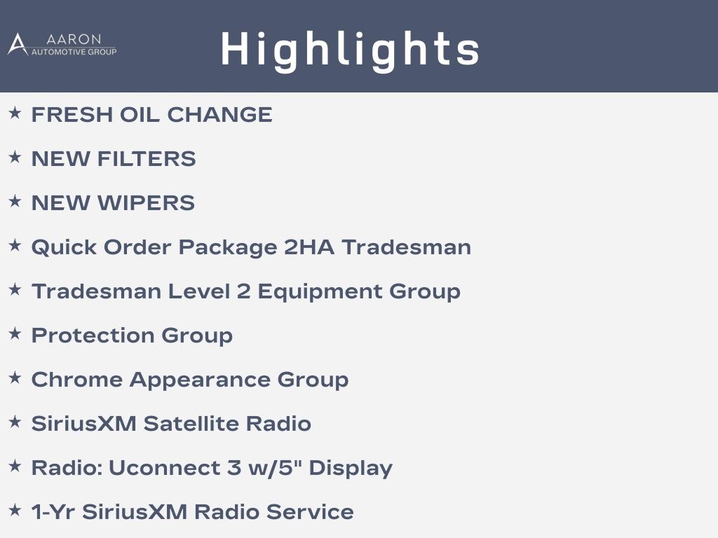 FRESH OIL CHANGE, NEW FILTERS, NEW WIPERS, 2500 Tradesman, 4D Crew Cab, Cummins 6.7L I6 Turbodiesel, 6-Speed Automatic, 4WD, 1-Yr SiriusXM Radio Service, 2 Way Rear Headrest Seat, 4 Way Front Headrests, 40/20/40 Split Bench Seat, Bright Front Bumper, Bright Rear Bumper, Carpet Floor Covering, Center Hub, Chrome Appearance Group, Chrome Grille Surround, Cloth 40/20/40 Bench Seat, Dual front side impact airbags, For More Info, Call 800-643-2112, Front Armrest w/Cupholders, Manual Adjust 4-Way Driver Seat, Manual Adjust 4-Way Front Passenger Seat, Matte Black Mesh Grille w/Chrome, Overhead airbag, ParkSense Rear Park Assist System, ParkView Rear Back-Up Camera, Protection Group, Quick Order Package 2HA Tradesman, Radio: Uconnect 3 w/5" Display, Rear Folding Seat, Rear Power Sliding Window, Rear Window Defroster, Remote Keyless Entry, Satin Chrome Interior Door Handles, SiriusXM Satellite Radio, Tow Hooks, Tradesman Level 2 Equipment Group, Wheels: 18" x 8.0" Steel Chrome Clad.