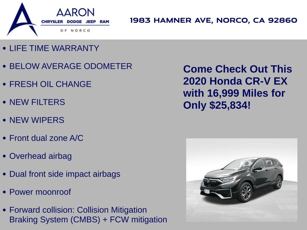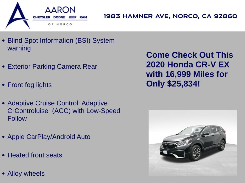 Priced below KBB Fair Purchase Price!LIFE TIME WARRANTY, BELOW AVERAGE ODOMETER, FRESH OIL CHANGE, NEW FILTERS, NEW WIPERS, CR-V EX, 4D Sport Utility, 1.5L I4 DOHC 16V, AWD, Adaptive Cruise Control: Adaptive CrControluise (ACC) with Low-Speed Follow, Alloy wheels, Apple CarPlay/Android Auto, Blind Spot Information (BSI) System warning, Dual front side impact airbags, Exterior Parking Camera Rear, Forward collision: Collision Mitigation Braking System (CMBS) + FCW mitigation, Front dual zone A/C, Front fog lights, Heated front seats, Overhead airbag, Power moonroof.Clean CARFAX.