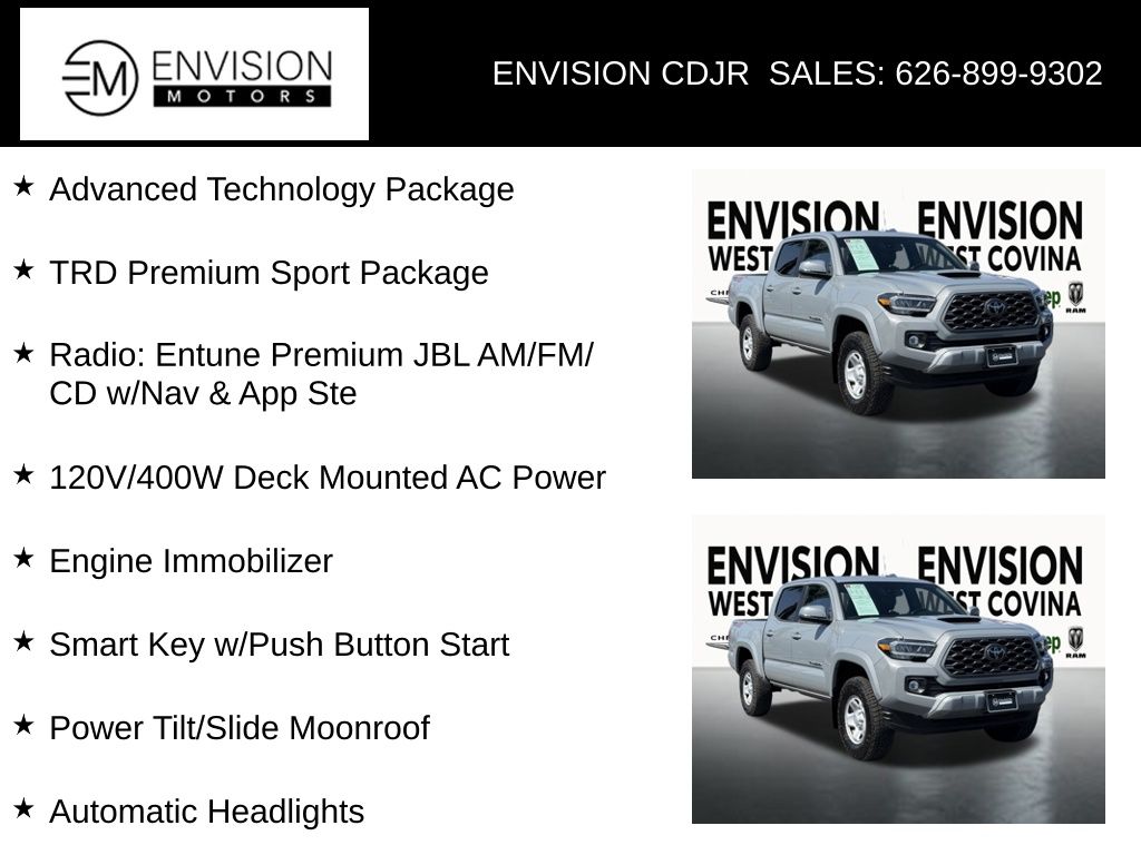 WE SPECIALIZE IN ALL CREDIT PROFILES! See what we can do for you! Call to find out (626) 899-9302.CARFAX One-Owner. Clean CARFAX.4WD, 120V/400W Deck Mounted AC Power, Advanced Technology Package, Auto-Dimming Rearview Mirror w/HomeLink, Automatic Headlights, Blind Spot Monitor w/Rear Cross Traffic Alert, Color-Keyed Overfenders, Engine Immobilizer, Heated Front Seats, Leather Seat Trim, Mesh Front Grille, Panoramic View Monitor, Power Sliding Rear Window w/Privacy Glass, Power Tilt/Slide Moonroof, Radio: Entune Premium JBL AM/FM/CD w/Nav & App Ste, Rear Parking Assist Sonar, Smart Key w/Push Button Start, TRD Premium Sport Package.Cement2021 Toyota Tacoma TRD Sport 4WD 6-Speed 3.5L V6 PDI DOHC 24V LEV3-ULEV70 278hp**********All Pricing and Advertised Prices for any/all vehicles offered for sale does not include dealer installed accessories which can be purchased for an additional cost.********** The Factory Rebates may not be available on this vehicle if you elect to take advantage of a Special Alternative APR or Special Lease program. Some Factory Rebates are California Resident specific and may vary for residents of other states. NO sales to Dealers, Brokers or Exporters. For out of state purchase, customers must be present to purchase. If shipping is required, dealership must facilitate; no exceptions. Please contact us for special Multi-Vehicle or Fleet pricing. Prices are plus government fees and taxes, any finance charges, $85 documentary fee, $29 electronic registration fee, any emission testing charge and $1.75 per new tire state tire fee. *** We make every effort to provide accurate information, but please verify before purchasing. Leasing & financing available on approved credit. Trade-ins accepted. Subject to prior sale.