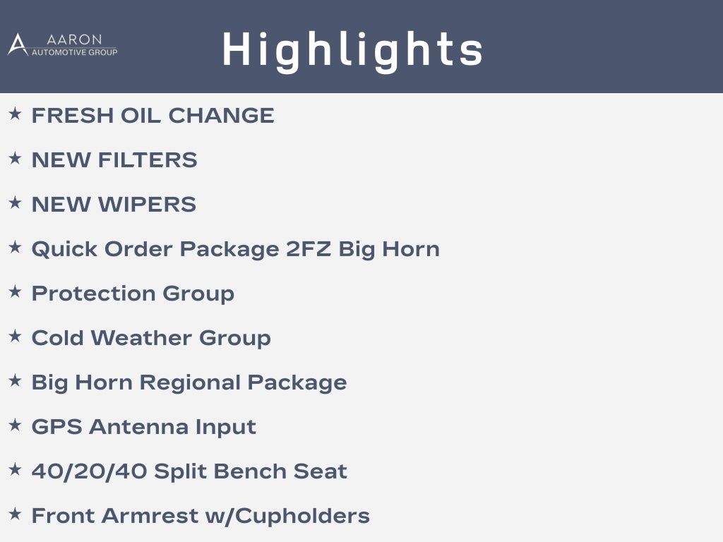FRESH OIL CHANGE, NEW FILTERS, NEW WIPERS, 3500 Big Horn, 4D Crew Cab, Cummins 6.7L I6 Turbodiesel, 6-Speed Automatic, 4WD, 115V Auxiliary Power Outlet, 40/20/40 Split Bench Seat, 8.4" Touchscreen Display, Big Horn Badge, Big Horn Regional Package, Bright/Bright Billets Grille, Center Hub, Cold Weather Group, Dual front side impact airbags, Engine Block Heater, Fog Lamps, Folding Flat Load Floor Storage, Front Armrest w/Cupholders, Front Center Seat Cushion Storage, GPS Antenna Input, Leather Wrapped Steering Wheel, Overhead airbag, ParkSense Rear Park Assist System, ParkView Rear Back-Up Camera, Power 10-Way Driver Seat, Power Lumbar Adjust, Premium Cloth 40/20/40 Bench Seat, Protection Group, Quick Order Package 2FZ Big Horn, Rear 60/40 Split Folding Seat, Remote Start System, Remote USB Port - Charge Only, Steering Wheel Mounted Audio Controls, Storage Tray, Underhood Lamp, Wheels: 18" x 8.0" Polished Aluminum, Winter Front Grille Cover.CARFAX One-Owner.