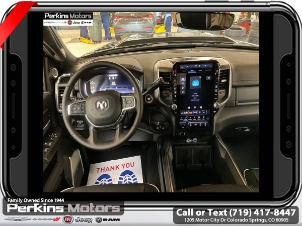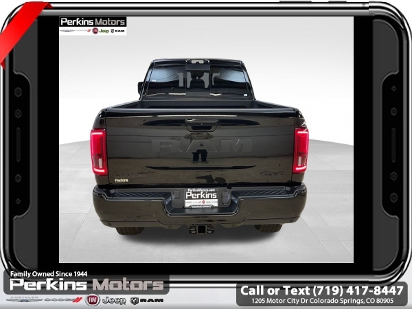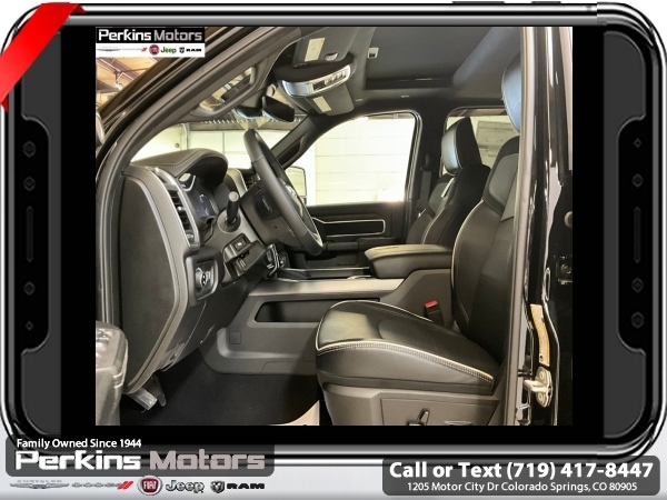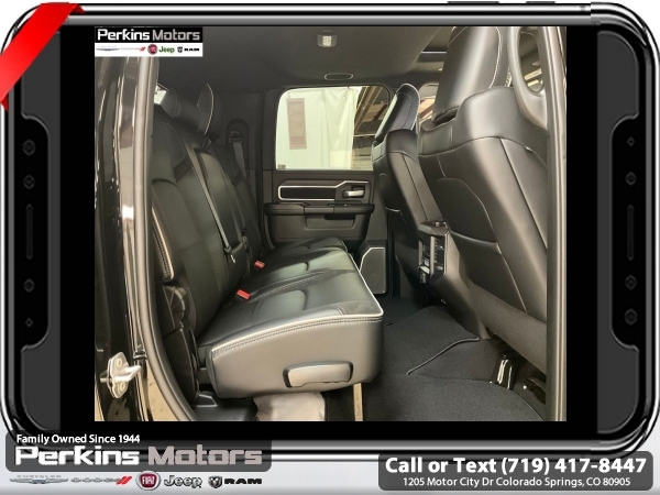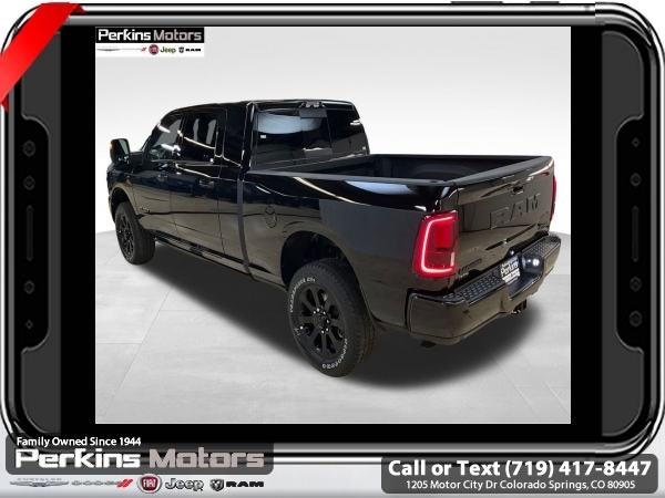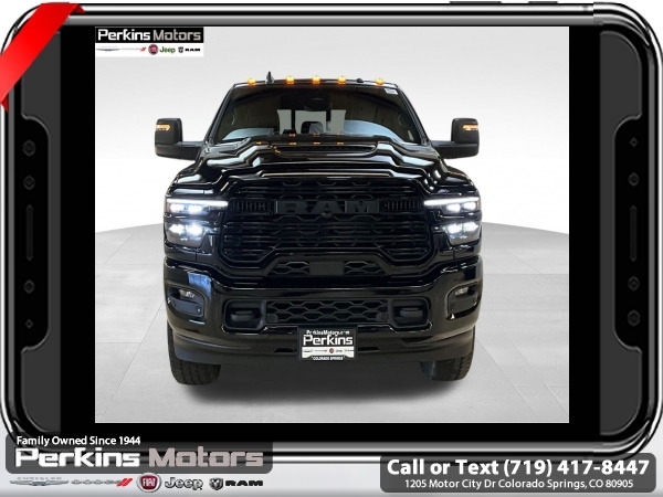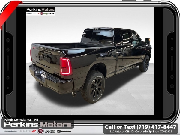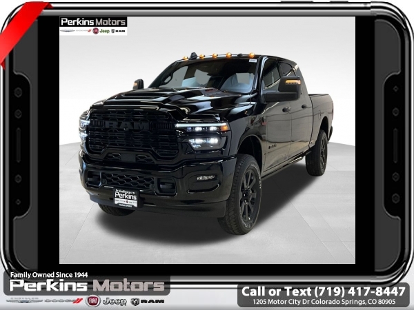 Factory MSRP: $91,400 $4,000 off MSRP! Diamond Black Crystal Pearlcoat 2025 Ram 3500 Laramie 4WD 8-Speed Automatic 6.7L I6<br><br>Check us out at www.perkinsmotors.com to see our specials! Since opening our doors in 1944, we’ve been proud to serve Colorado Springs, CO, and the surrounding areas of Pueblo, Castle Rock and Denver, CO. Throughout this time of being family owned for 80 years, we’ve maintained a firm commitment to our customers: to offer a wide selection of New Chrysler, Dodge, Fiat, Jeep, and Ram vehicles and quality pre-owned vehicles, and provide a quick, no-hassle car-buying process that ensures everyone drives off the lot satisfied with their purchase.<br><br>Cold Weather Group (Engine Block Heater and MOPAR Winter Front Grille Cover), Laramie Level 2 Plus Equipment Group (#1 Seat Foam Cushion, 115V Auxiliary Rear Power Outlet, 14.4 Touchscreen Display, 17 Speaker harman/kardon Premium Sound, 2 Way Rear Headrest Seat, 4 Way Front Headrests, 4G LTE Wi-Fi Hot Spot, Active Lane Management System, Adaptive Steering System, Alexa Built-In, Apple CarPlay, Auto Adjust In Reverse Exterior Mirrors, Auto Dim Exterior Mirror, Auto High Beam Headlamp Control, Auto-Dimming Exterior Passenger Mirror, Bucket Seats, Center Stop Lamp w/Cargo View Camera, Chrome Exterior Mirrors, Connected Travel & Traffic Services, Connectivity - US/Canada, Disassociated Touchscreen Display, Drowsy Driver Detection, Dual Wireless Charging Pad, Emergency Vehicle Alert System (EVAS), Exterior Mirrors Courtesy Lamps, Exterior Mirrors w/Heating Element, Exterior Mirrors w/Memory, Exterior Mirrors w/Supplemental Signals, Foam Bottle Insert (Door Trim Panel), For Details Visit DriveUconnect.com, For More Info, Call 800-643-2112, Forward & Reverse Utility Lights, Front Seat Back Map Pockets, Full Length Upgraded Floor Console, Global Telematics Box Module (TBM), Google Android Auto, GPS Antenna Input, GPS Navigation, HD Radio, Heated Front Seats, Heated Steering Wheel, High Back Seats, Integrated Voice Command w/Bluetooth, Leather Trimmed Bucket Seats, LED Bed Lighting, Mirror Running Lights, MOPAR Deployable Bed Step, MOPAR Spray In Bedliner, Off-Road Information Pages, Power 2-Way Driver Lumbar Adjust, Power 2-Way Passenger Lumbar Adjust, Power Adjust 8-Way Driver Seat, Power Adjust 8-Way Front Passenger Seat, Power Adjust Mirrors, Power Adjustable Pedals w/Memory, Power Deployable Running Boards, Power Heated Folding Telescopic Mirrors w/Memory, Power Telescoping Mirrors, Power-Adjustable Convex Aux Mirrors, Radio: Uconnect 5 Nav w/14.4 Display, Radio/Driver Seat/Mirrors/Pedals Memory, Rain Sensitive Windshield Wipers, Rear 60/40 Folding Seat, Remote Tailgate Release, Selectable Tire Fill Alert, SiriusXM Radio Service, SiriusXM w/360L, Traffic Sign Recognition, Trailer Tow Pages, and Ventilated Front Seats), Night Edition (Black Exterior Truck Badging, Black Wheel Center Hub, Body Color Grille Surround, Gloss Black Grille Billets/Accents, and Sport Performance Hood), Quick Order Package 24H Laramie, 10 Speakers, 3.42 Axle Ratio, 4-Wheel Disc Brakes, 5th Wheel/Gooseneck Towing Prep Group, ABS brakes, Air Conditioning, Alloy wheels, AM/FM radio: SiriusXM with 360L, Apple CarPlay/Android Auto, Auto Power-Folding Mirrors, Auto-dimming Rear-View mirror, Automatic temperature control, Brake assist, Bumpers: body-color, Clearance Lamps, Compass, Cruise Control, Delay-off headlights, Driver door bin, Driver vanity mirror, Dual front impact airbags, Dual front side impact airbags, Electronic Stability Control, Front anti-roll bar, Front Center Armrest w/Storage, Front dual zone A/C, Front fog lights, Front License Plate Bracket, Front reading lights, Fully automatic headlights, Garage door transmitter, Heated door mirrors, Heated front seats, Heated steering wheel, Illum Sale price includes all manufacture's incentives and dealer discounts. Sale price not available on lease or compatible with special APR. $1000 - 2025 National Bonus Cash . Exp. 0
