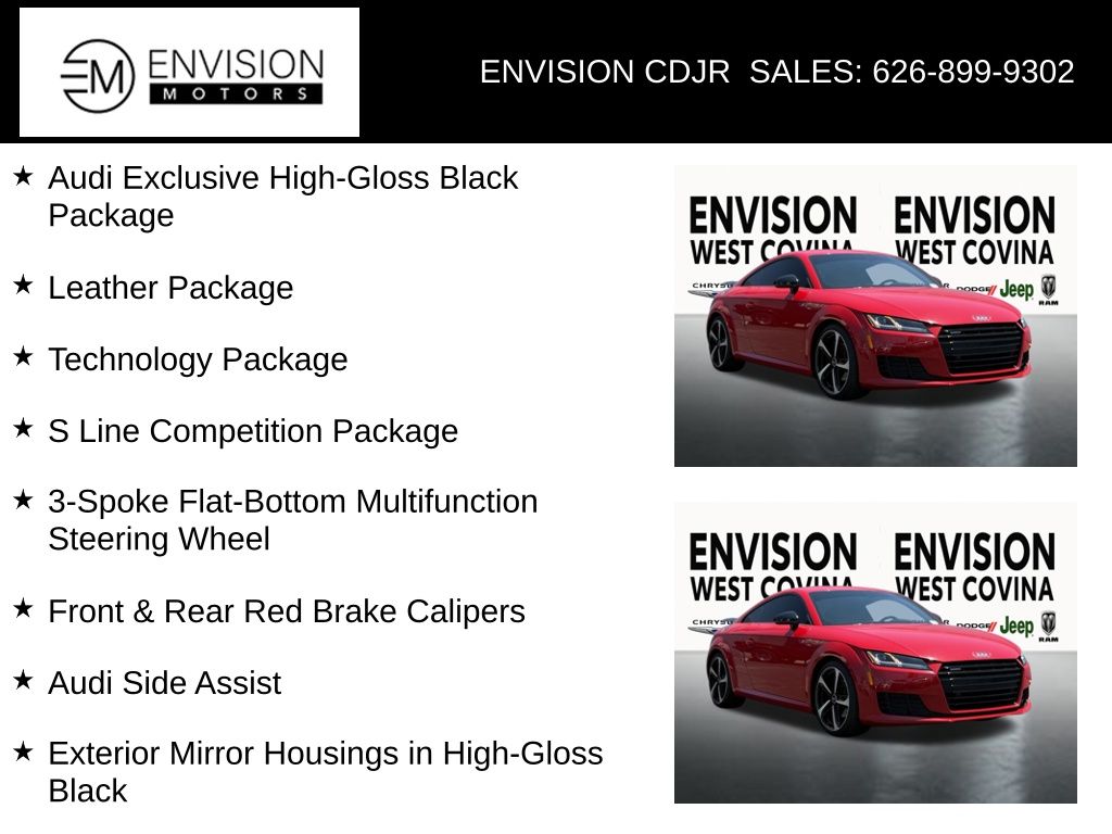 WE SPECIALIZE IN ALL CREDIT PROFILES! See what we can do for you! Call to find out (626) 899-9302.Clean CARFAX.23/30 City/Highway MPG Black Leather, 3-Spoke Flat-Bottom Multifunction Steering Wheel, Aluminum S Line Door Sills, Audi Connect w/Online Services, Audi Exclusive High-Gloss Black Package, Audi MMI Navigation Plus, Audi Side Assist, Audi Smartphone Interface, Black Exhaust Tips, Brushed Aluminum Inlays, Exterior Mirror Housings in High-Gloss Black, Front & Rear Red Brake Calipers, High-Gloss Black Spoiler, Leather Package, Leather/Alcantara Seat Trim w/S Line Embossing, S Line Competition Package, S Line Sport Suspension, S Sport Seats, Technology Package, Wheels: 19" Audi Sport 5-Spoke-Blade Design.Tango Red2018 Audi TT 2.0T quattro 6-Speed Automatic S tronic 2.0L 4-Cylinder TFSI**********All Pricing and Advertised Prices for any/all vehicles offered for sale does not include dealer installed accessories which can be purchased for an additional cost.********** The Factory Rebates may not be available on this vehicle if you elect to take advantage of a Special Alternative APR or Special Lease program. Some Factory Rebates are California Resident specific and may vary for residents of other states. NO sales to Dealers, Brokers or Exporters. For out of state purchase, customers must be present to purchase. If shipping is required, dealership must facilitate; no exceptions. Please contact us for special Multi-Vehicle or Fleet pricing. Prices are plus government fees and taxes, any finance charges, $85 documentary fee, $29 electronic registration fee, any emission testing charge and $1.75 per new tire state tire fee. *** We make every effort to provide accurate information, but please verify before purchasing. Leasing & financing available on approved credit. Trade-ins accepted. Subject to prior sale.Awards: * 2018 KBB.com 10 Most Awarded Brands