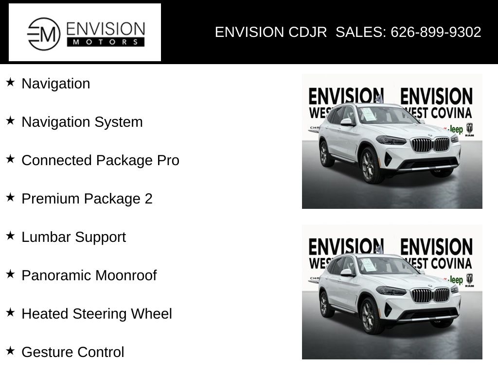 WE SPECIALIZE IN ALL CREDIT PROFILES! See what we can do for you! Call to find out (626) 899-9302.CARFAX One-Owner. Clean CARFAX.Odometer is 5697 miles below market average! 23/29 City/Highway MPG 8-Speed Automatic Sport, Connected Package Pro, Gesture Control, Heated Front Seats, Heated Steering Wheel, Lumbar Support, Navigation, Navigation System, Panoramic Moonroof, Premium Package 2, Wheels: 19" x 7.5" Y-Spoke (Style 693).Alpine White2022 BMW X3 sDrive30i RWD 8-Speed Automatic Sport 2.0L I4 TwinPower Turbo**********All Pricing and Advertised Prices for any/all vehicles offered for sale does not include dealer installed accessories which can be purchased for an additional cost.********** The Factory Rebates may not be available on this vehicle if you elect to take advantage of a Special Alternative APR or Special Lease program. Some Factory Rebates are California Resident specific and may vary for residents of other states. NO sales to Dealers, Brokers or Exporters. For out of state purchase, customers must be present to purchase. If shipping is required, dealership must facilitate; no exceptions. Please contact us for special Multi-Vehicle or Fleet pricing. Prices are plus government fees and taxes, any finance charges, $85 documentary fee, $29 electronic registration fee, any emission testing charge and $1.75 per new tire state tire fee. *** We make every effort to provide accurate information, but please verify before purchasing. Leasing & financing available on approved credit. Trade-ins accepted. Subject to prior sale.