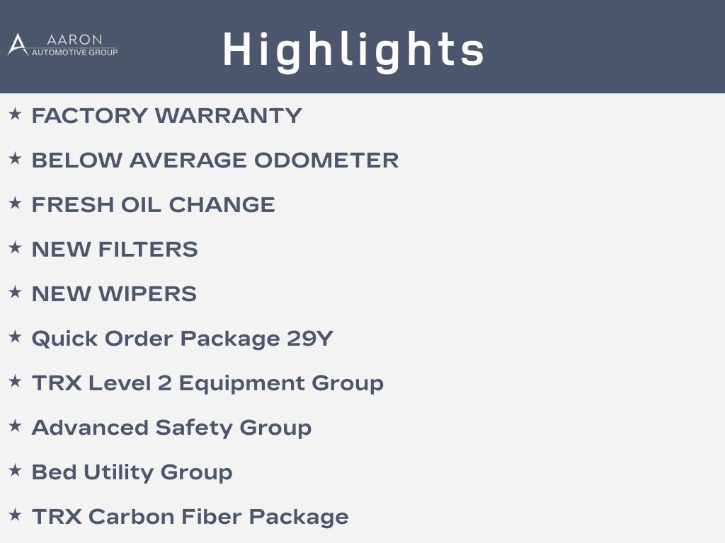 FACTORY WARRANTY, BELOW AVERAGE ODOMETER, FRESH OIL CHANGE, NEW FILTERS, NEW WIPERS, 1500 TRX, 4D Crew Cab, 6.2L Supercharged HEMI V8 SRT, 8-Speed Automatic, 4WD, #2 Seat Foam Cushion, 2-Door Passive Entry, Front Door Locks, 4 Way Front Headrests, Adaptive Cruise Control w/Stop & Go, Advanced Safety Group, Alloy wheels, Bed Utility Group, Blind Spot & Cross Path Detection, Body Color Door Handles, Bucket Seats, Center Console Parts Module, Digital Rearview Mirror, Dome Dual LED Reading Lamp, Driver Seat Memory, Driver/Passenger Wrapped Assist Handles, Dual front side impact airbags, Dual-Pane Panoramic Sunroof, Exterior Mirrors w/Memory, Front Door Accent Lighting, Front fog lights, Front Seat Back Map Pockets, Full Length Premium Upgraded Floor Console, harman/kardon 19 Speaker Premium Sound, Heads-Up Display, Heated Front Seats, Heated Second Row Seats, Heated Steering Wheel, IP LED Ambient Light Pipe, Lane Keep Assist, Leather Trimmed Bucket Seats, Leather/Carbon Flat-Bottom Steering Wheel, Leather/Suede Flat-Bottom Steering Wheel, LED CHMSL Lamp, Luxury Front Door Trim Panel, MOPAR 4 Adjustable Cargo Tie-Down Hooks, MOPAR Bright Pedal Kit, MOPAR Deployable Bed Step, MOPAR Spray In Bedliner, Navigation System, Overhead airbag, ParkSense Front/Rear Park Assist w/Stop, ParkView Rear Back-Up Camera, Pedestrian Emergency Braking, Pick-Up Box Lighting, Power 4-Way Driver Lumbar Adjust, Power 4-Way Passenger Lumbar Adjust, Power 8-Way Driver & Passenger Seats, Power Adjustable Pedals w/Memory, Premium Wrapped IP Bezel, Quick Order Package 29Y, Radio/Driver Seat/Mirrors/Pedals Memory, Rain Sensitive Windshield Wipers, Real Carbon Fiber Interior Accents, Rear 60/40 Folding Seat, Rear 60/40 Folding Split Recline Seat, Rear Door Accent Lighting, Rear Underseat Compartment Storage, Rear Window Defroster, Remote Tailgate Release, Sun Visors w/Illuminated Vanity Mirrors, Surround View Camera System, Tailgate Ajar Warning Lamp, Trailer Brake Control, TRX Carbon Fiber Package, TRX Level 2 Equipment Group, TRX Red Interior Accents, Universal Garage Door Opener, Ventilated Front Seats, Ventilated Rear Seats, Wireless Charging Pad.Clean CARFAX.