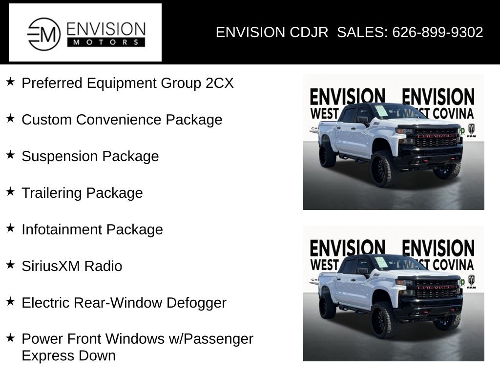 WE SPECIALIZE IN ALL CREDIT PROFILES! See what we can do for you! Call to find out (626) 899-9302.10-Speed Automatic, 4WD, Black Leather, 170 Amp Alternator, 3.5" Diagonal Monochromatic Display, 4G LTE Wi-Fi Hot Spot Capable, Auto-Locking Rear Differential, Bluetooth® For Phone, Chevrolet Connected Access Capable, Color-Keyed Carpeting Floor Covering, Compass, Custom Convenience Package, Deep-Tinted Glass, Electric Rear-Window Defogger, Electronic Cruise Control, EZ Lift Power Lock & Release Tailgate, Front Rubberized Vinyl Floor Mats, Heavy-Duty Air Filter, High Gloss Black Grille, Hill Descent Control, Hitch Guidance, Infotainment Package, LED Cargo Area Lighting, Manual Tilt Wheel Steering Column, OnStar & Chevrolet Connected Services Capable, Performance Red Recovery Hooks, Power Door Locks, Power Front Windows w/Driver Express Up/Down, Power Front Windows w/Passenger Express Down, Power Rear Windows w/Express Down, Preferred Equipment Group 2CX, Rear 60/40 Folding Bench Seat (Folds Up), Rear Rubberized-Vinyl Floor Mats, Remote Keyless Entry, Remote Vehicle Starter System, SiriusXM Radio, Standard Tailgate, Suspension Package, Theft Deterrent System (Unauthorized Entry), Trailering Package.Summit White2021 Chevrolet Silverado 1500 Custom Trail Boss 4WD 10-Speed Automatic EcoTec3 6.2L V8**********All Pricing and Advertised Prices for any/all vehicles offered for sale does not include dealer installed accessories which can be purchased for an additional cost.********** The Factory Rebates may not be available on this vehicle if you elect to take advantage of a Special Alternative APR or Special Lease program. Some Factory Rebates are California Resident specific and may vary for residents of other states. NO sales to Dealers, Brokers or Exporters. For out of state purchase, customers must be present to purchase. If shipping is required, dealership must facilitate; no exceptions. Please contact us for special Multi-Vehicle or Fleet pricing. Prices are plus government fees and taxes, any finance charges, $85 documentary fee, $29 electronic registration fee, any emission testing charge and $1.75 per new tire state tire fee. *** We make every effort to provide accurate information, but please verify before purchasing. Leasing & financing available on approved credit. Trade-ins accepted. Subject to prior sale.