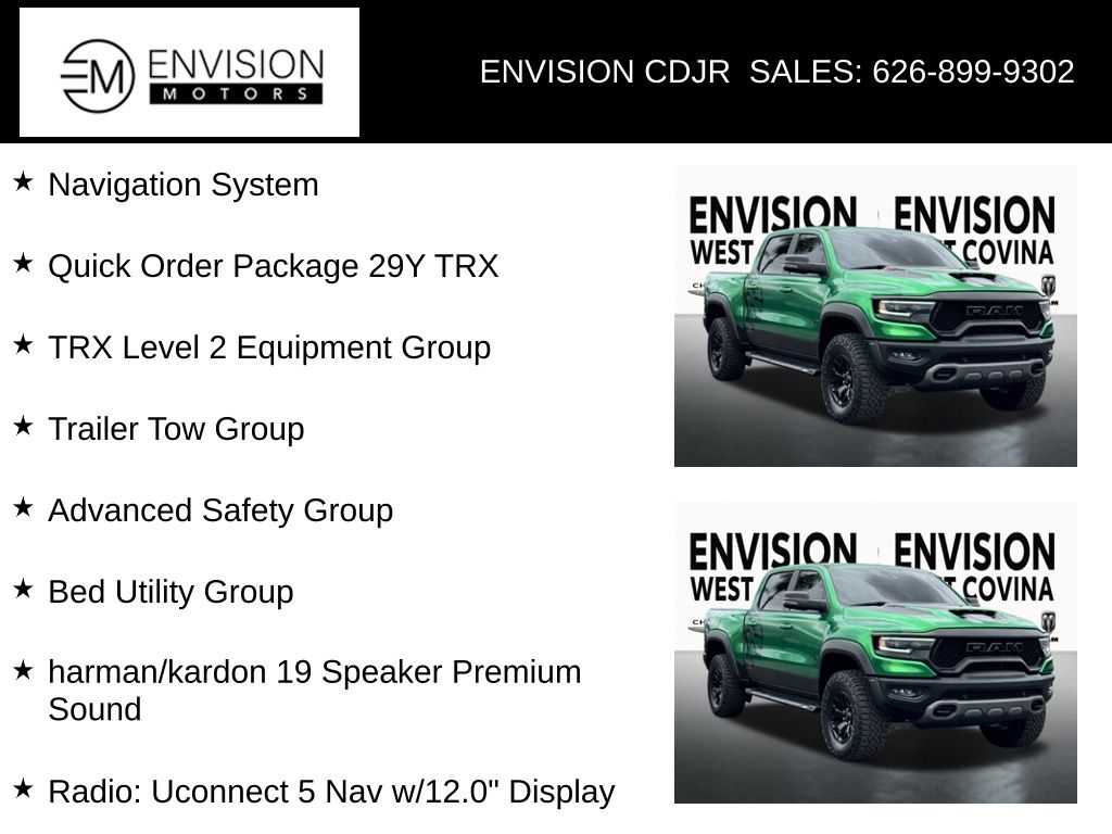 WE SPECIALIZE IN ALL CREDIT PROFILES! See what we can do for you! Call to find out (626) 899-9302.CARFAX One-Owner. Clean CARFAX.Odometer is 5060 miles below market average! #2 Seat Foam Cushion, 2-Door Passive Entry, Front Door Locks, 4 Way Front Headrests, Accent Color Door Handles, Adaptive Cruise Control w/Stop & Go, Adaptive suspension, Advanced Safety Group, Bed Utility Group, Blind Spot & Cross Path Detection, Bucket Seats, Digital Rearview Mirror, Dome Dual LED Reading Lamp, Driver Seat Memory, Driver/Passenger Wrapped Assist Handles, Dual-Pane Panoramic Sunroof, Exterior Mirrors w/Memory, Front Door Accent Lighting, Front Seat Back Map Pockets, Full Length Premium Upgraded Floor Console, harman/kardon 19 Speaker Premium Sound, Heads-Up Display, Heated Front Seats, Heated Second Row Seats, Heated Steering Wheel, IP LED Ambient Light Pipe, Lane Keep Assist, Leather Trimmed Bucket Seats, Leather/Suede Flat-Bottom Steering Wheel, LED CHMSL Lamp, Luxury Front Door Trim Panel, MOPAR 4 Adjustable Cargo Tie-Down Hooks, MOPAR Bright Pedal Kit, MOPAR Deployable Bed Step, MOPAR Spray In Bedliner, Navigation System, ParkSense Front/Rear Park Assist w/Stop, Pedestrian Emergency Braking, Pick-Up Box Lighting, Power 4-Way Driver Lumbar Adjust, Power 4-Way Passenger Lumbar Adjust, Power 8-Way Driver & Passenger Seats, Power Adjustable Pedals w/Memory, Premium Wrapped IP Bezel, Quick Order Package 29Y TRX, Radio: Uconnect 5 Nav w/12.0" Display, Radio/Driver Seat/Mirrors/Pedals Memory, Rain Sensitive Windshield Wipers, Rear 60/40 Folding Seat, Rear 60/40 Folding Split Recline Seat, Rear Door Accent Lighting, Rear Underseat Compartment Storage, Rear Window Defroster, Remote Tailgate Release, Sun Visors w/Illuminated Vanity Mirrors, Surround View Camera System, Trailer Brake Control, Trailer Light Check, Trailer Tire Pressure Monitoring System, Trailer Tow Group, TRX Level 2 Equipment Group, Universal Garage Door Opener, Ventilated Front Seats, Ventilated Rear Seats, Wheels: 18" x 9" Black Paint/Polish Aluminum, Wireless Charging Pad.Diamond Black Crystal Pearlcoat2024 Ram 1500 TRX 4WD 8-Speed Automatic 6.2L Supercharged HEMI V8 SRT**********All Pricing and Advertised Prices for any/all vehicles offered for sale does not include dealer installed accessories which can be purchased for an additional cost.********** The Factory Rebates may not be available on this vehicle if you elect to take advantage of a Special Alternative APR or Special Lease program. Some Factory Rebates are California Resident specific and may vary for residents of other states. NO sales to Dealers, Brokers or Exporters. For out of state purchase, customers must be present to purchase. If shipping is required, dealership must facilitate; no exceptions. Please contact us for special Multi-Vehicle or Fleet pricing. Prices are plus government fees and taxes, any finance charges, $85 documentary fee, $29 electronic registration fee, any emission testing charge and $1.75 per new tire state tire fee. *** We make every effort to provide accurate information, but please verify before purchasing. Leasing & financing available on approved credit. Trade-ins accepted. Subject to prior sale.