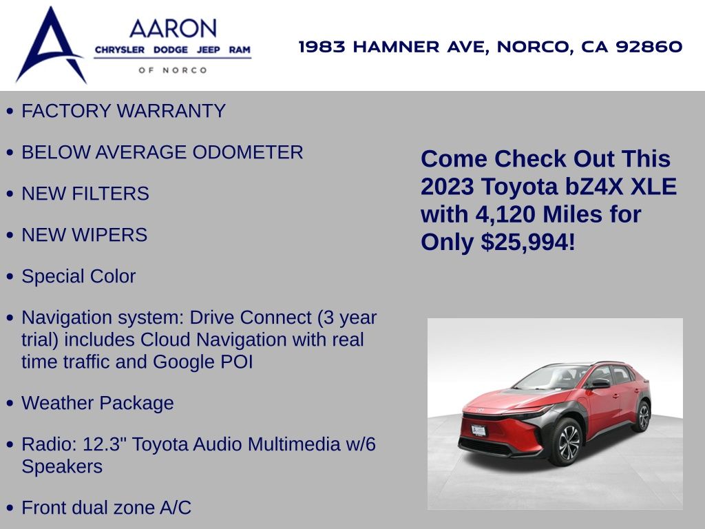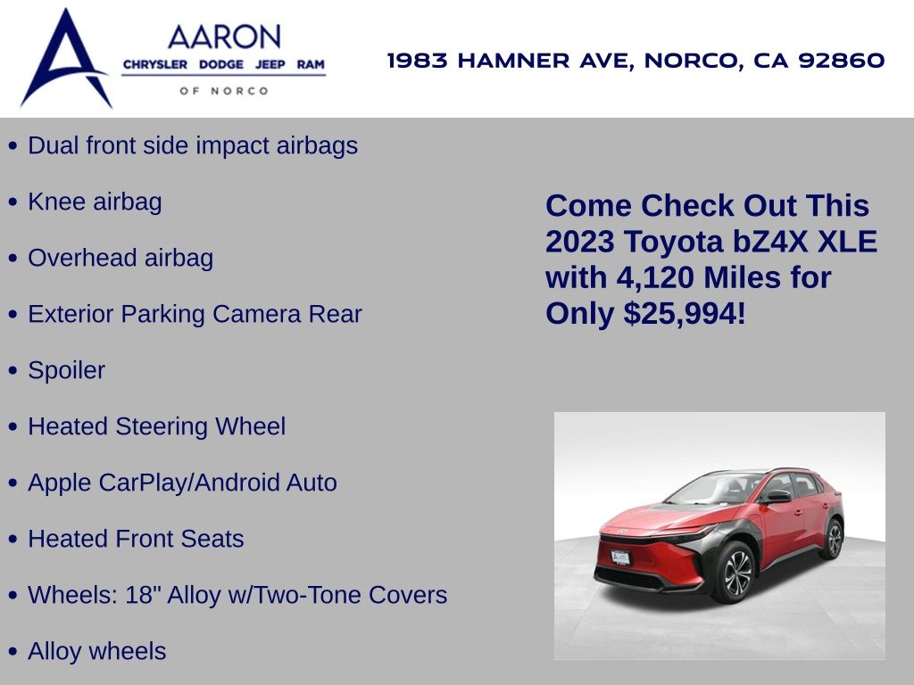 Priced below KBB Fair Purchase Price!FACTORY WARRANTY, BELOW AVERAGE ODOMETER, NEW FILTERS, NEW WIPERS, Special Color, bZ4X XLE, 4D Sport Utility, Electric Motor, Single-Speed Automatic, FWD, Alloy wheels, Apple CarPlay/Android Auto, Dual front side impact airbags, Exterior Parking Camera Rear, Front dual zone A/C, Heated Front Seats, Heated Steering Wheel, Knee airbag, Navigation system: Drive Connect (3 year trial) includes Cloud Navigation with real time traffic and Google POI, Overhead airbag, Radio: 12.3" Toyota Audio Multimedia w/6 Speakers, Spoiler, Weather Package, Wheels: 18" Alloy w/Two-Tone Covers.Clean CARFAX.CARFAX One-Owner.