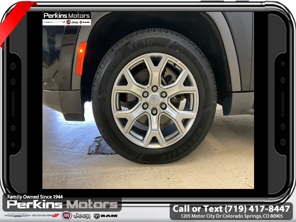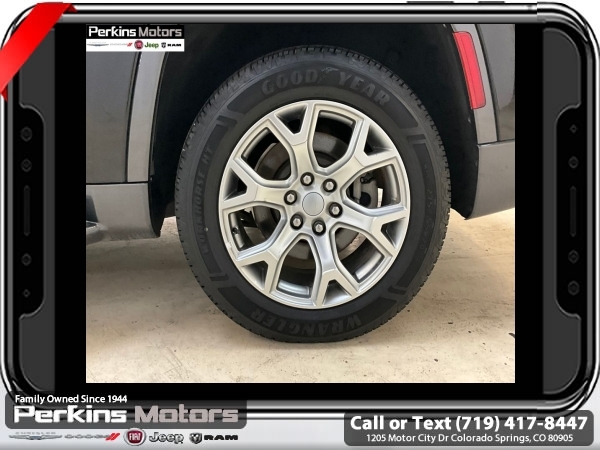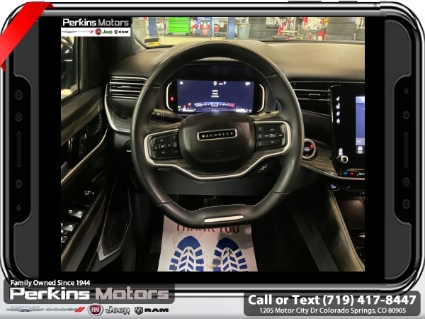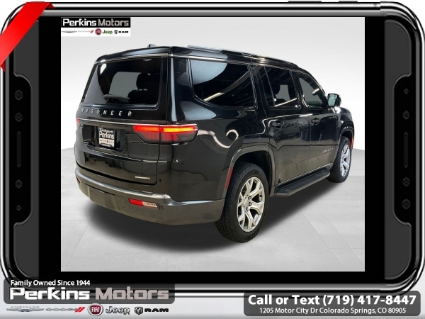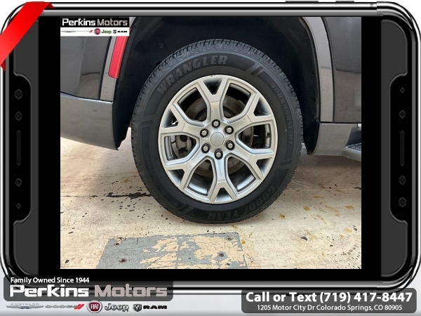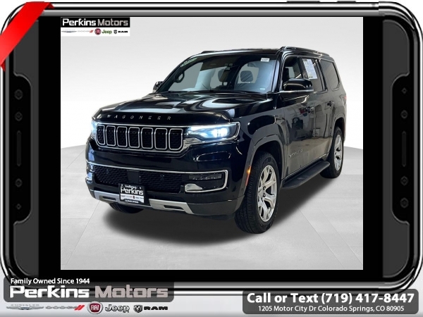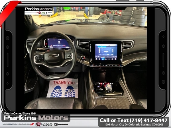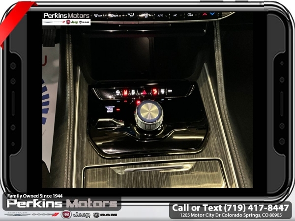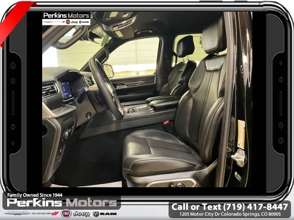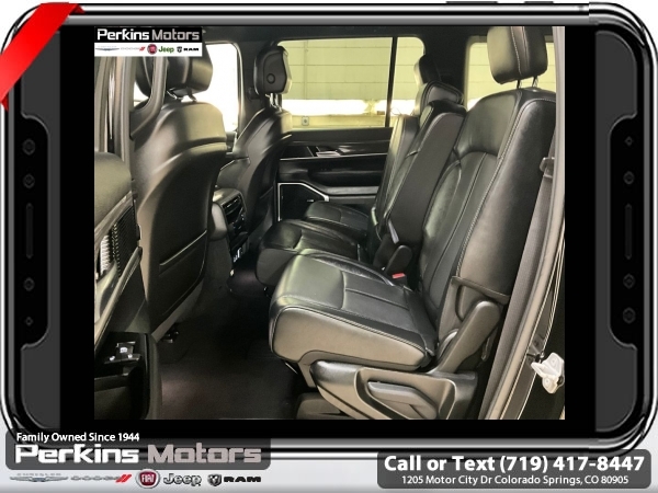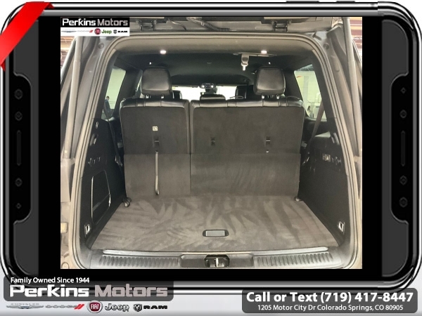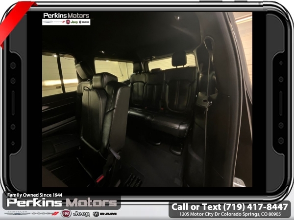 Diamond Black Crystal Pearlcoat 4WD 5.7L V8 8-Speed Automatic<br><br>Navigation System.<br><br><br>Clean CARFAX.<br><br>Check us out at www.perkinsmotors.com to see our specials! Since opening our doors in 1944, we’ve been proud to serve Colorado Springs, CO, and the surrounding areas of Pueblo, Castle Rock and Denver, CO. Throughout this time of being family owned for 80 years, we’ve maintained a firm commitment to our customers: to offer a wide selection of New Chrysler, Dodge, Fiat, Jeep, and Ram vehicles and quality pre-owned vehicles, and provide a quick, no-hassle car-buying process that ensures everyone drives off the lot satisfied with their purchase.<br><br><br>Quick Order Package 22J, Navigation System, 10 Speakers, 3.21 Rear Axle Ratio, 3rd row seats: bench, 4-Wheel Disc Brakes, ABS brakes, Adjustable pedals, Air Conditioning, Alloy wheels, AM/FM radio: SiriusXM with 360L, Anti-whiplash front head restraints, Audio memory, Auto-dimming door mirrors, Auto-dimming Rear-View mirror, Auto-leveling suspension, Automatic temperature control, Brake assist, Bumpers: body-color, Compass, Cruise Control, Delay-off headlights, Driver door bin, Driver vanity mirror, Driver's Seat Mounted Armrest, Dual front impact airbags, Dual front side impact airbags, Electronic Stability Control, Exterior Parking Camera Rear, Four wheel independent suspension, Front anti-roll bar, Front Bucket Seats, Front Center Armrest w/Storage, Front dual zone A/C, Front fog lights, Front reading lights, Fully automatic headlights, Garage door transmitter, Genuine wood console insert, Genuine wood dashboard insert, Genuine wood door panel insert, Heated door mirrors, Heated front seats, Heated steering wheel, Illuminated entry, Knee airbag, Leather Trimmed Bucket Seats, Low tire pressure warning, Memory seat, Normal Duty Suspension, Occupant sensing airbag, Outside temperature display, Overhead airbag, Overhead console, Panic alarm, Passenger door bin, Passenger seat mounted armrest, Passenger vanity mirror, Pedal memory, Power adjustable front head restraints, Power door mirrors, Power driver seat, Power Liftgate, Power passenger seat, Power steering, Power windows, Radio data system, Radio: Uconnect 5 Nav w/10.1 Display, Rain sensing wipers, Rear air conditioning, Rear anti-roll bar, Rear dual zone A/C, Rear reading lights, Rear seat center armrest, Rear window defroster, Rear window wiper, Reclining 3rd row seat, Remote keyless entry, Security system, Speed-sensing steering, Speed-Sensitive Wipers, Split folding rear seat, Steering wheel memory, Steering wheel mounted audio controls, Tachometer, Telescoping steering wheel, Tilt steering wheel, Traction control, Trip computer, Turn signal indicator mirrors, Variably intermittent wipers, Ventilated front seats, Voltmeter, and Wheels: 20 x 9.0 Aluminum Base Finish.