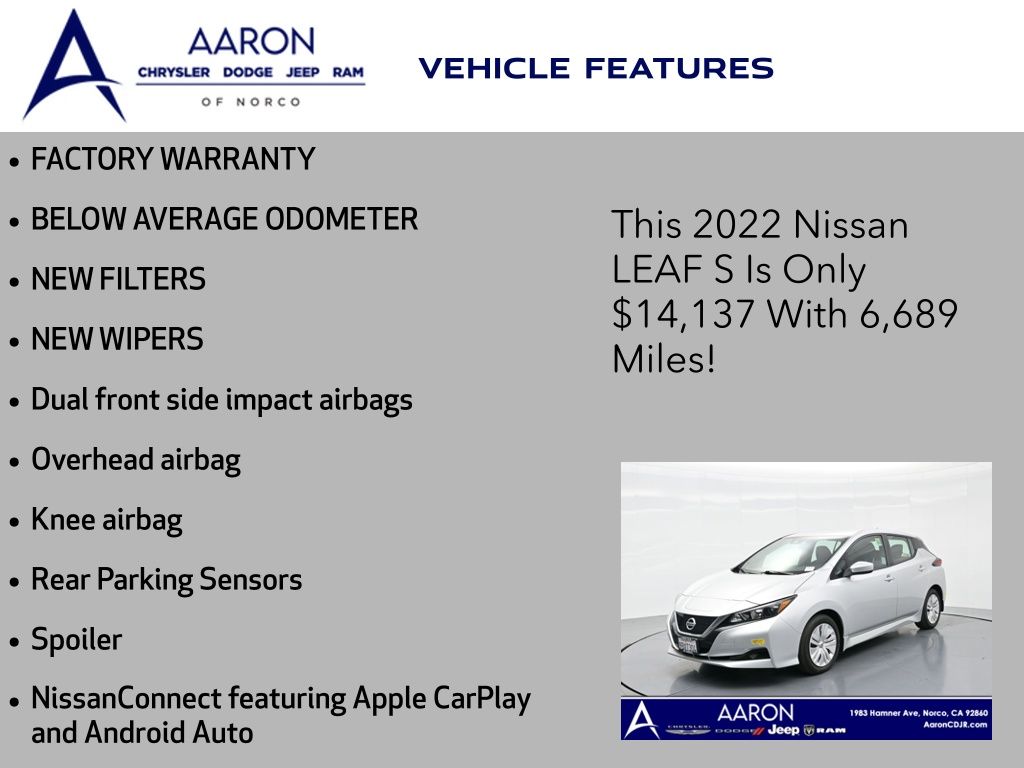 Priced below KBB Fair Purchase Price!FACTORY WARRANTY, BELOW AVERAGE ODOMETER, NEW FILTERS, NEW WIPERS, Leaf S, 4D Hatchback, Electric Motor, Single Speed Reducer, FWD, 16" Steel Wheels w/Covers, Dual front side impact airbags, Knee airbag, NissanConnect featuring Apple CarPlay and Android Auto, Overhead airbag, Rear Parking Sensors, Spoiler.CARFAX One-Owner.