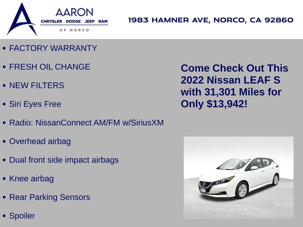 Priced below KBB Fair Purchase Price!FACTORY WARRANTY, FRESH OIL CHANGE, NEW FILTERS, Leaf S, 4D Hatchback, Electric Motor, FWD, 16" Steel Wheels w/Covers, Dual front side impact airbags, Knee airbag, NissanConnect featuring Apple CarPlay and Android Auto, Overhead airbag, Radio: NissanConnect AM/FM w/SiriusXM, Rear Parking Sensors, Siri Eyes Free, Spoiler.CARFAX One-Owner.
