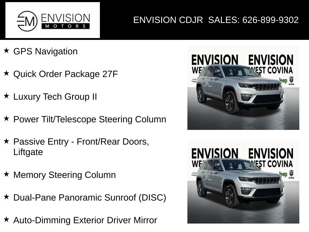 WE SPECIALIZE IN ALL CREDIT PROFILES! See what we can do for you! Call to find out (626) 899-9302.Certified.Odometer is 12544 miles below market average! 2.0L I4 DOHC, 4WD, 2nd-Row Manual Window Shades, Auto-Dimming Exterior Driver Mirror, Capri Leather Seats w/Perforated Inserts, Dual-Pane Panoramic Sunroof (DISC), GPS Navigation, Integrated Off-Road Camera, Intersection Collision Assist System, Luxury Tech Group II, Memory Steering Column, ParkSense Front/Rear Park Assist w/Stop, Passive Entry - Front/Rear Doors, Liftgate, Power Tilt/Telescope Steering Column, Quick Order Package 27F, Rain Sensitive Windshield Wipers, Rear Back Up Camera Washer, Rearview Autodim Digital Display Mirror, Surround View Camera System, Ventilated Front Seats, Wireless Charging Pad.Silver Zynith2022 Jeep Grand Cherokee 4xe 4WD 8-Speed Automatic 2.0L I4 DOHCFCA US LLC Certified Pre-Owned Details: * Vehicle History * Roadside Assistance * Limited Warranty: 3 Month/3,000 Mile (whichever comes first) after new car warranty expires or from certified purchase date * Transferable Warranty * 125 Point Inspection * Warranty Deductible: $100 * Vehicles Up to 75,000 Miles and/or 5 Model Years. 24-Hour Towing & Roadside Assistance, Car Rental Allowance, CARFAX® Vehicle History ReportTM and an Introductory 3-month Subscription to SiriusXM® Satellite Radio & Certified Warranty Upgrades * Powertrain Limited Warranty: 84 Month/100,000 Mile (whichever comes first) from original in-service date**********All Pricing and Advertised Prices for any/all vehicles offered for sale does not include dealer installed accessories which can be purchased for an additional cost.********** The Factory Rebates may not be available on this vehicle if you elect to take advantage of a Special Alternative APR or Special Lease program. Some Factory Rebates are California Resident specific and may vary for residents of other states. NO sales to Dealers, Brokers or Exporters. For out of state purchase, customers must be present to purchase. If shipping is required, dealership must facilitate; no exceptions. Please contact us for special Multi-Vehicle or Fleet pricing. Prices are plus government fees and taxes, any finance charges, $85 documentary fee, $29 electronic registration fee, any emission testing charge and $1.75 per new tire state tire fee. *** We make every effort to provide accurate information, but please verify before purchasing. Leasing & financing available on approved credit. Trade-ins accepted. Subject to prior sale.