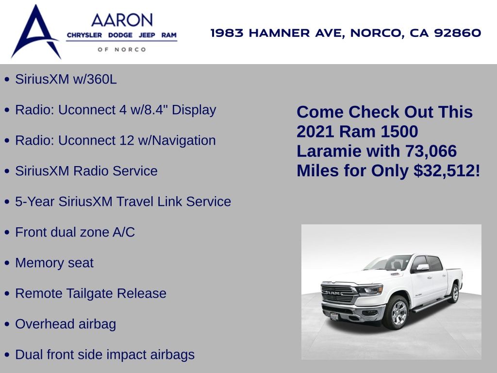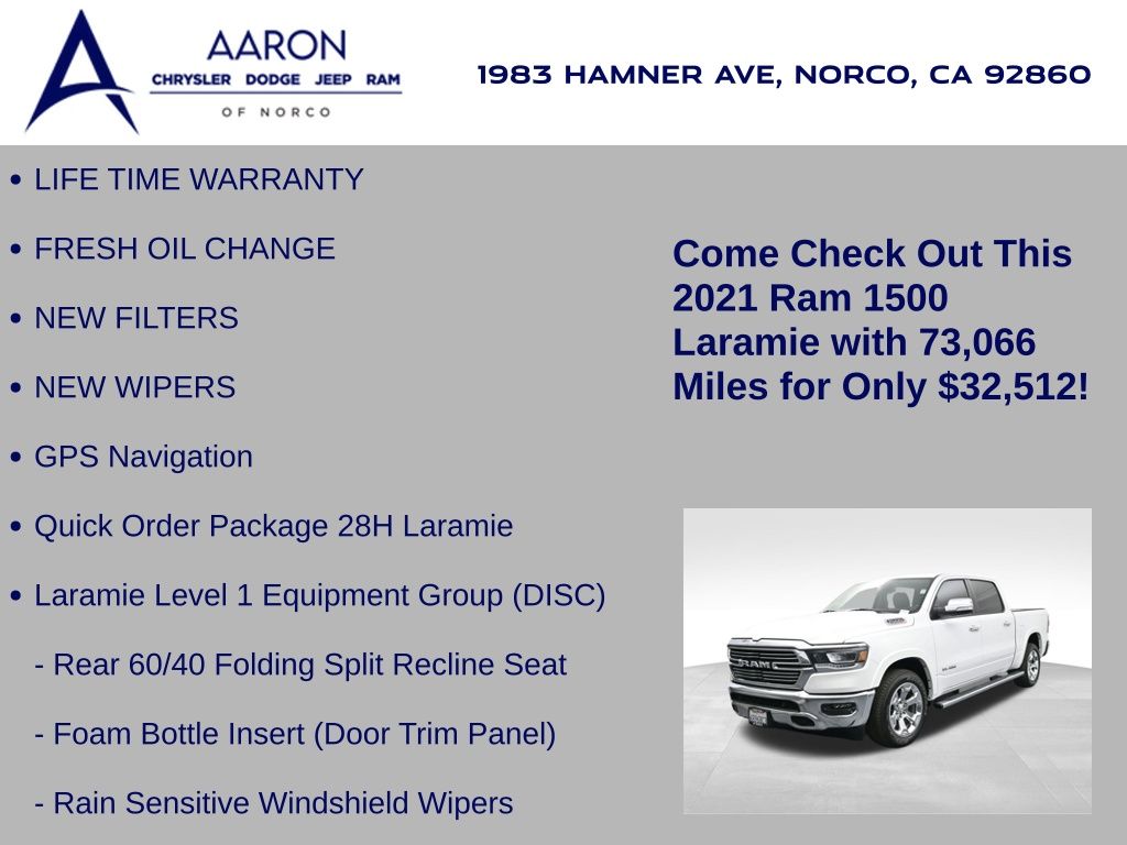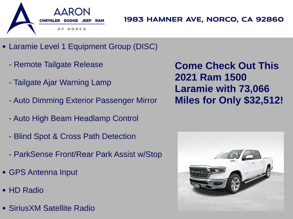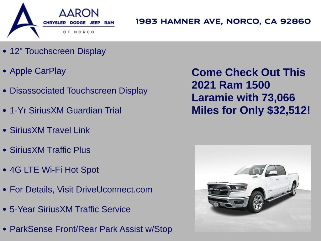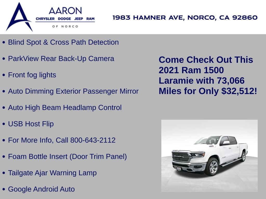 Priced below KBB Fair Purchase Price!LIFE TIME WARRANTY, FRESH OIL CHANGE, NEW FILTERS, NEW WIPERS, 1500 Laramie, 4D Crew Cab, EcoDiesel 3.0L V6, 8-Speed Automatic, RWD, 1-Yr SiriusXM Guardian Trial, 12" Touchscreen Display, 4G LTE Wi-Fi Hot Spot, 5-Year SiriusXM Traffic Service, 5-Year SiriusXM Travel Link Service, Alloy wheels, Apple CarPlay, Auto Dimming Exterior Passenger Mirror, Auto High Beam Headlamp Control, Blind Spot & Cross Path Detection, Disassociated Touchscreen Display, Dual front side impact airbags, Foam Bottle Insert (Door Trim Panel), For Details, Visit DriveUconnect.com, For More Info, Call 800-643-2112, Front dual zone A/C, Front fog lights, Google Android Auto, GPS Antenna Input, GPS Navigation, HD Radio, Integrated Center Stack Radio, Integrated Voice Command w/Bluetooth, Laramie Level 1 Equipment Group (DISC), Memory seat, Overhead airbag, ParkSense Front/Rear Park Assist w/Stop, ParkView Rear Back-Up Camera, Quick Order Package 28H Laramie, Radio: Uconnect 12 w/Navigation, Radio: Uconnect 4 w/8.4" Display, Rain Sensitive Windshield Wipers, Rear 60/40 Folding Split Recline Seat, Remote Tailgate Release, SiriusXM Radio Service, SiriusXM Satellite Radio, SiriusXM Traffic Plus, SiriusXM Travel Link, SiriusXM w/360L, Tailgate Ajar Warning Lamp, USB Host Flip, Ventilated Front Seats, Wheels: 20" x 9" Premium Paint/Polished.Clean CARFAX.Awards: * JD Power Automotive Performance, Execution and Layout (APEAL) Study * Motor Trend Automobiles of the year