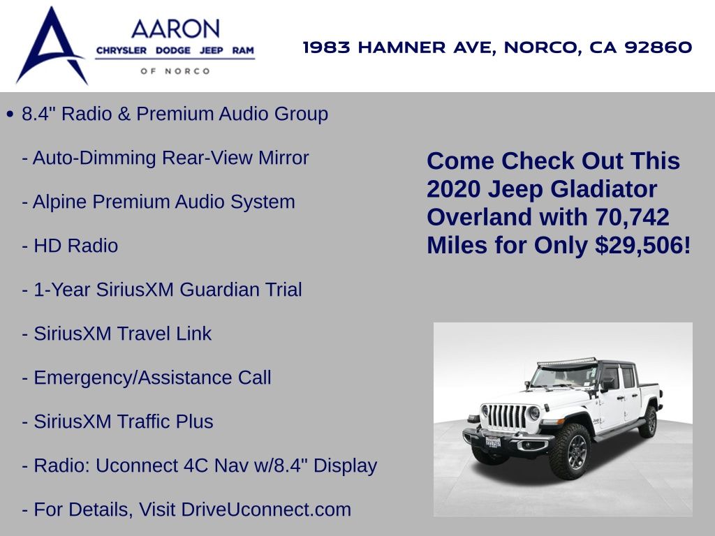 Priced below KBB Fair Purchase Price!LIFE TIME WARRANTY, FRESH OIL CHANGE, NEW FILTERS, NEW WIPERS, Gladiator Overland, 4D Crew Cab, 3.6L V6 24V VVT, 8-Speed Automatic, 4WD, 1-Year SiriusXM Guardian Trial, 240 Amp Alternator, 400W Inverter, 5-Year SiriusXM Traffic Service, 5-Year SiriusXM Travel Link Service, 700 Amp Maintenance Free Battery, 8.4" Radio & Premium Audio Group, Alloy wheels, Alpine Premium Audio System, Auto-Dimming Rear-View Mirror, Auxiliary Switch Group, Auxiliary Switches, Black 3-Piece Hard Top, Cargo Group w/Trail Rail System, Class IV Hitch Receiver, Cold Weather Group, Compass, Daytime Running Lamps LED Accents, Dual front side impact airbags, Emergency/Assistance Call, Exterior 115V AC Outlet, For Details, Visit DriveUconnect.com, Freedom Panel Storage Bag, Front dual zone A/C, Front fog lights, Front LED Fog Lamps, HD Radio, Heated Front Seats, Heated Steering Wheel, Heavy-Duty Engine Cooling, LED Lighting Group, LED Park Turn Lamps, LED Reflector Headlamps, LED Taillamps, Lockable Rear Underseat Storage, No Soft Top, ParkView Rear Back-Up Camera, Quick Order Package 24G, Radio: Uconnect 4C Nav w/8.4" Display, Rear Sliding Window, Rear Window Defroster, SiriusXM Traffic Plus, SiriusXM Travel Link, Trailer Hitch Zoom, Trailer Tow Package.Clean CARFAX.Awards: * NACTOY 2020 North American Truck of the Year * 2020 KBB.com 10 Favorite New-for-2020 Cars