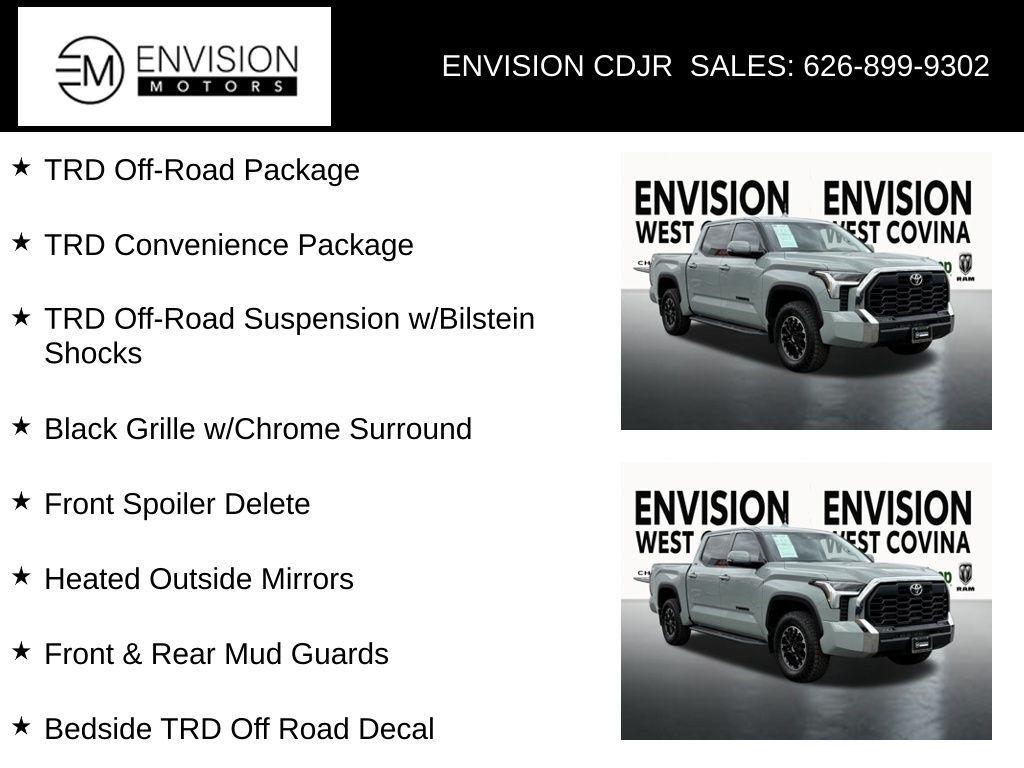 WE SPECIALIZE IN ALL CREDIT PROFILES! See what we can do for you! Call to find out (626) 899-9302.CARFAX One-Owner.Odometer is 1274 miles below market average! 4WD, Black w/Fabric Seat Trim or SofTex Seat Trim, 32 Gallon Fuel Tank, Bedside TRD Off Road Decal, Black Grille w/Chrome Surround, Blind Spot Monitor w/Lane Change Assist, Front & Rear Mud Guards, Front Spoiler Delete, Heated Outside Mirrors, Parking Support Alert/Brake, TRD Convenience Package, TRD Off-Road Package, TRD Off-Road Suspension w/Bilstein Shocks, Wheels: 20" Black Alloy.Lunar Rock2022 Toyota Tundra SR5 4WD 10-Speed Automatic 3.4L V6**********All Pricing and Advertised Prices for any/all vehicles offered for sale does not include dealer installed accessories which can be purchased for an additional cost.********** The Factory Rebates may not be available on this vehicle if you elect to take advantage of a Special Alternative APR or Special Lease program. Some Factory Rebates are California Resident specific and may vary for residents of other states. NO sales to Dealers, Brokers or Exporters. For out of state purchase, customers must be present to purchase. If shipping is required, dealership must facilitate; no exceptions. Please contact us for special Multi-Vehicle or Fleet pricing. Prices are plus government fees and taxes, any finance charges, $85 documentary fee, $29 electronic registration fee, any emission testing charge and $1.75 per new tire state tire fee. *** We make every effort to provide accurate information, but please verify before purchasing. Leasing & financing available on approved credit. Trade-ins accepted. Subject to prior sale.Awards: * ALG Residual Value Awards, Residual Value Awards