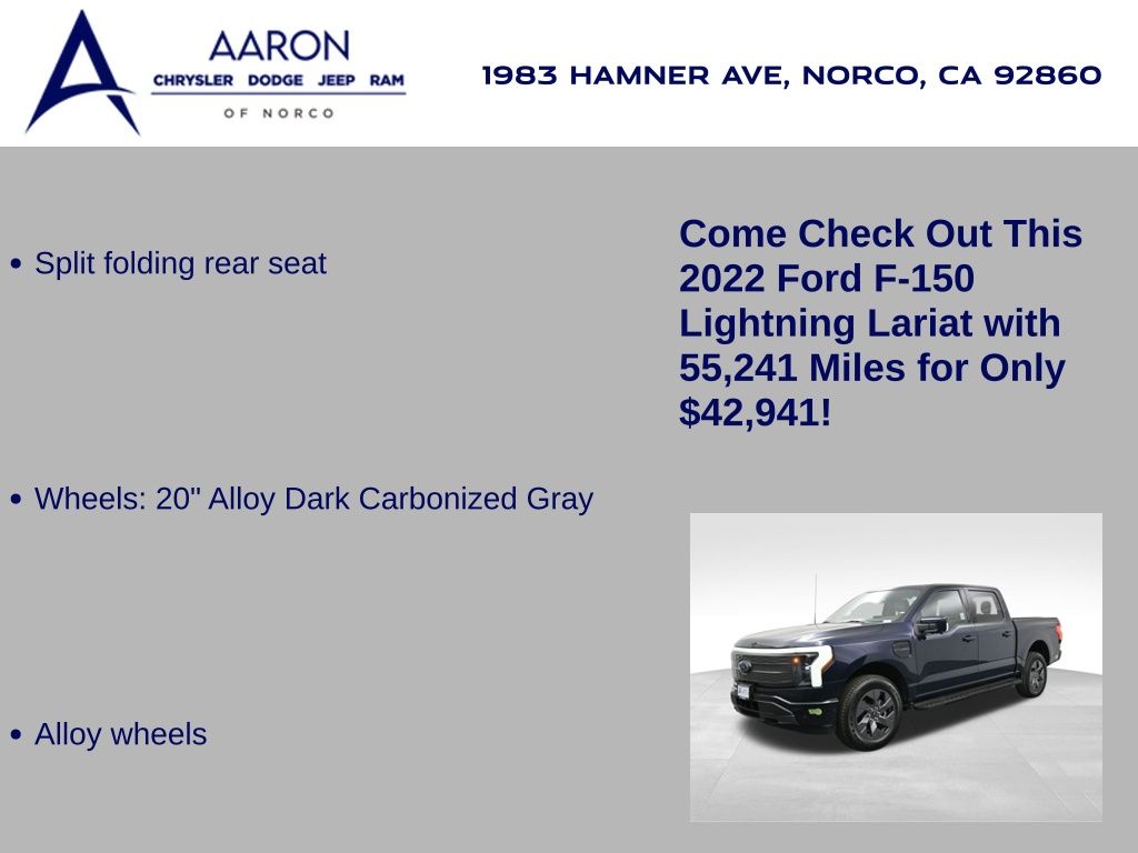 FACTORY WARRANTY, NEW FILTERS, NEW WIPERS, F-150 Lightning Lariat, 4D Crew Cab, Electric Motor, Single-Speed Automatic, AWD, Alloy wheels, Dual front side impact airbags, Front dual zone A/C, Knee airbag, Navigation system: Connected Navigation (3-year trial), Overhead airbag, Rear step bumper, Split folding rear seat, Tough Bed Spray-In Bedliner, Wheels: 20" Alloy Dark Carbonized Gray.Clean CARFAX.