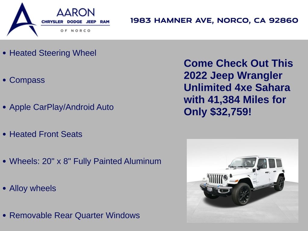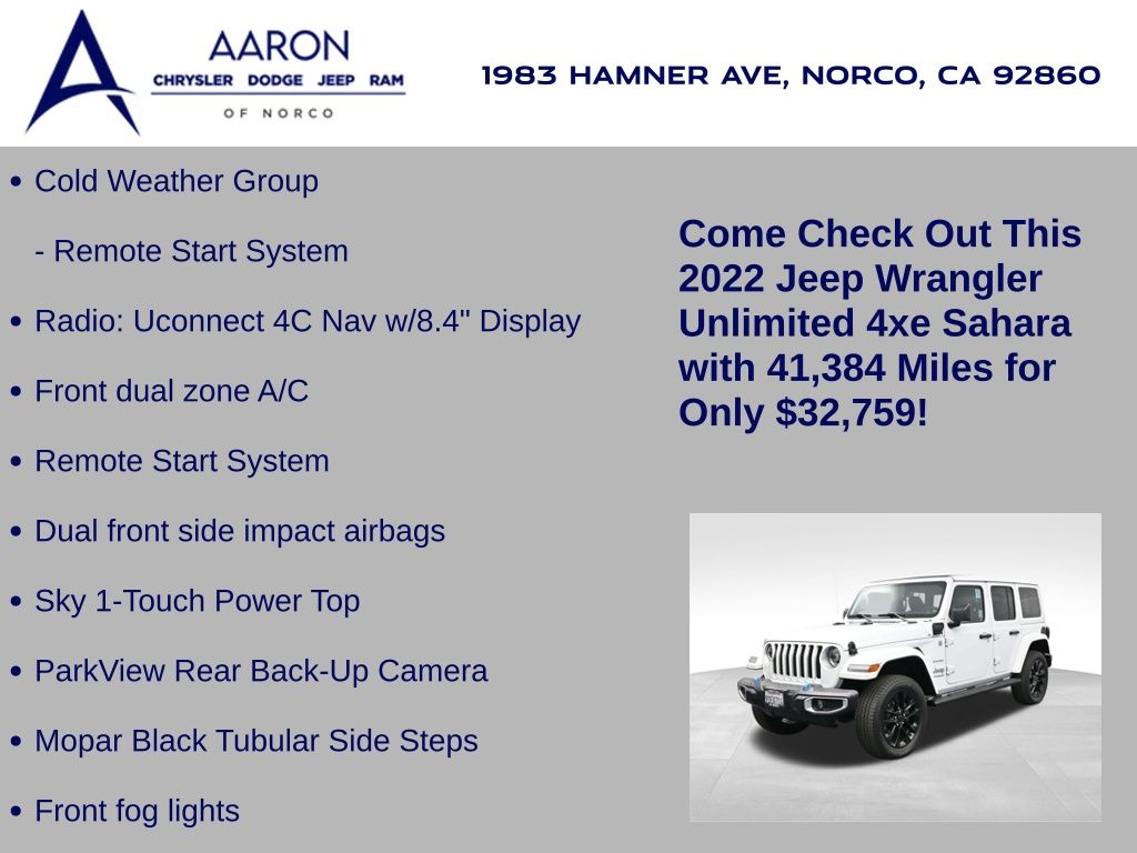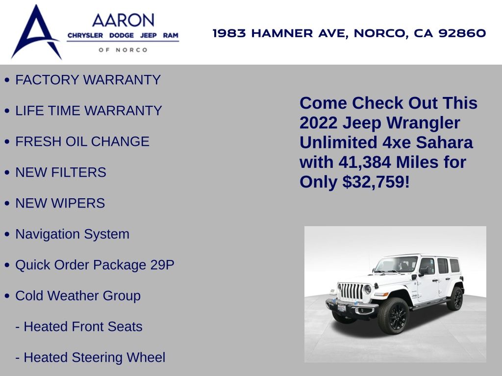 Priced below KBB Fair Purchase Price!FACTORY WARRANTY, LIFE TIME WARRANTY, FRESH OIL CHANGE, NEW FILTERS, NEW WIPERS, Wrangler Unlimited Sahara 4xe, 4D Sport Utility, 2.0L I4 DOHC, 8-Speed Automatic, 4WD, Alloy wheels, Apple CarPlay/Android Auto, Cold Weather Group, Compass, Dual front side impact airbags, Front dual zone A/C, Front fog lights, Heated Front Seats, Heated Steering Wheel, Mopar Black Tubular Side Steps, Navigation System, ParkView Rear Back-Up Camera, Power Top Quarter Window Storage Bag, Quick Order Package 29P, Radio: Uconnect 4C Nav w/8.4" Display, Remote Start System, Removable Rear Quarter Windows, Sky 1-Touch Power Top, Wheels: 20" x 8" Fully Painted Aluminum.Clean CARFAX.CARFAX One-Owner.