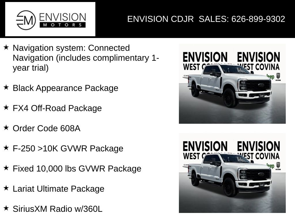 WE SPECIALIZE IN ALL CREDIT PROFILES! See what we can do for you! Call to find out (626) 899-9302.Clean CARFAX.Odometer is 3039 miles below market average! 4WD, 4-Way Adjustable Headrests, 6" Ebony Black Angular Running Boards, Black Appearance Package, Body Color Front & Rear Bumpers, Ebony Black Painted Front Grille Bars, Ebony Black Painted Mirror Caps, F-250 >10K GVWR Package, Fixed 10,000 lbs GVWR Package, Front Sensing System, FX4 Off-Road Package, Head-Up Display, Hill Descent Control, Intelligent Adaptive Cruise Control w/Stop-and-Go, Lariat Ultimate Package, Navigation system: Connected Navigation (includes complimentary 1-year trial), Off-Road Specifically Tuned Shock Absorbers, Order Code 608A, Pro Trailer Backup Assist, Pro Trailer Hitch Assist, Radio: B&O Sound System by Bang & Olufsen, Radio: B&O Unleashed Sound System by Bang & Olufsen, Rear Wheel Well Liners (Pre-Installed), SiriusXM Radio w/360L, SYNC 4 w/Enhanced Voice Recognition, Tailgate Step & Handle, Tough Bed Spray-In Bedliner, Twin Panel Power Moonroof, Unique FX4 Off-Road Box Decal, Upfitter Switches (6), Wheels: 20" Machined & Ebony Black High Gloss, Wireless Charging Pad.Star White Metallic Tri-Coat2024 Ford F-250SD Lariat 4WD 10-Speed Automatic Power Stroke 6.7L V8 DI 32V OHV Turbodiesel**********All Pricing and Advertised Prices for any/all vehicles offered for sale does not include dealer installed accessories which can be purchased for an additional cost.********** The Factory Rebates may not be available on this vehicle if you elect to take advantage of a Special Alternative APR or Special Lease program. Some Factory Rebates are California Resident specific and may vary for residents of other states. NO sales to Dealers, Brokers or Exporters. For out of state purchase, customers must be present to purchase. If shipping is required, dealership must facilitate; no exceptions. Please contact us for special Multi-Vehicle or Fleet pricing. Prices are plus government fees and taxes, any finance charges, $85 documentary fee, $29 electronic registration fee, any emission testing charge and $1.75 per new tire state tire fee. *** We make every effort to provide accurate information, but please verify before purchasing. Leasing & financing available on approved credit. Trade-ins accepted. Subject to prior sale.