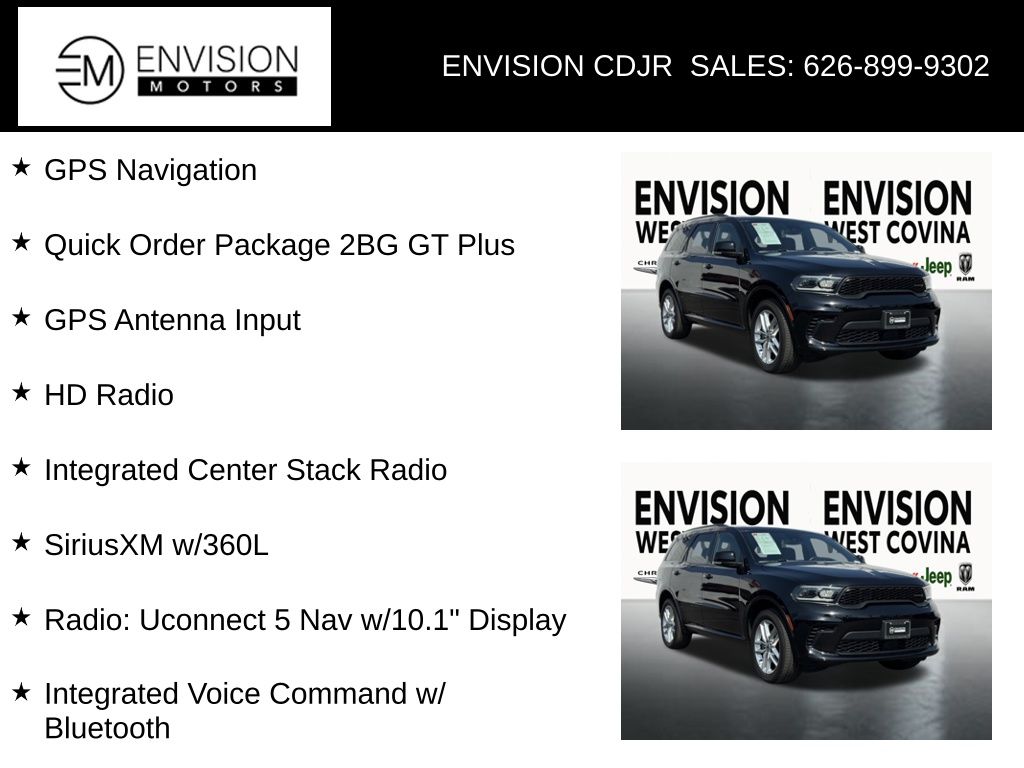 WE SPECIALIZE IN ALL CREDIT PROFILES! See what we can do for you! Call to find out (626) 899-9302.Certified. Clean CARFAX.Odometer is 3532 miles below market average! AWD, 1-Year Trial (Registration Required), 10.1" Touchscreen Display, 115V Auxiliary Power Outlet, 180 Amp Alternator, 4G LTE Wi-Fi Hot Spot, 7 & 4 Pin Wiring Harness, Adaptive Cruise Control w/Stop, Apple CarPlay, Auto-Dimming Exterior Driver Mirror, Black Roof Rails, Blind Spot w/Trailer Detection, Class IV Receiver Hitch, Connected Travel & Traffic Services, Disassociated Touchscreen Display, Dual Remote USB Port - Charge Only, Exterior Mirrors w/Heating Element, Exterior Mirrors w/Memory, Exterior Mirrors w/Supplemental Signals, Floor Console w/Leather Armrest, For Details Visit DriveUconnect.com, Full Speed Forward Collision Warning Plus, Global Telematics Box Module (TBM), Gloss Black Exterior Mirrors, Google Android Auto, GPS Antenna Input, GPS Navigation, HD Radio, Heated Second Row Seats, Heavy-Duty Engine Cooling, Integrated Center Stack Radio, Integrated Roof Rail Crossbars, Integrated Voice Command w/Bluetooth, Leather Trimmed Bucket Seats, Leather Wrapped Door Panels, LED Auxiliary Low Beam & Turn Signal, Power 6x9 Multi-Function Foldaway Mirrors, Power 8-Way Driver Memory 8-Way Passenger Seats, Power Driver/Passenger 4-Way Lumbar Adjust, Power Sunroof, Power Tilt & Telescopic Steering Column, Quick Order Package 2BG GT Plus, Radio: Uconnect 5 Nav w/10.1" Display, Radio/Driver Seat/Mirrors Memory, Rear Load Leveling Suspension, Red Accent Stitching, SiriusXM Guardian - Included Trial (B), SiriusXM w/360L, Trailer Brake Control, USB Host Flip, Ventilated Front Seats.DB Black Crystal Clearcoat2024 Dodge Durango GT Plus AWD 8-Speed Automatic 3.6L V6 24V VVTFCA US LLC Certified Pre-Owned Details: * Roadside Assistance * Transferable Warranty * Limited Warranty: 3 Month/3,000 Mile (whichever comes first) after new car warranty expires or from certified purchase date * 125 Point Inspection * Vehicle History * Powertrain Limited Warranty: 84 Month/100,000 Mile (whichever comes first) from original in-service date * Vehicles Up to 75,000 Miles and/or 5 Model Years. 24-Hour Towing & Roadside Assistance, Car Rental Allowance, CARFAX® Vehicle History ReportTM and an Introductory 3-month Subscription to SiriusXM® Satellite Radio & Certified Warranty Upgrades * Warranty Deductible: $100**********All Pricing and Advertised Prices for any/all vehicles offered for sale does not include dealer installed accessories which can be purchased for an additional cost.********** The Factory Rebates may not be available on this vehicle if you elect to take advantage of a Special Alternative APR or Special Lease program. Some Factory Rebates are California Resident specific and may vary for residents of other states. NO sales to Dealers, Brokers or Exporters. For out of state purchase, customers must be present to purchase. If shipping is required, dealership must facilitate; no exceptions. Please contact us for special Multi-Vehicle or Fleet pricing. Prices are plus government fees and taxes, any finance charges, $85 documentary fee, $29 electronic registration fee, any emission testing charge and $1.75 per new tire state tire fee. *** We make every effort to provide accurate information, but please verify before purchasing. Leasing & financing available on approved credit. Trade-ins accepted. Subject to prior sale.