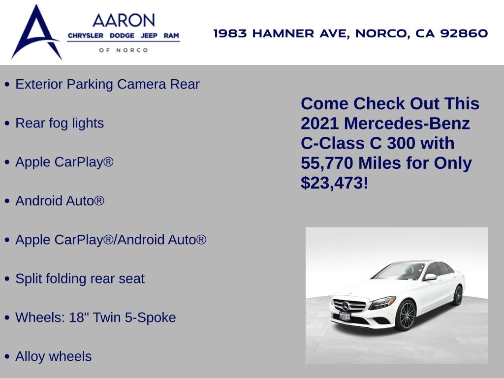 Priced below KBB Fair Purchase Price!FRESH OIL CHANGE, NEW FILTERS, NEW WIPERS, C 300, 4D Sedan, 2.0L I4 Turbocharged, 9-Speed Automatic, RWD, Alloy wheels, Android Auto®, Apple CarPlay®, Apple CarPlay®/Android Auto®, Dual front side impact airbags, Exterior Parking Camera Rear, Front dual zone A/C, Knee airbag, Memory seat, Overhead airbag, Power moonroof, Rear fog lights, Smartphone Integration, Split folding rear seat, Wheels: 18" Twin 5-Spoke.Clean CARFAX.