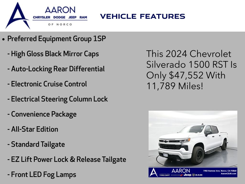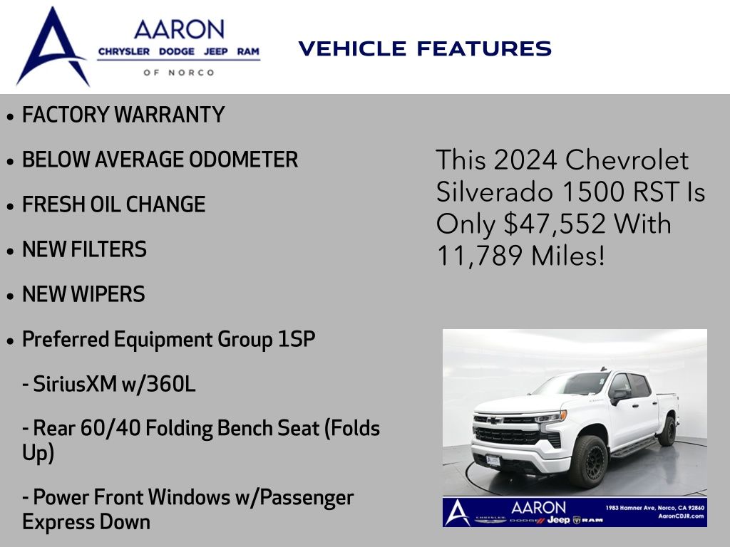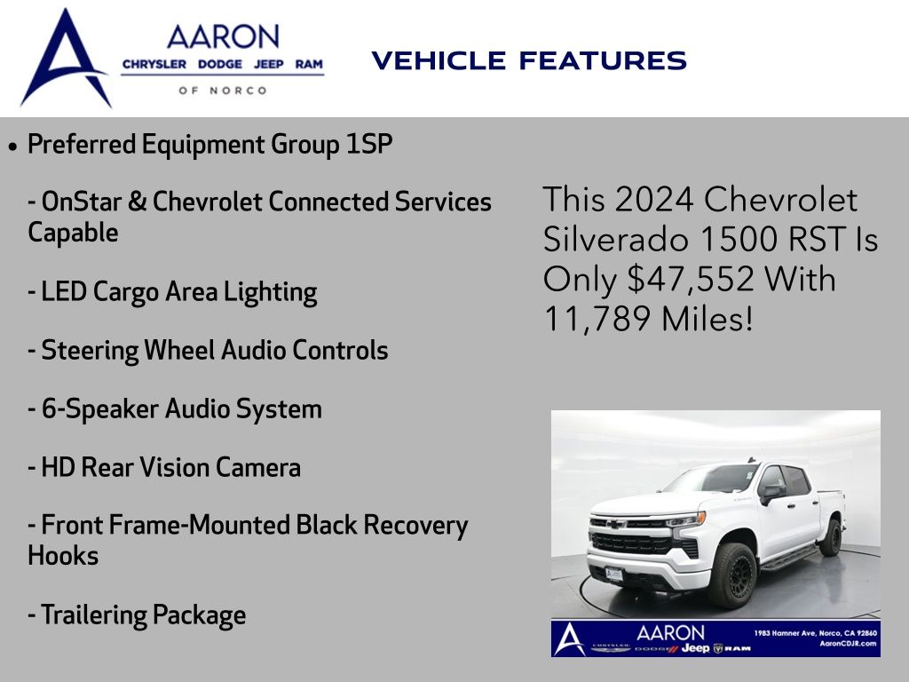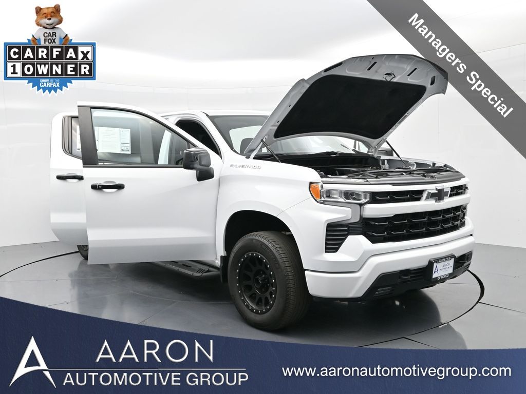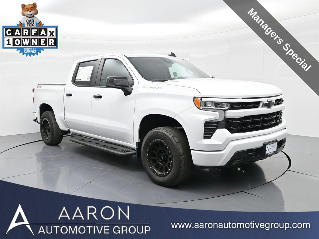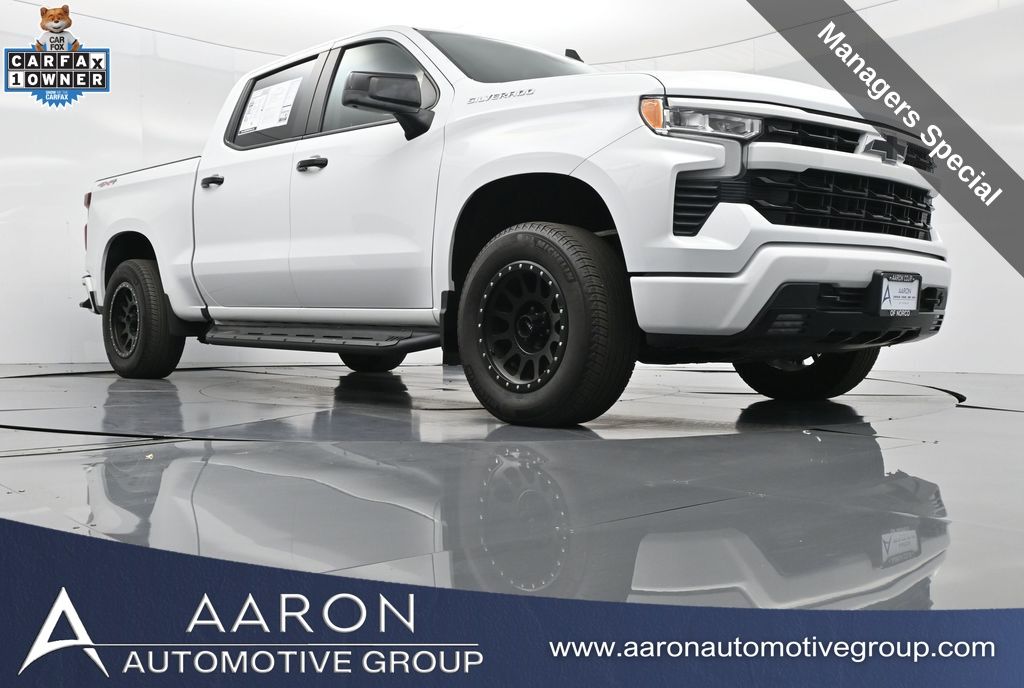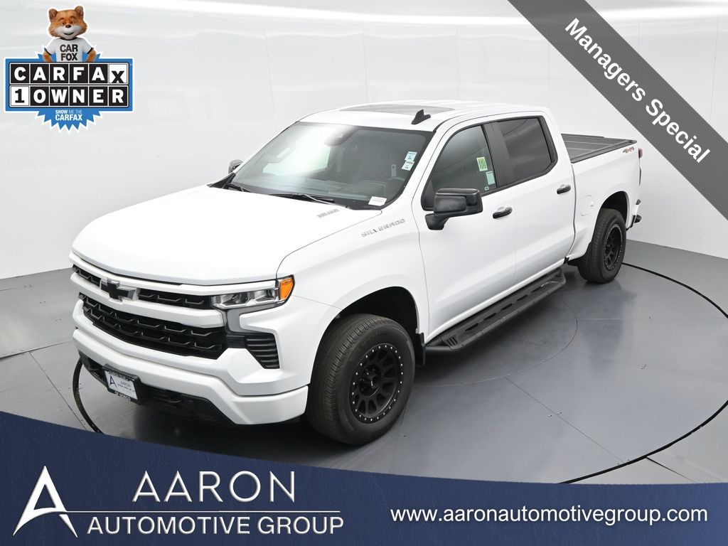 Priced below KBB Fair Purchase Price!FACTORY WARRANTY, BELOW AVERAGE ODOMETER, FRESH OIL CHANGE, NEW FILTERS, NEW WIPERS, Silverado 1500 RST, 4D Crew Cab, 3.0L I6, 10-Speed Automatic, 4WD, Black Cloth, 10-Way Power Driver Seat w/Lumbar, 12.3" Multicolor Reconfigurable Digital Display, 2 USB Data Ports, All-Star Edition, All-Weather Floor Liner (LPO), Chevrolet Connected Access Capable, Color-Keyed Carpeting Floor Covering, Convenience Package, Convenience Package II, Deep-Tinted Glass, Dual front side impact airbags, Dual Rear USB Ports (Charge Only), Dual-Zone Automatic Climate Control, Electronic Cruise Control, EZ Lift Power Lock & Release Tailgate, Forward Collision Alert, Front Frame-Mounted Black Recovery Hooks, Front LED Fog Lamps, Front Rubberized Vinyl Floor Mats, HD Rear Vision Camera, Heated Driver & Front Outboard Passenger Seats, Heated Power-Adjustable Outside Mirrors, Heated Steering Wheel, High Gloss Black Mirror Caps, Hitch Guidance, Hitch Guidance w/Hitch View, In-Vehicle Trailering System App, Inside Rear-View Mirror w/Tilt, Integrated Trailer Brake Controller, Keyless Open & Start, LED Cargo Area Lighting, Liner Protection Package (LPO), OnStar & Chevrolet Connected Services Capable, Overhead airbag, Power Sliding Rear Window w/Rear Defogger, Power Sunroof, Preferred Equipment Group 1SP, Premium Bose 7-Speaker Sound System, Rear 60/40 Folding Bench Seat (Folds Up), Rear Rubberized-Vinyl Floor Mats, Rear Wheel House Liners (LPO), Remote keyless entry, Remote Vehicle Starter System, Standard Suspension Package, Standard Tailgate, Theft Deterrent System (Unauthorized Entry), Trailering Package, Universal Home Remote, Wheels: 18" x 8.5" Bright Silver Painted Aluminum, Wi-Fi Hot Spot Capable.Clean CARFAX.CARFAX One-Owner.