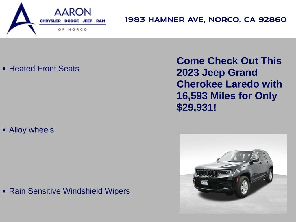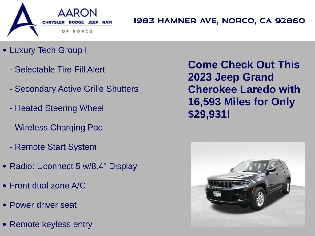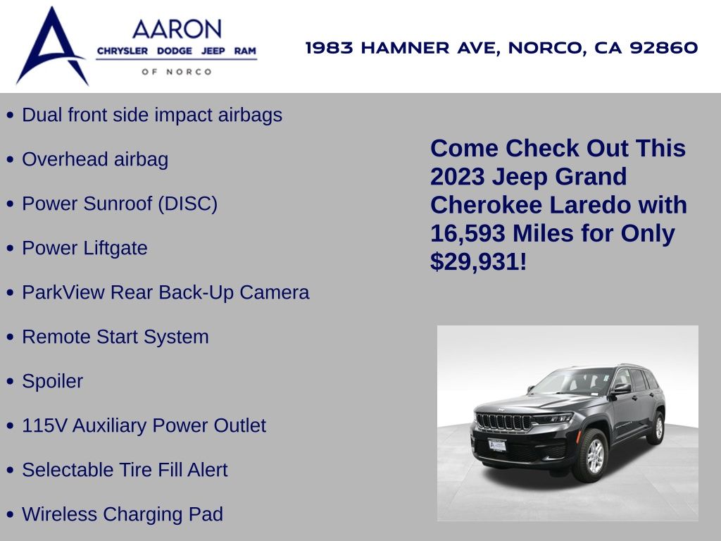 Priced below KBB Fair Purchase Price!LIFE TIME WARRANTY, FRESH OIL CHANGE, NEW FILTERS, NEW WIPERS, Grand Cherokee Laredo, 4D Sport Utility, 3.6L V6 24V VVT, 8-Speed Automatic, 4WD, 115V Auxiliary Power Outlet, Alloy wheels, Dual front side impact airbags, Front dual zone A/C, Heated Front Seats, Knee airbag, Luxury Tech Group I, Overhead airbag, ParkView Rear Back-Up Camera, Power driver seat, Power Liftgate, Power Sunroof (DISC), Quick Order Package 23A Laredo, Radio: Uconnect 5 w/8.4" Display, Rain Sensitive Windshield Wipers, Remote keyless entry, Remote Start System, Selectable Tire Fill Alert, Spoiler, Wireless Charging Pad.
