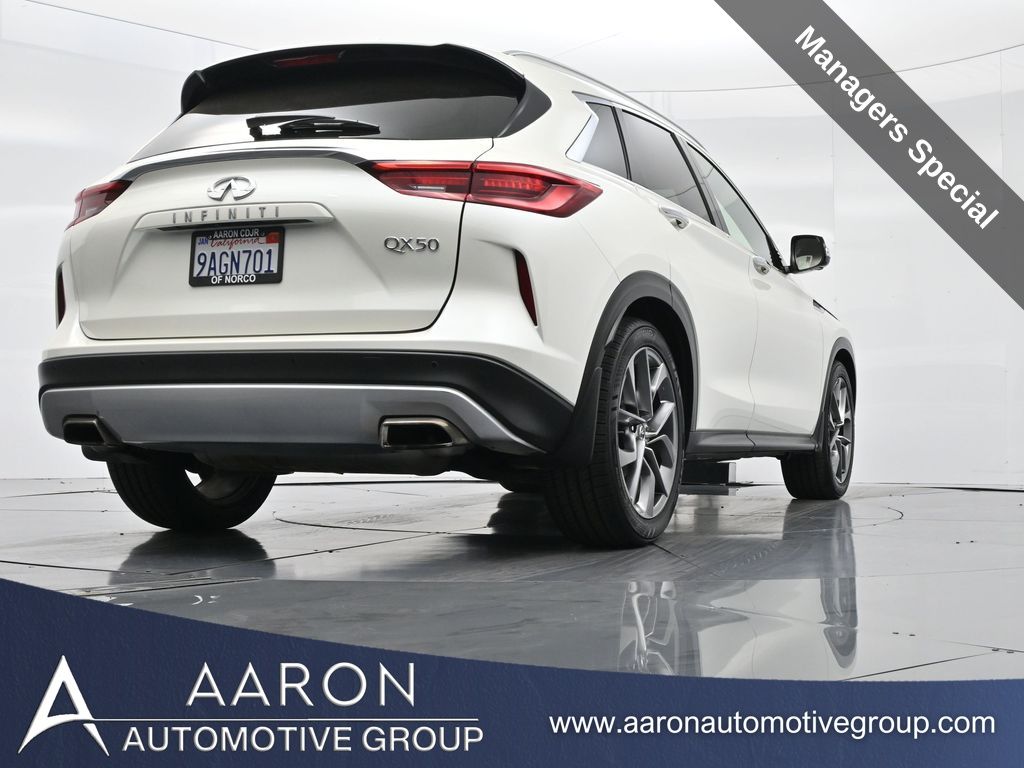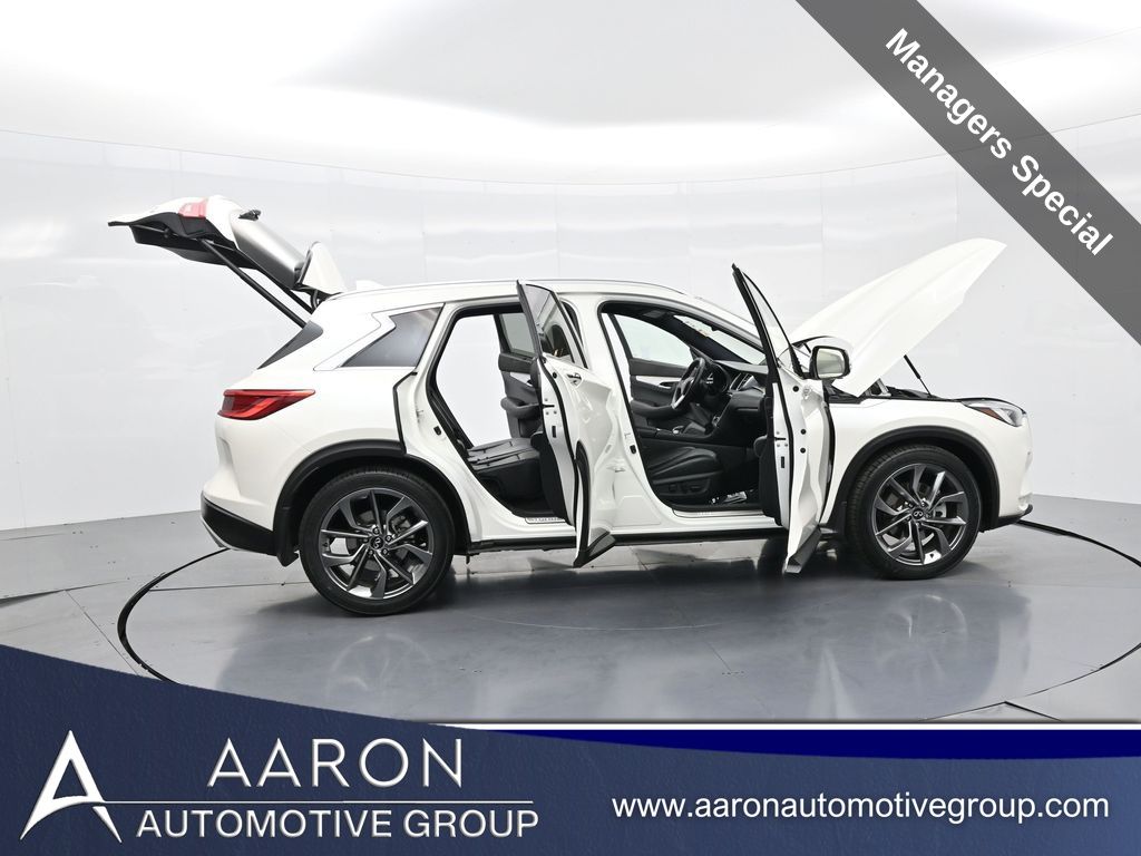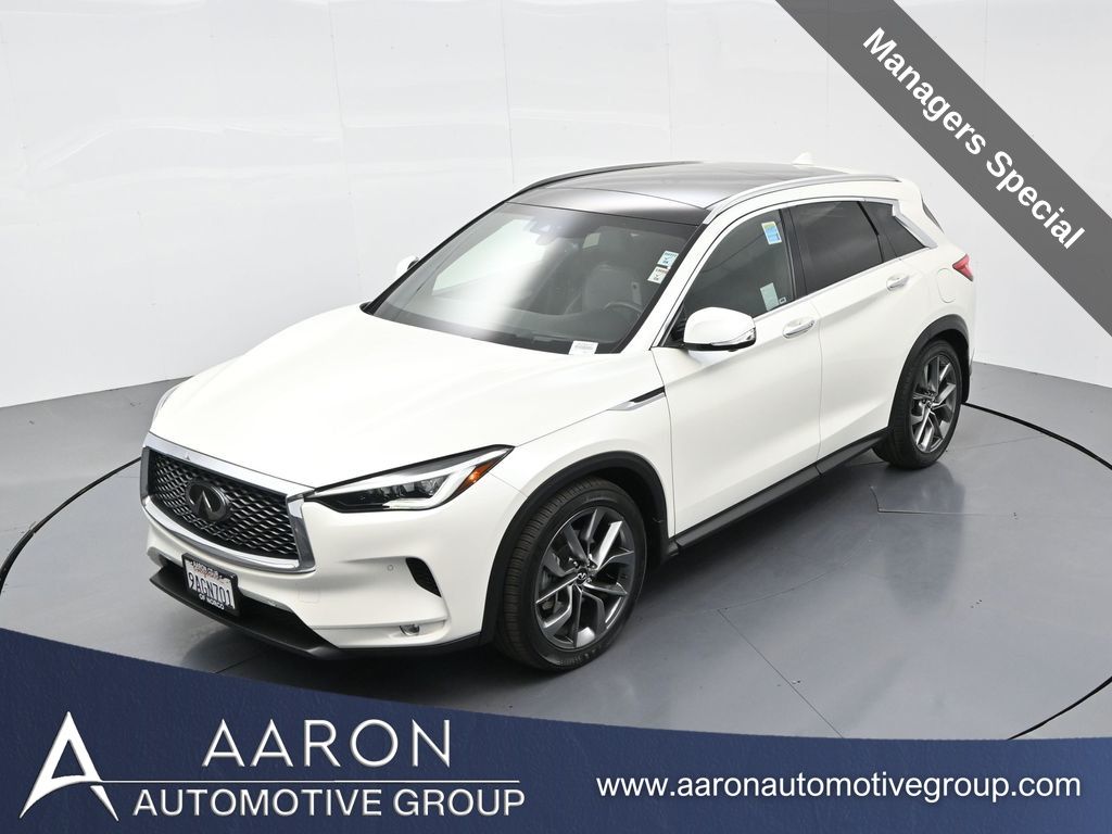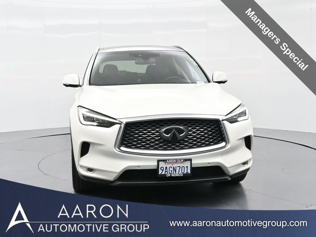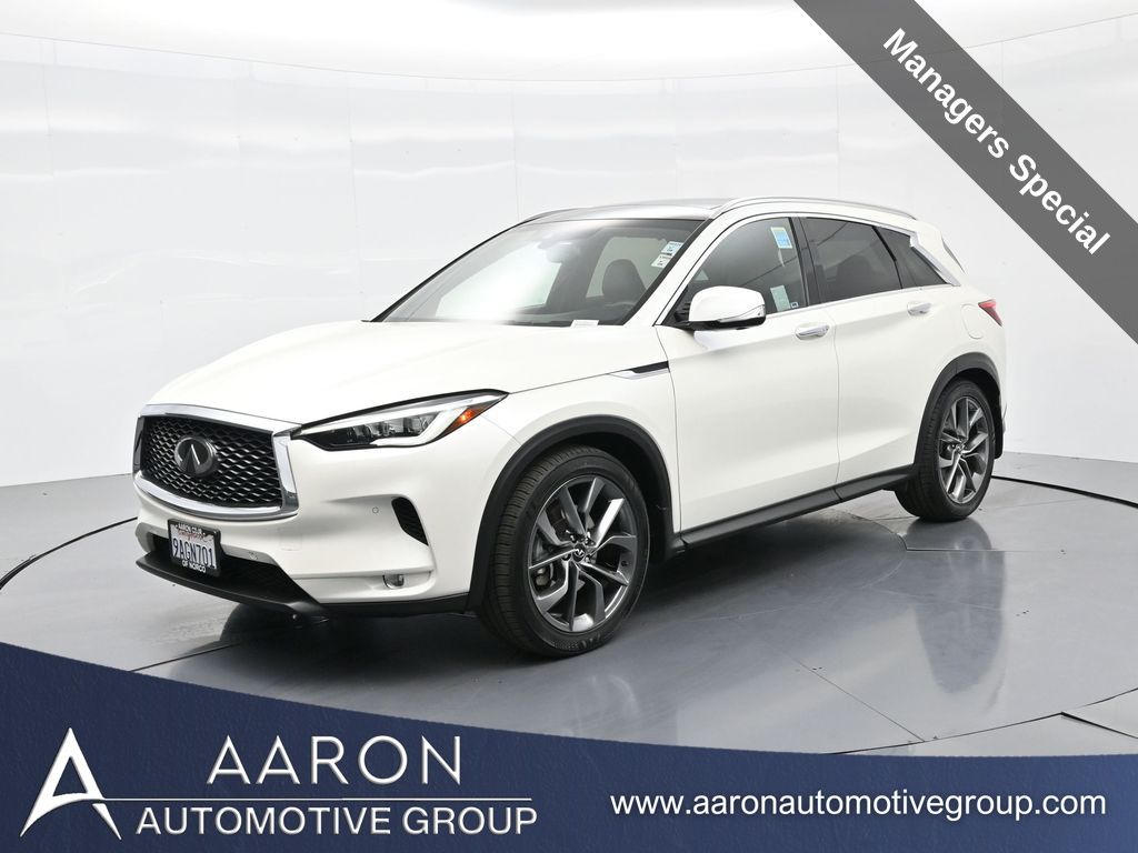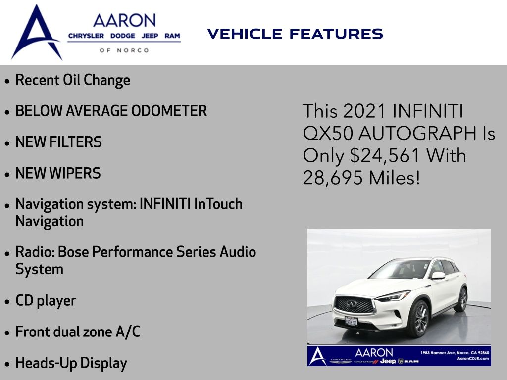 Elevate your everyday drive with this premium and tech-forward 2021 INFINITI QX50 AUTOGRAPH, the top-tier trim in INFINITIs luxury crossover lineupdesigned to deliver refined performance, premium materials, and advanced safety in a sleek and sporty package. With just 28,695 miles, this exceptionally maintained vehicle comes with a clean Carfax, no accidents, regular oil changes, and personal-use history, making it a smart and stylish choice for discerning drivers. Power comes from INFINITIs groundbreaking 2.0L VC-Turbo engine paired with a continuously variable transmission (CVT), offering smooth acceleration and an EPA-estimated 26 MPG combined (23 city / 29 highway). Finished in stunning Majestic White over a rich Graphite semi-aniline quilted leather interior, this AUTOGRAPH trim offers flagship-level luxury with premium features like black open-pore wood trim, tri-zone climate control, rear sunshades, and massaging climate-controlled front seats. A 16-speaker Bose Performance Series audio system, 9-inch upper and 8-inch lower dual HD displays, and Apple CarPlay/Android Auto integration keep you seamlessly connected, while ProPILOT Assist, adaptive cruise control, distance control assist, and head-up display enhance comfort and driver confidence. Safety features include Forward Emergency Braking with Pedestrian Detection, Predictive Forward Collision Warning, Blind Spot Warning and Intervention, Rear Cross Traffic Alert, Lane Departure Prevention, Around View Monitor, and Traffic Sign Recognitionensuring total peace of mind. This QX50 also features 20-inch dark-painted wheels, LED headlights with signature DRLs, power panoramic moonroof, motion-activated liftgate, and Welcome Lighting Package to round out its premium appeal. Backed by INFINITIs 4-year/60,000-mile basic warranty and 6-year/70,000-mile powertrain coverage, this AUTOGRAPH model delivers world-class luxury, intelligent engineering, and elegant style in one premium crossover. Don't miss the opportunity to drive one of the most fully loaded and low-mileage QX50s on the market. Schedule your test drive today before its gone.