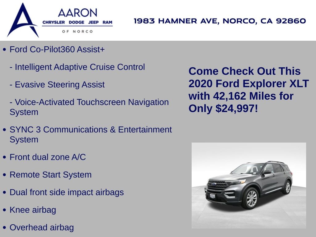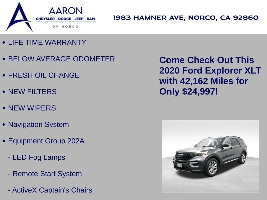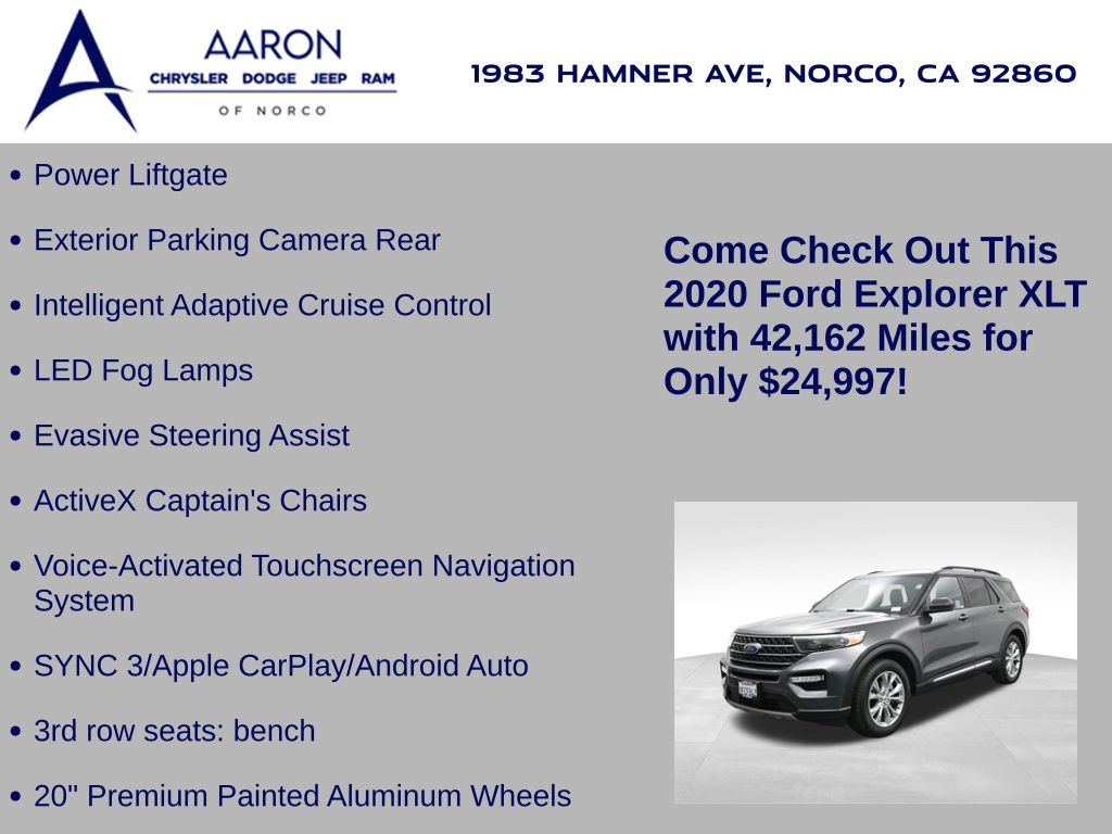 Priced below KBB Fair Purchase Price!LIFE TIME WARRANTY, BELOW AVERAGE ODOMETER, FRESH OIL CHANGE, NEW FILTERS, NEW WIPERS, Explorer XLT, 4D Sport Utility, 2.3L EcoBoost I-4, 10-Speed Automatic, RWD, 20" Premium Painted Aluminum Wheels, 3rd row seats: bench, ActiveX Captain's Chairs, Dual front side impact airbags, Equipment Group 202A, Evasive Steering Assist, Exterior Parking Camera Rear, Ford Co-Pilot360 Assist+, Front dual zone A/C, Intelligent Adaptive Cruise Control, Knee airbag, LED Fog Lamps, Navigation System, Overhead airbag, Power Liftgate, Remote Start System, SYNC 3 Communications & Entertainment System, SYNC 3/Apple CarPlay/Android Auto, Voice-Activated Touchscreen Navigation System.Awards: * 2020 KBB.com 10 Favorite New-for-2020 Cars * 2020 KBB.com 10 Best SUVs Worth Waiting For