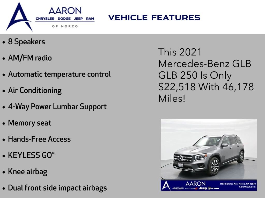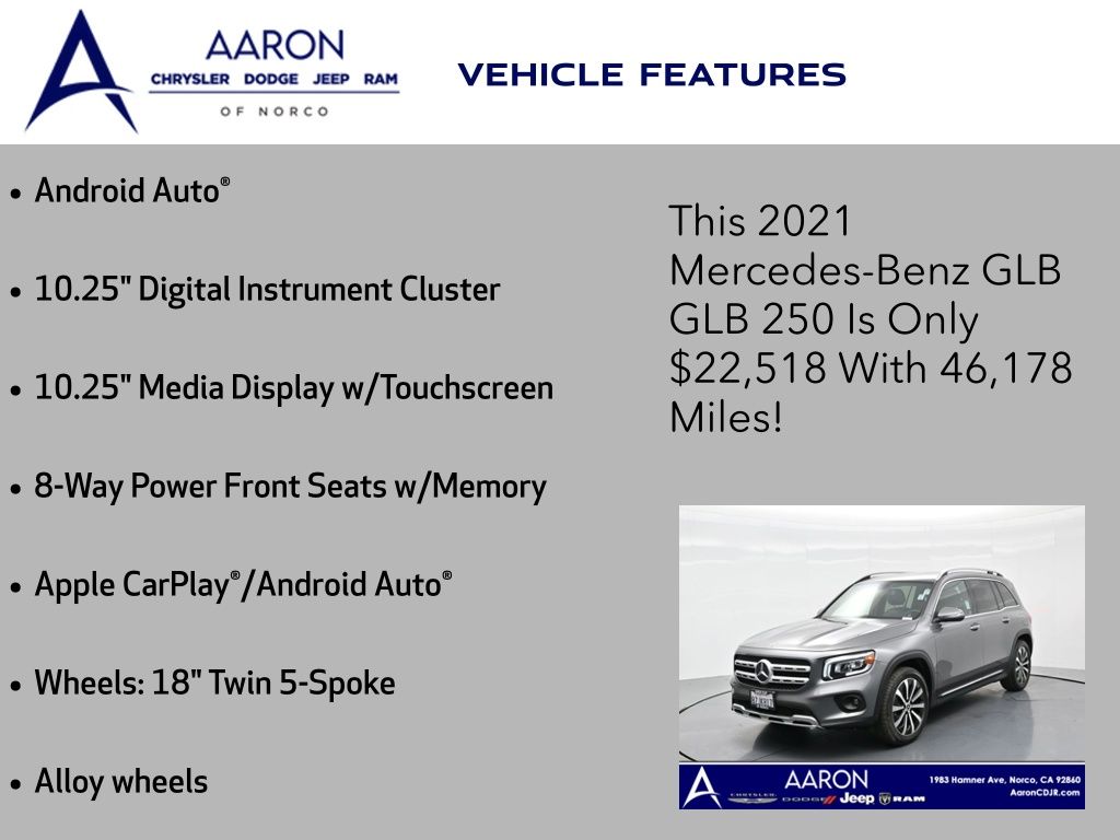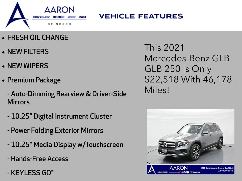 Priced below KBB Fair Purchase Price!FRESH OIL CHANGE, NEW FILTERS, NEW WIPERS, GLB GLB 250, 4D Sport Utility, 2.0L I4 DI Turbocharged, 8-Speed Automatic, FWD, 10.25" Digital Instrument Cluster, 10.25" Media Display w/Touchscreen, 4-Way Power Lumbar Support, 8 Speakers, 8-Way Power Front Seats w/Memory, Air Conditioning, Alloy wheels, AM/FM radio, Android Auto®, Apple CarPlay®/Android Auto®, Auto-Dimming Rearview & Driver-Side Mirrors, Automatic temperature control, Dual front side impact airbags, Exterior Parking Camera Rear, Front fog lights, Hands-Free Access, KEYLESS GO®, Knee airbag, Memory seat, Overhead airbag, Power Folding Exterior Mirrors, Power Liftgate, Premium Package, Rear fog lights, Roof rack: rails only, Smartphone Integration, Spoiler, Wheels: 18" Twin 5-Spoke.Clean CARFAX.