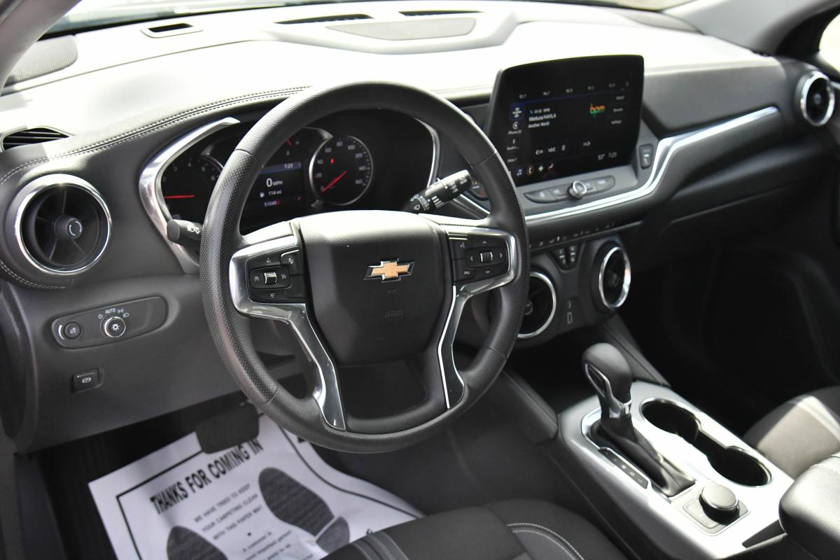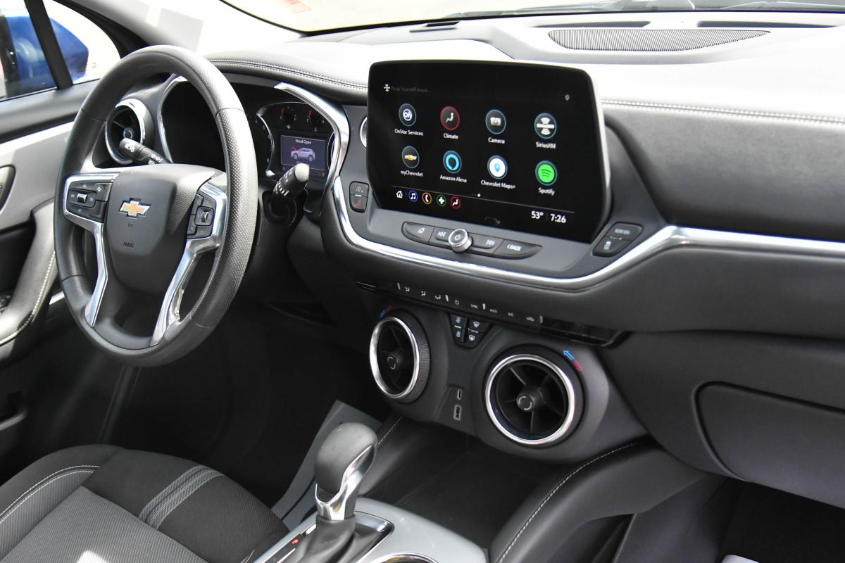 Delivers 27 Highway MPG and 22 City MPG! This Chevrolet Blazer boasts a Turbocharged Gas I4 2.0L/ engine powering this Automatic transmission. WHEELS, 18 (45.7 CM) GRAZEN METALLIC ALUMINUM (STD), TRANSMISSION, 9-SPEED AUTOMATIC, ELECTRONICALLY-CONTROLLED with overdrive, includes Driver Shift Control (STD), TIRES, P235/65R18 ALL-SEASON BLACKWALL (STD).*This Chevrolet Blazer Comes Equipped with These Options *LICENSE PLATE FRONT MOUNTING PACKAGE (will be forced on orders with ship-to states that require a front license plate) , SEATS, FRONT BUCKET (STD), LT PREFERRED EQUIPMENT GROUP Includes Standard Equipment, JET BLACK, PREMIUM CLOTH SEAT TRIM, ENGINE, 2.0L TURBO, 4-CYLINDER, SIDI DOHC WITH VARIABLE VALVE TIMING (VVT) with Stop/Start (228 hp (170 kW) at 5000 rpm, 258 lb-ft of torque [350 N-m]) @ 1500-4000 rpm) (STD), DELETED 3 YEARS OF REMOTE ACCESS, BLUE GLOW METALLIC, AXLE, 3.47 FINAL DRIVE RATIO, AUDIO SYSTEM, CHEVROLET INFOTAINMENT 3 PLUS SYSTEM 10.2 diagonal HD color touchscreen, AM/FM stereo, Bluetooth audio streaming for 2 active devices, Apple CarPlay and Android Auto capable, enhanced voice recognition, in-vehicle apps, cloud connected personalization for select infotainment and vehicle settings. Subscription required for enhanced and connected services after trial period. (STD), Wireless Apple CarPlay/Wireless Android Auto.