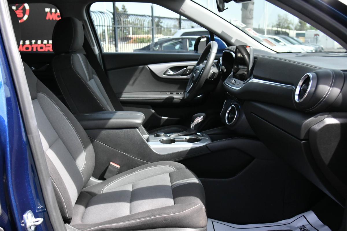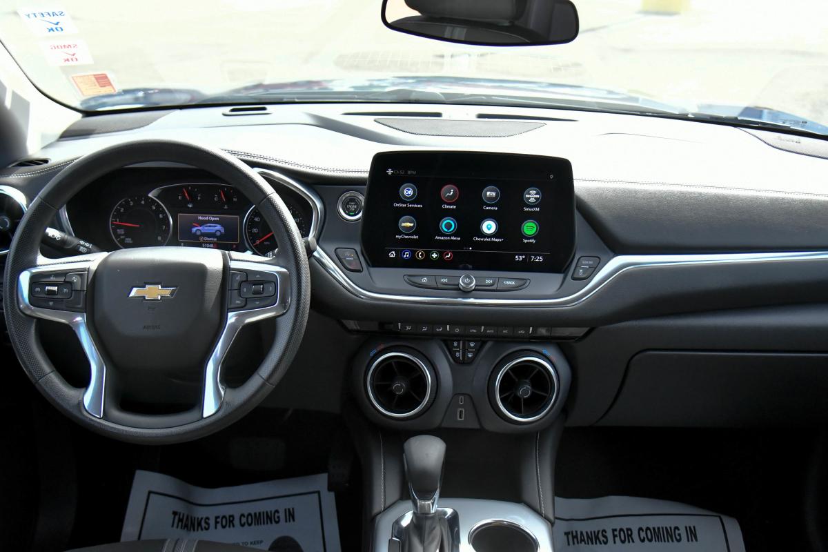 Delivers 27 Highway MPG and 22 City MPG! This Chevrolet Blazer boasts a Turbocharged Gas I4 2.0L/ engine powering this Automatic transmission. WHEELS, 18 (45.7 CM) GRAZEN METALLIC ALUMINUM (STD), TRANSMISSION, 9-SPEED AUTOMATIC, ELECTRONICALLY-CONTROLLED with overdrive, includes Driver Shift Control (STD), TIRES, P235/65R18 ALL-SEASON BLACKWALL (STD).*This Chevrolet Blazer Comes Equipped with These Options *LICENSE PLATE FRONT MOUNTING PACKAGE (will be forced on orders with ship-to states that require a front license plate) , SEATS, FRONT BUCKET (STD), LT PREFERRED EQUIPMENT GROUP Includes Standard Equipment, JET BLACK, PREMIUM CLOTH SEAT TRIM, ENGINE, 2.0L TURBO, 4-CYLINDER, SIDI DOHC WITH VARIABLE VALVE TIMING (VVT) with Stop/Start (228 hp (170 kW) at 5000 rpm, 258 lb-ft of torque [350 N-m]) @ 1500-4000 rpm) (STD), DELETED 3 YEARS OF REMOTE ACCESS, BLUE GLOW METALLIC, AXLE, 3.47 FINAL DRIVE RATIO, AUDIO SYSTEM, CHEVROLET INFOTAINMENT 3 PLUS SYSTEM 10.2 diagonal HD color touchscreen, AM/FM stereo, Bluetooth audio streaming for 2 active devices, Apple CarPlay and Android Auto capable, enhanced voice recognition, in-vehicle apps, cloud connected personalization for select infotainment and vehicle settings. Subscription required for enhanced and connected services after trial period. (STD), Wireless Apple CarPlay/Wireless Android Auto.