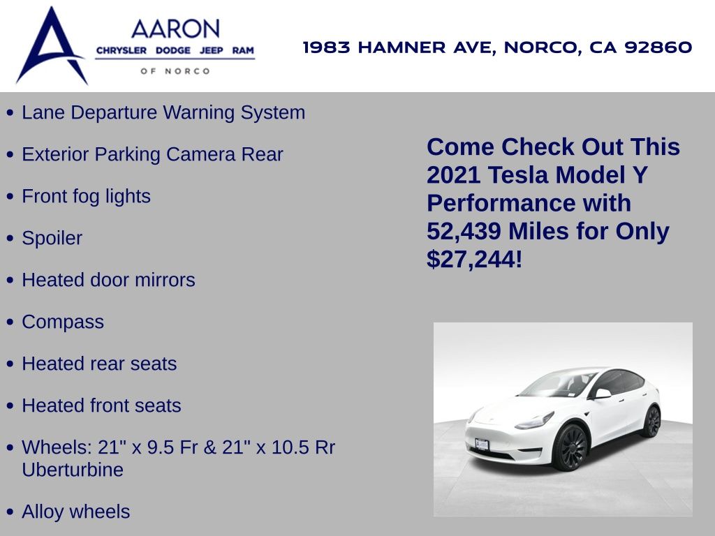 Priced below KBB Fair Purchase Price!NEW FILTERS, NEW WIPERS, Model Y Performance, 4D Sport Utility, 1-Speed Automatic, AWD, Alloy wheels, Compass, Dual front side impact airbags, Exterior Parking Camera Rear, Front dual zone A/C, Front fog lights, Heated door mirrors, Heated front seats, Heated rear seats, Knee airbag, Lane Departure Warning System, Memory seat, Navigation System, Overhead airbag, Power Liftgate, Premium Audio System, Spoiler, Wheels: 21" x 9.5 Fr & 21" x 10.5 Rr Uberturbine.Clean CARFAX.CARFAX One-Owner.