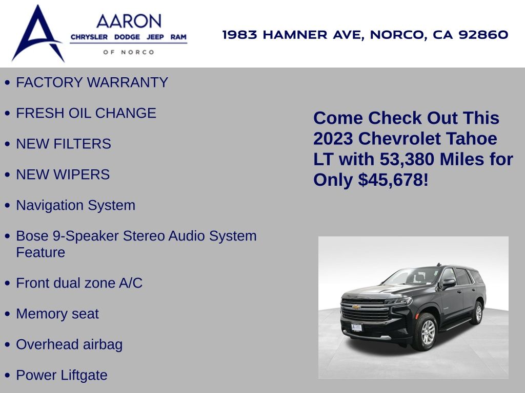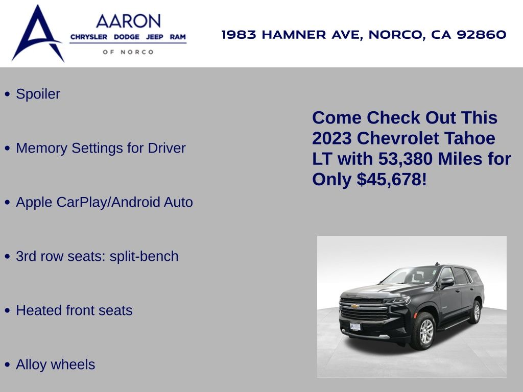 Priced below KBB Fair Purchase Price!FACTORY WARRANTY, FRESH OIL CHANGE, NEW FILTERS, NEW WIPERS, Tahoe LT, 4D Sport Utility, EcoTec3 5.3L V8, 10-Speed Automatic with Overdrive, 4WD, 3rd row seats: split-bench, Alloy wheels, Apple CarPlay/Android Auto, Bose 9-Speaker Stereo Audio System Feature, Front dual zone A/C, Heated front seats, Memory seat, Memory Settings for Driver, Navigation System, Overhead airbag, Power Liftgate, Spoiler.CARFAX One-Owner.