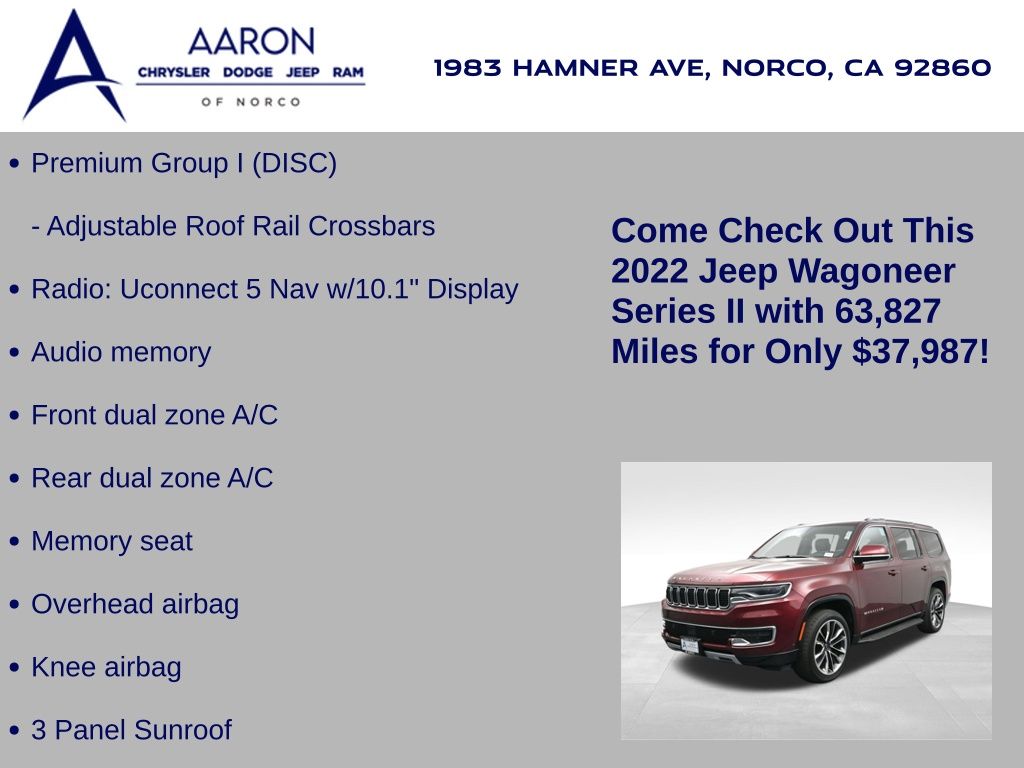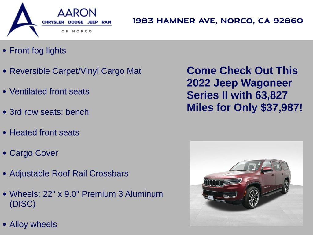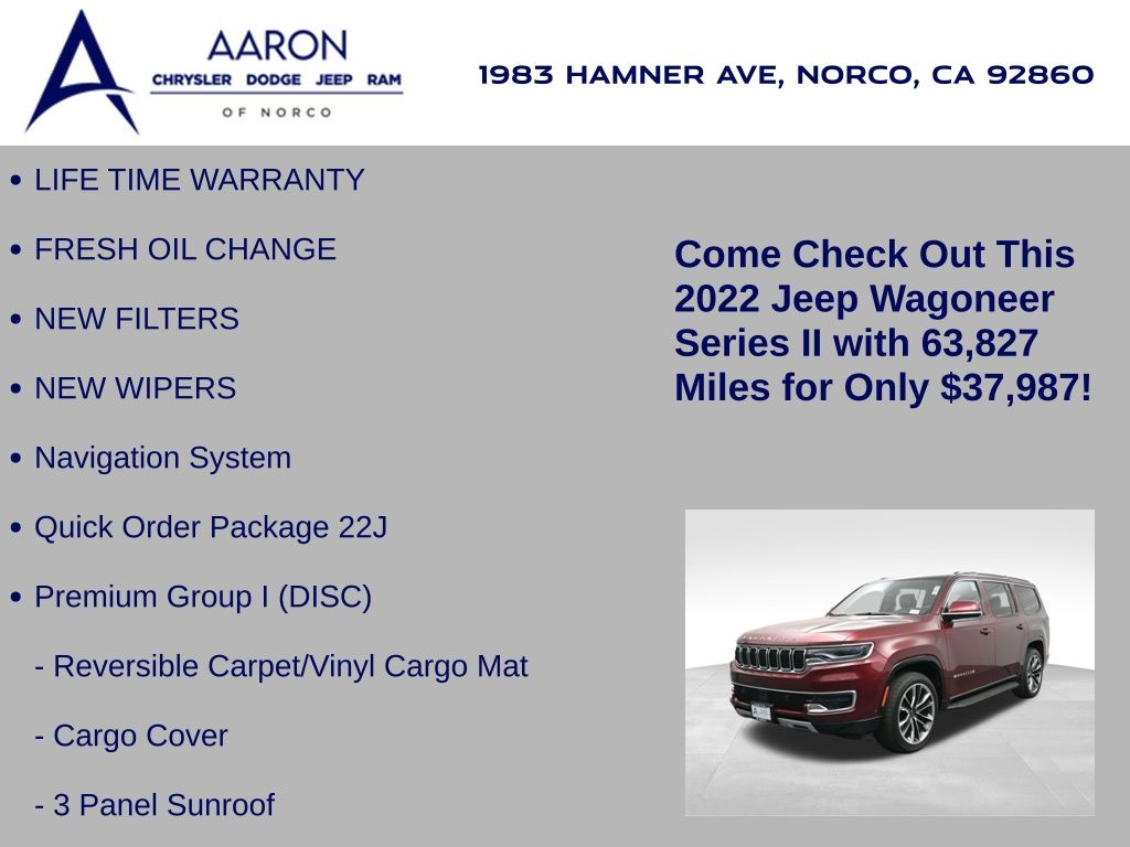 Priced below KBB Fair Purchase Price!LIFE TIME WARRANTY, FRESH OIL CHANGE, NEW FILTERS, NEW WIPERS, Wagoneer Series II, 4D Sport Utility, 5.7L V8, 8-Speed Automatic, 4WD, 3 Panel Sunroof, 3rd row seats: bench, Adjustable Roof Rail Crossbars, Alloy wheels, Audio memory, Cargo Cover, Front dual zone A/C, Front fog lights, Heated front seats, Knee airbag, Memory seat, Navigation System, Overhead airbag, Power Liftgate, Premium Group I (DISC), Quick Order Package 22J, Radio: Uconnect 5 Nav w/10.1" Display, Rear dual zone A/C, Reversible Carpet/Vinyl Cargo Mat, Ventilated front seats, Wheels: 22" x 9.0" Premium 3 Aluminum (DISC).Clean CARFAX.CARFAX One-Owner.