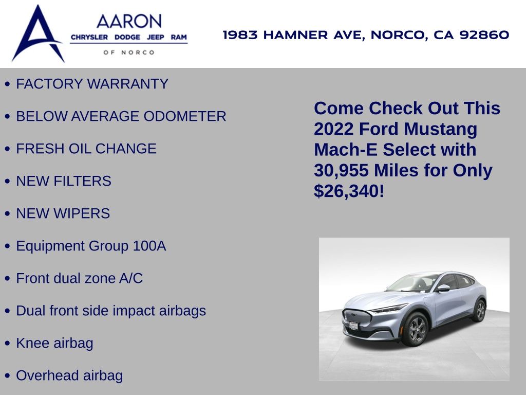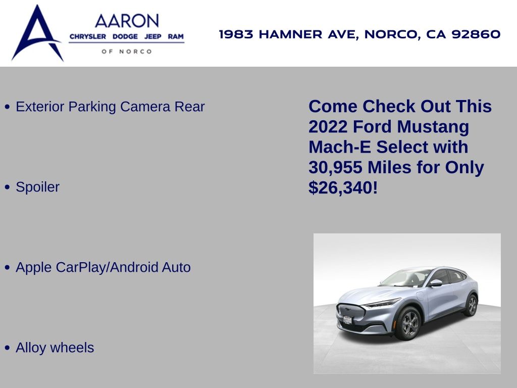 Priced below KBB Fair Purchase Price!FACTORY WARRANTY, BELOW AVERAGE ODOMETER, FRESH OIL CHANGE, NEW FILTERS, NEW WIPERS, Mustang Mach-E Select, 4D Sport Utility, Electric Motor, Single-Speed Automatic, RWD, Alloy wheels, Apple CarPlay/Android Auto, Dual front side impact airbags, Equipment Group 100A, Exterior Parking Camera Rear, Front dual zone A/C, Knee airbag, Overhead airbag, Spoiler.Clean CARFAX.