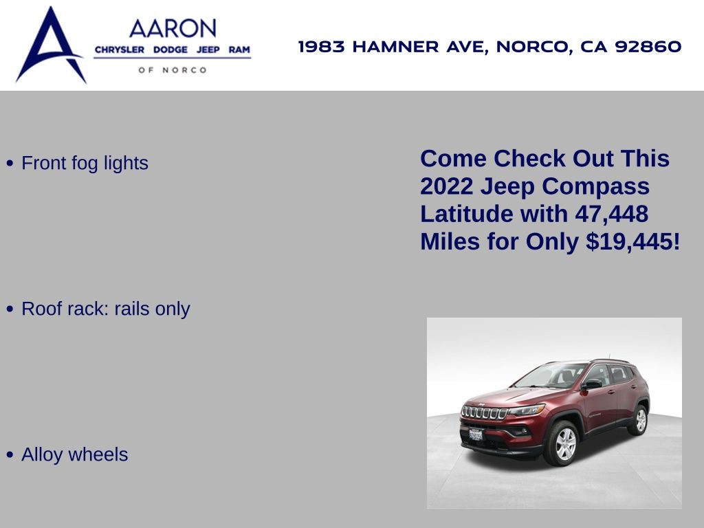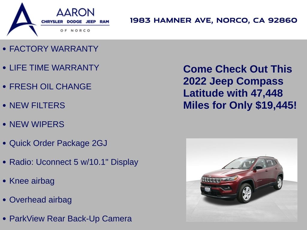 Priced below KBB Fair Purchase Price!FACTORY WARRANTY, LIFE TIME WARRANTY, FRESH OIL CHANGE, NEW FILTERS, NEW WIPERS, Compass Latitude, 4D Sport Utility, 2.4L I4, 9-Speed 948TE Automatic, 4WD, Alloy wheels, Front fog lights, Knee airbag, Overhead airbag, ParkView Rear Back-Up Camera, Quick Order Package 2GJ, Radio: Uconnect 5 w/10.1" Display, Roof rack: rails only.Clean CARFAX.CARFAX One-Owner.
