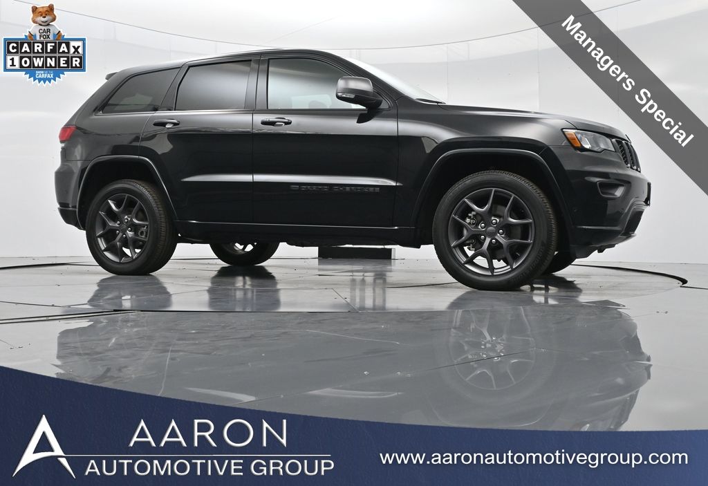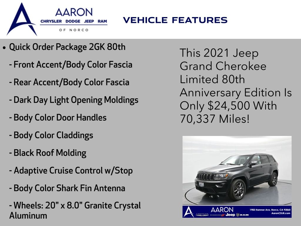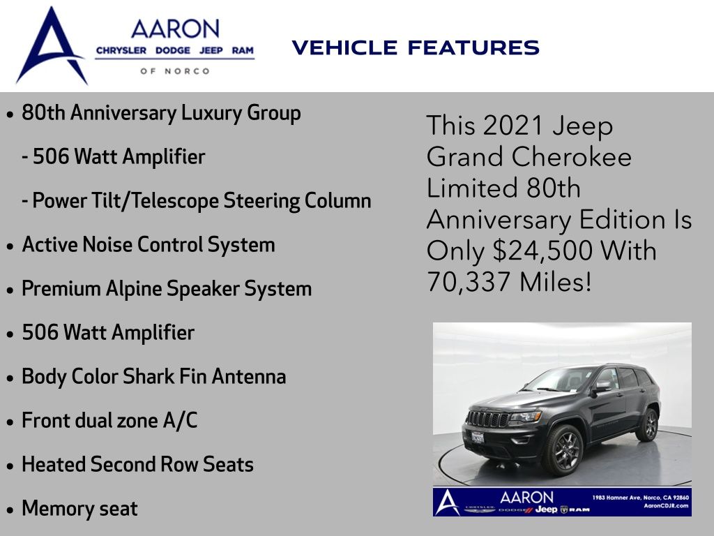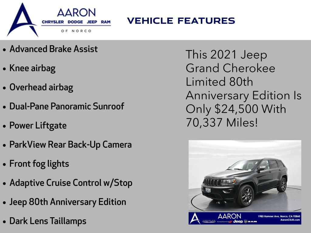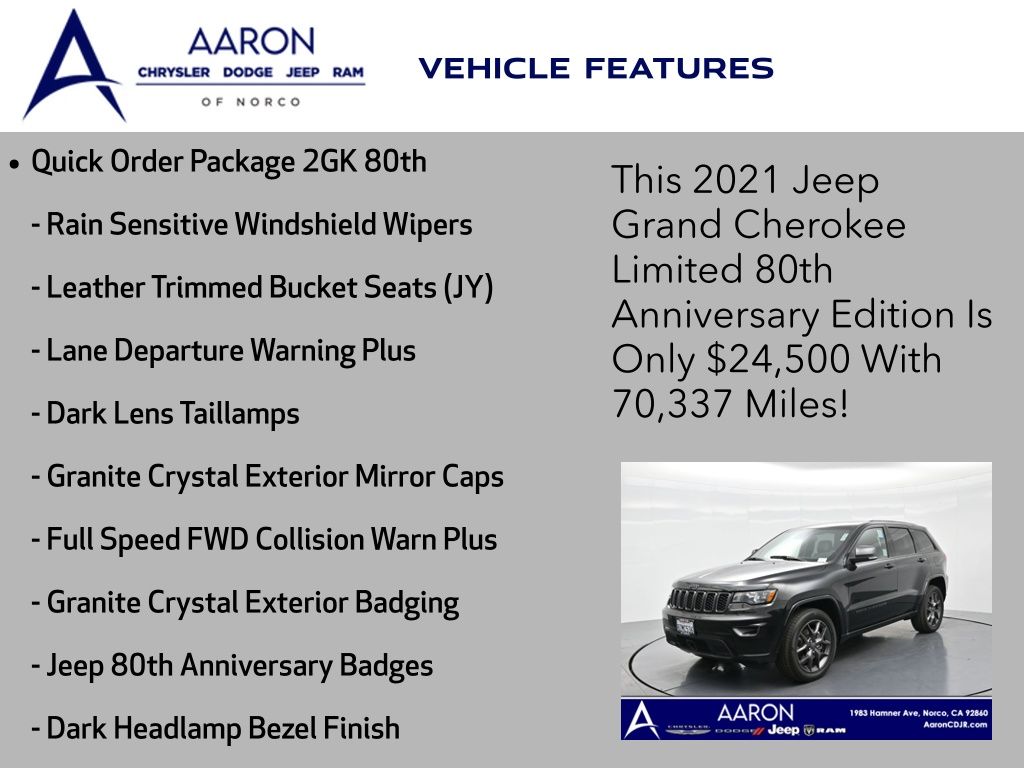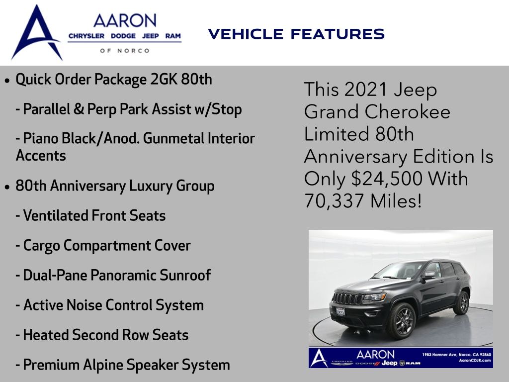 Celebrate iconic Jeep heritage in premium style with this 2021 Jeep Grand Cherokee 80th Anniversary Edition 4x4, a special edition SUV built to honor 80 years of off-road capability and luxury refinement. With 70,337 miles, a 1-owner Carfax history, no accidents reported, and consistent service records, this well-maintained vehicle blends comfort, safety, and rugged Jeep DNA into one standout package. Powered by the trusted 3.6L Pentastar V6 engine paired with an efficient 8-speed automatic transmission, this Grand Cherokee delivers strong performance and confident capability while achieving an EPA-estimated 21 MPG combined (18 city / 25 highway). Finished in premium Diamond Black Crystal Pearl-Coat Paint, this 4WD model features signature 80th Anniversary badging, granite crystal metallic accents, 20-inch granite painted aluminum wheels, dark lens taillamps, and body-color mirrors, bumpers, and grille for a sleek, upscale look. Inside, youll find an elegant black leather-trimmed interior with light tungsten accent stitching, power-adjustable heated front seats, heated steering wheel, dual-zone climate control, memory settings, power lift-gate, and a full suite of comfort and convenience features. Technology is abundant with Uconnect 8.4-inch touchscreen display, GPS navigation, Apple CarPlay and Android Auto, SiriusXM, and premium Alpine 9-speaker sound system with subwoofer. Safety is prioritized with Blind Spot Monitoring, Rear Cross Path Detection, ParkSense front and rear park assist, Full-Speed Forward Collision Warning Plus, Adaptive Cruise Control with Stop, Lane Departure Warning Plus, Advanced Brake Assist, and a rear backup camera. This 80th Anniversary Edition also includes a dual-pane panoramic sunroof, remote start, universal garage door opener, Selec-Terrain traction management system, and power-folding heated side mirrors with memory. Backed by Jeeps 5-year/60,000-mile powertrain warranty, this Grand Cherokee delivers capability, class, and confidence for all of life's journeys. Whether you're looking for refined everyday comfort or a rugged trail-capable SUV with tech-savvy sophistication, this rare 80th Anniversary Edition is the perfect fit. Contact us today to schedule your test drive and secure a piece of Jeep history before its gone.