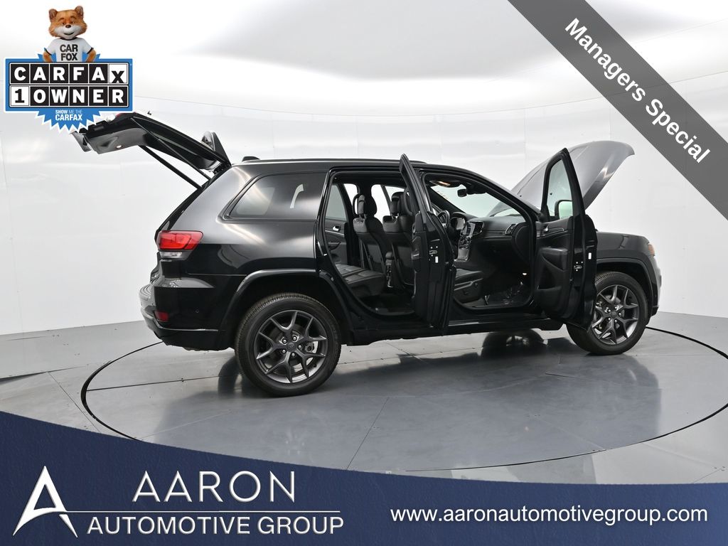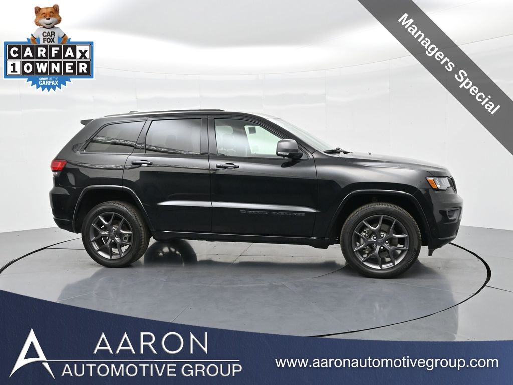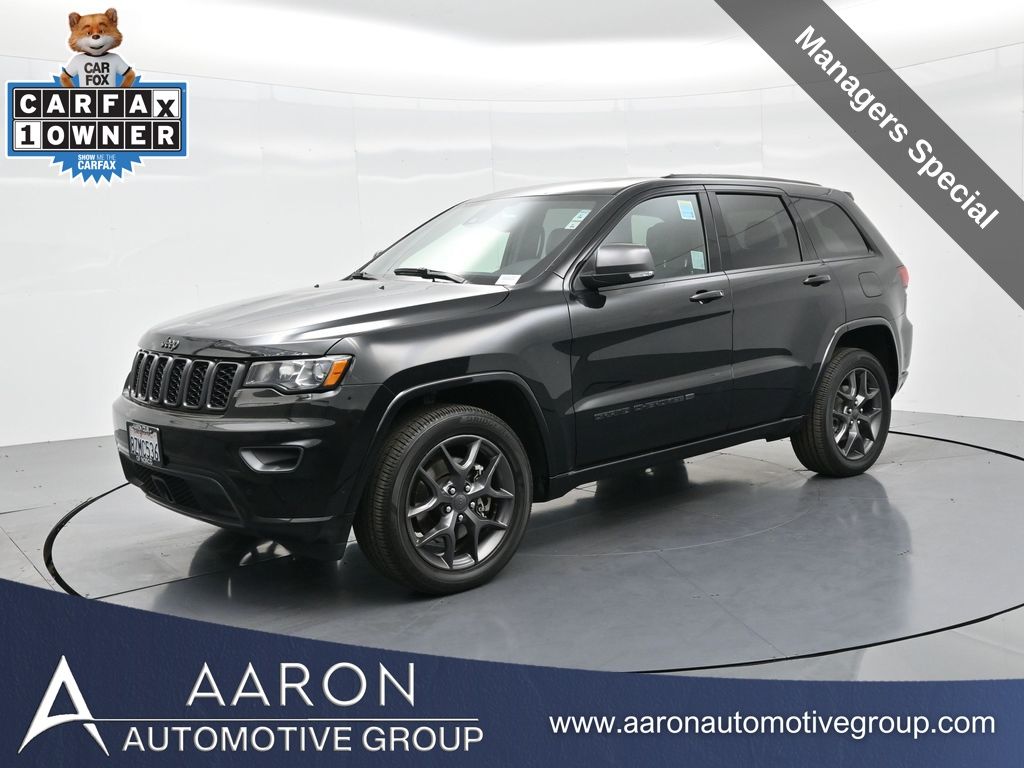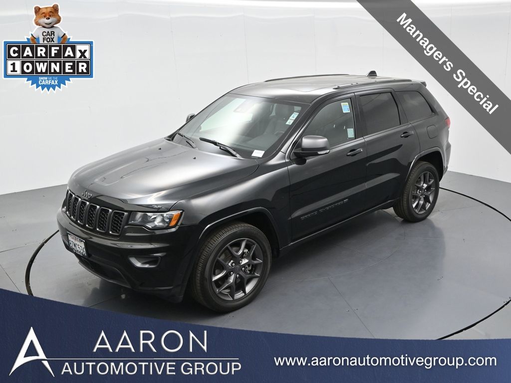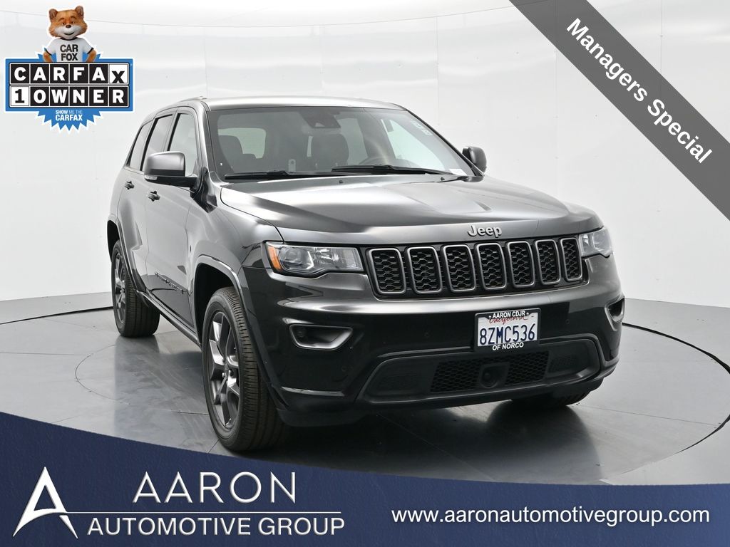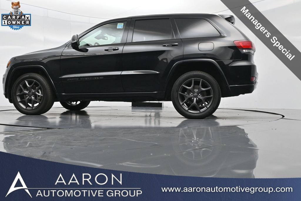 Celebrate iconic Jeep heritage in premium style with this 2021 Jeep Grand Cherokee 80th Anniversary Edition 4x4, a special edition SUV built to honor 80 years of off-road capability and luxury refinement. With 70,337 miles, a 1-owner Carfax history, no accidents reported, and consistent service records, this well-maintained vehicle blends comfort, safety, and rugged Jeep DNA into one standout package. Powered by the trusted 3.6L Pentastar V6 engine paired with an efficient 8-speed automatic transmission, this Grand Cherokee delivers strong performance and confident capability while achieving an EPA-estimated 21 MPG combined (18 city / 25 highway). Finished in premium Diamond Black Crystal Pearl-Coat Paint, this 4WD model features signature 80th Anniversary badging, granite crystal metallic accents, 20-inch granite painted aluminum wheels, dark lens taillamps, and body-color mirrors, bumpers, and grille for a sleek, upscale look. Inside, youll find an elegant black leather-trimmed interior with light tungsten accent stitching, power-adjustable heated front seats, heated steering wheel, dual-zone climate control, memory settings, power lift-gate, and a full suite of comfort and convenience features. Technology is abundant with Uconnect 8.4-inch touchscreen display, GPS navigation, Apple CarPlay and Android Auto, SiriusXM, and premium Alpine 9-speaker sound system with subwoofer. Safety is prioritized with Blind Spot Monitoring, Rear Cross Path Detection, ParkSense front and rear park assist, Full-Speed Forward Collision Warning Plus, Adaptive Cruise Control with Stop, Lane Departure Warning Plus, Advanced Brake Assist, and a rear backup camera. This 80th Anniversary Edition also includes a dual-pane panoramic sunroof, remote start, universal garage door opener, Selec-Terrain traction management system, and power-folding heated side mirrors with memory. Backed by Jeeps 5-year/60,000-mile powertrain warranty, this Grand Cherokee delivers capability, class, and confidence for all of life's journeys. Whether you're looking for refined everyday comfort or a rugged trail-capable SUV with tech-savvy sophistication, this rare 80th Anniversary Edition is the perfect fit. Contact us today to schedule your test drive and secure a piece of Jeep history before its gone.