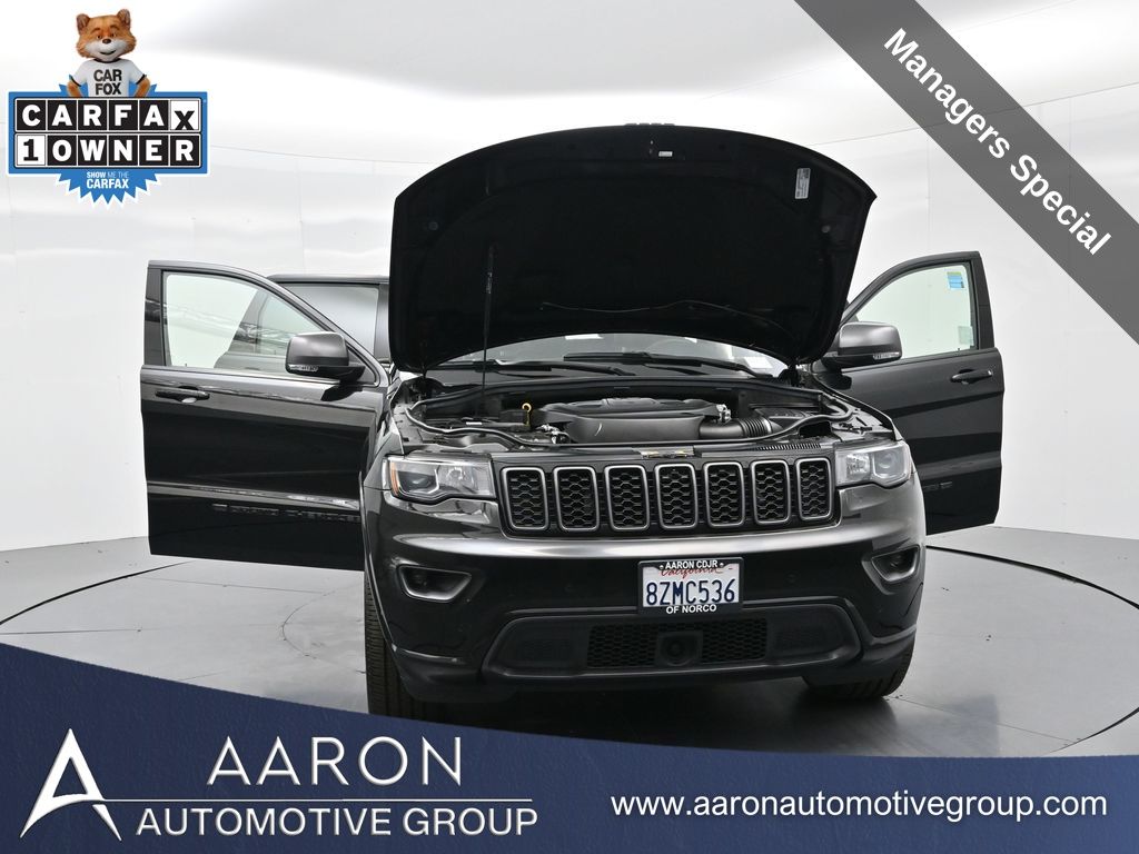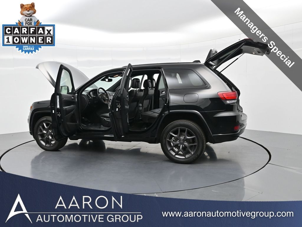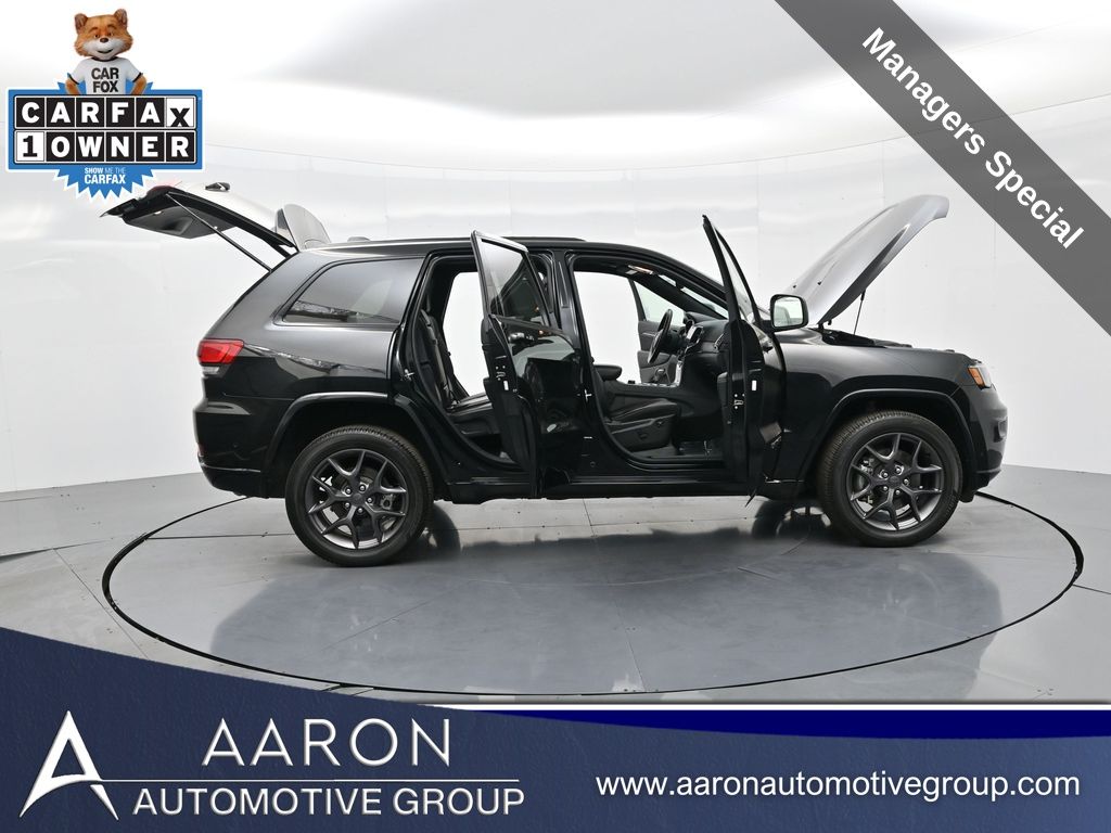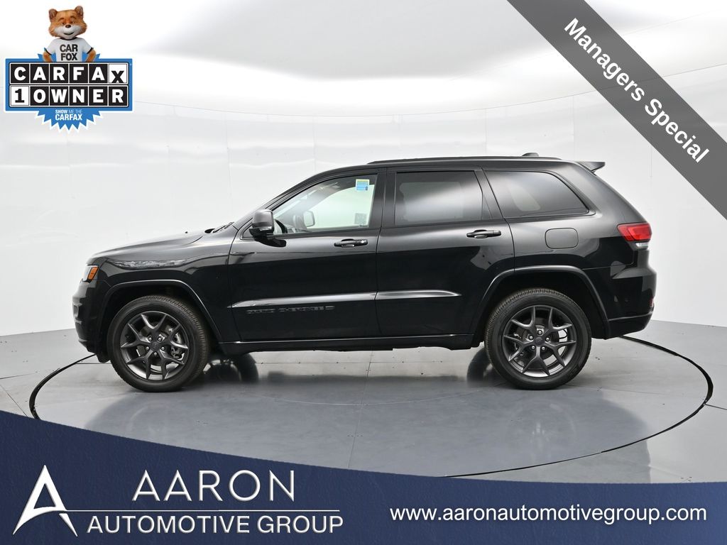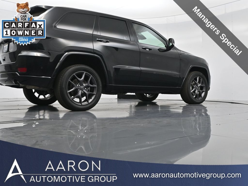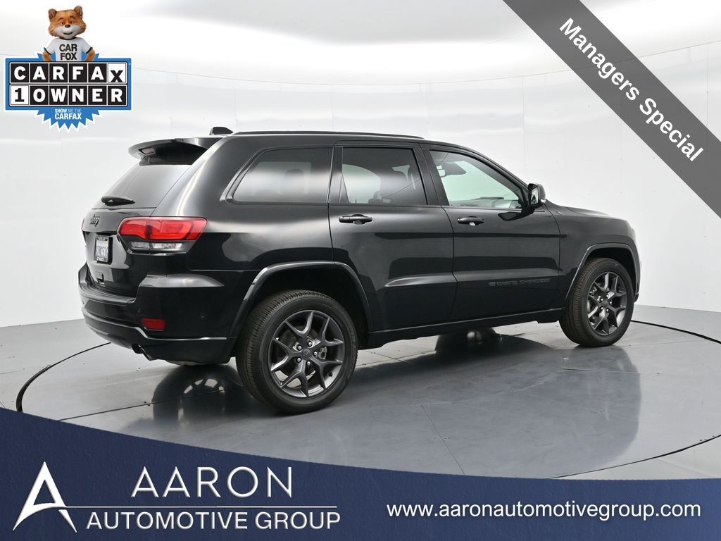 Celebrate iconic Jeep heritage in premium style with this 2021 Jeep Grand Cherokee 80th Anniversary Edition 4x4, a special edition SUV built to honor 80 years of off-road capability and luxury refinement. With 70,337 miles, a 1-owner Carfax history, no accidents reported, and consistent service records, this well-maintained vehicle blends comfort, safety, and rugged Jeep DNA into one standout package. Powered by the trusted 3.6L Pentastar V6 engine paired with an efficient 8-speed automatic transmission, this Grand Cherokee delivers strong performance and confident capability while achieving an EPA-estimated 21 MPG combined (18 city / 25 highway). Finished in premium Diamond Black Crystal Pearl-Coat Paint, this 4WD model features signature 80th Anniversary badging, granite crystal metallic accents, 20-inch granite painted aluminum wheels, dark lens taillamps, and body-color mirrors, bumpers, and grille for a sleek, upscale look. Inside, youll find an elegant black leather-trimmed interior with light tungsten accent stitching, power-adjustable heated front seats, heated steering wheel, dual-zone climate control, memory settings, power lift-gate, and a full suite of comfort and convenience features. Technology is abundant with Uconnect 8.4-inch touchscreen display, GPS navigation, Apple CarPlay and Android Auto, SiriusXM, and premium Alpine 9-speaker sound system with subwoofer. Safety is prioritized with Blind Spot Monitoring, Rear Cross Path Detection, ParkSense front and rear park assist, Full-Speed Forward Collision Warning Plus, Adaptive Cruise Control with Stop, Lane Departure Warning Plus, Advanced Brake Assist, and a rear backup camera. This 80th Anniversary Edition also includes a dual-pane panoramic sunroof, remote start, universal garage door opener, Selec-Terrain traction management system, and power-folding heated side mirrors with memory. Backed by Jeeps 5-year/60,000-mile powertrain warranty, this Grand Cherokee delivers capability, class, and confidence for all of life's journeys. Whether you're looking for refined everyday comfort or a rugged trail-capable SUV with tech-savvy sophistication, this rare 80th Anniversary Edition is the perfect fit. Contact us today to schedule your test drive and secure a piece of Jeep history before its gone.